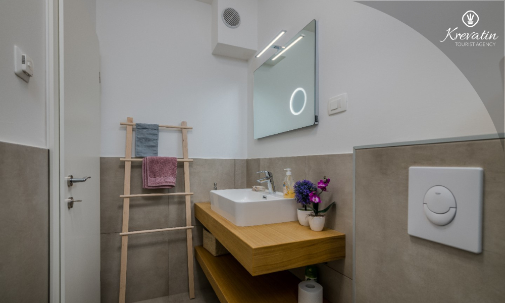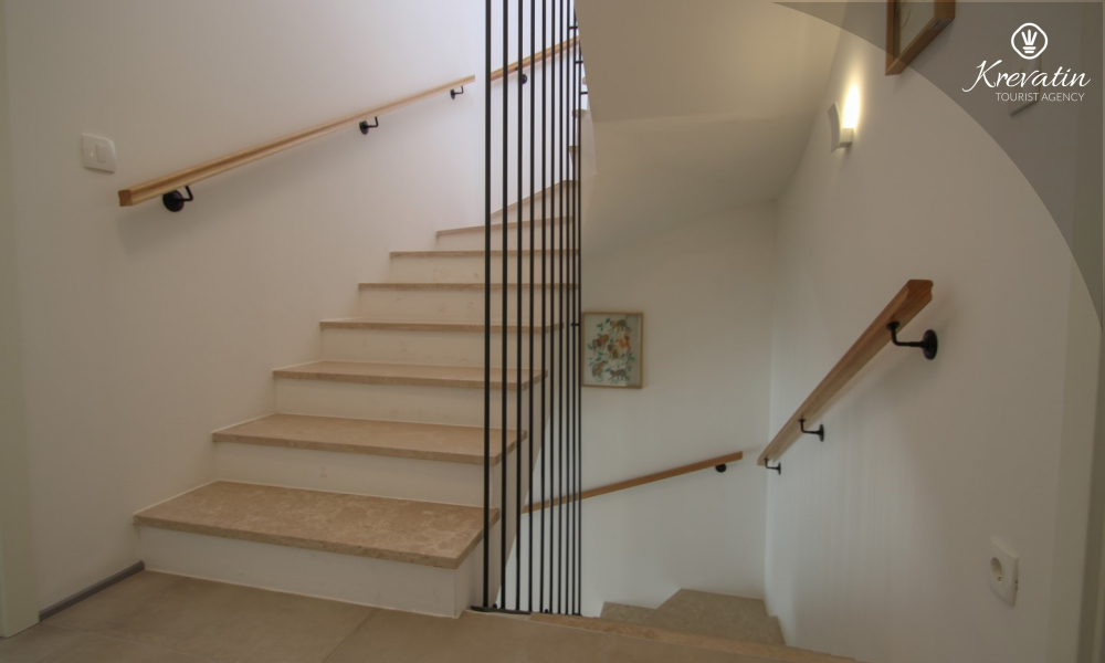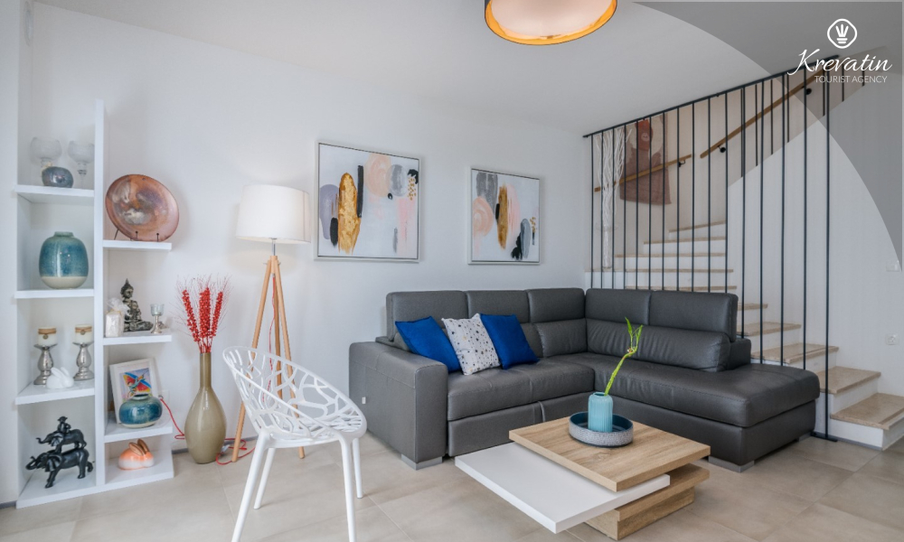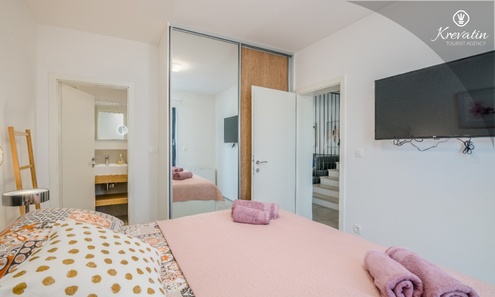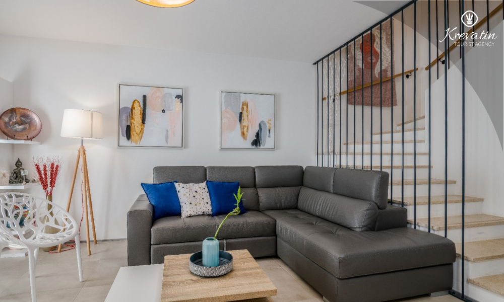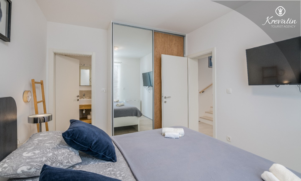 Im Erdgeschoss befindet sich ein Wohnzimmer mit Zugang zur Terrasse, ideal für entspannte Abende oder den Morgenkaffee. Die Küche mit Essbereich ist mit allem ausgestattet, was Sie für die Zubereitung einfacher Mahlzeiten benötigen. Im Erdgeschoss befindet sich außerdem ein Doppelzimmer mit eigenem Bad.