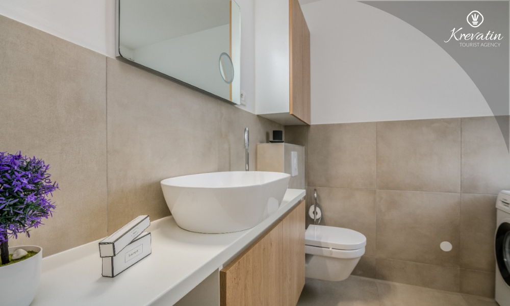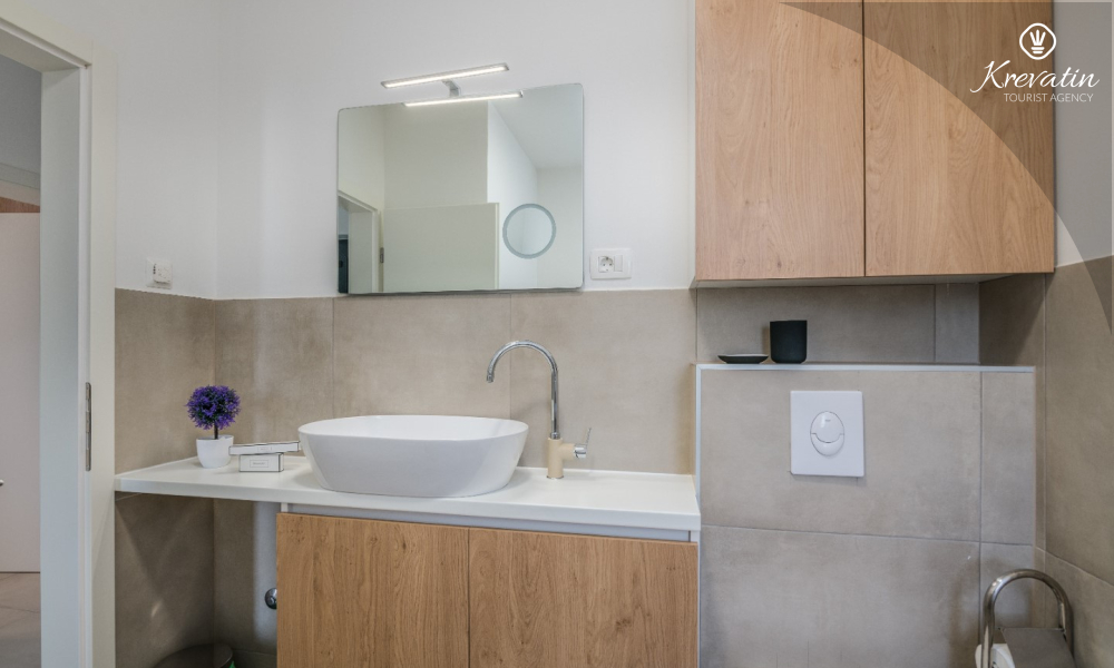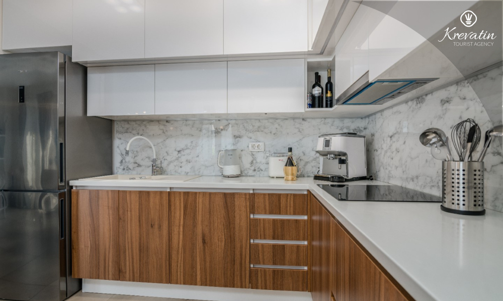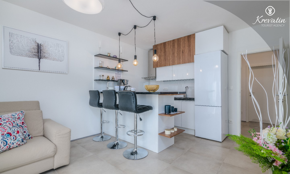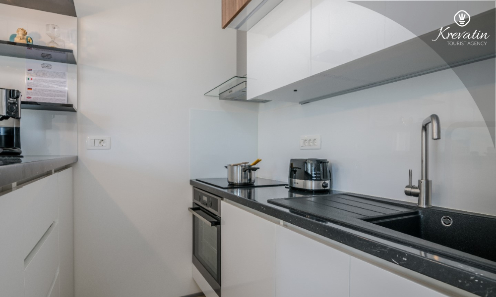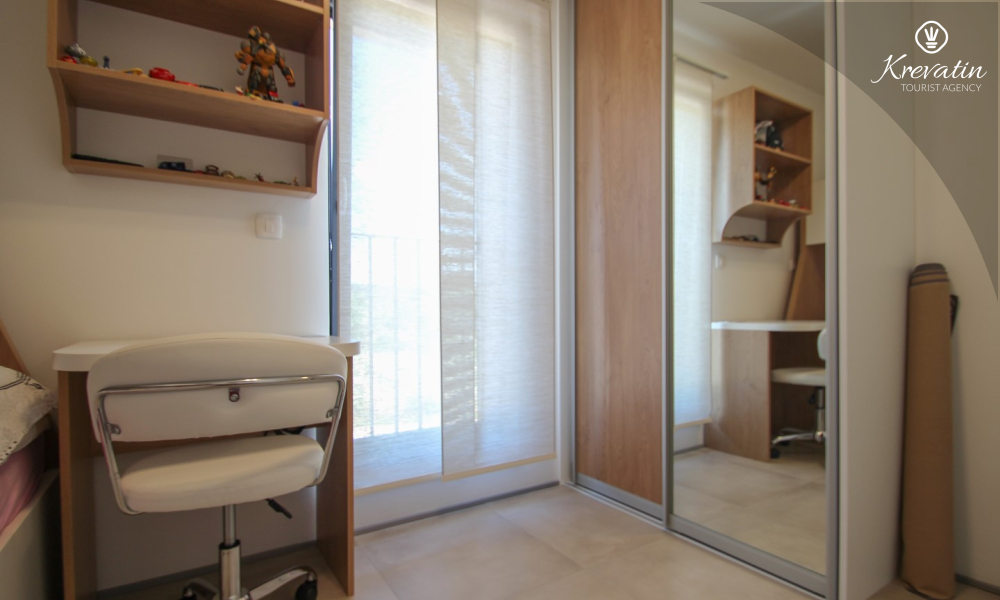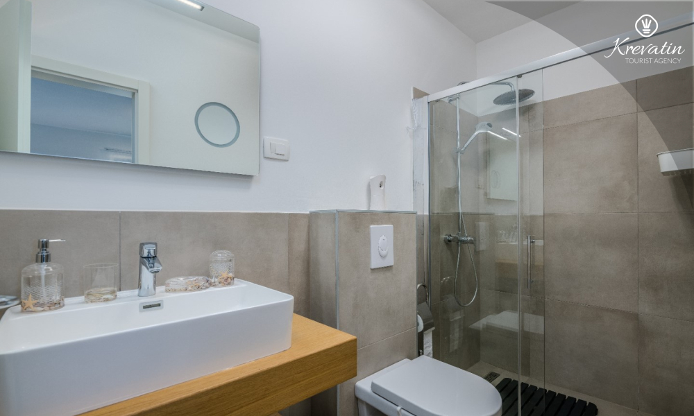 Im Erdgeschoss befindet sich ein Wohnzimmer mit Zugang zur Terrasse, ideal für entspannte Abende oder den Morgenkaffee. Die Küche mit Essbereich ist mit allem ausgestattet, was Sie für die Zubereitung einfacher Mahlzeiten benötigen. Im Erdgeschoss befindet sich außerdem ein Doppelzimmer mit eigenem Bad.