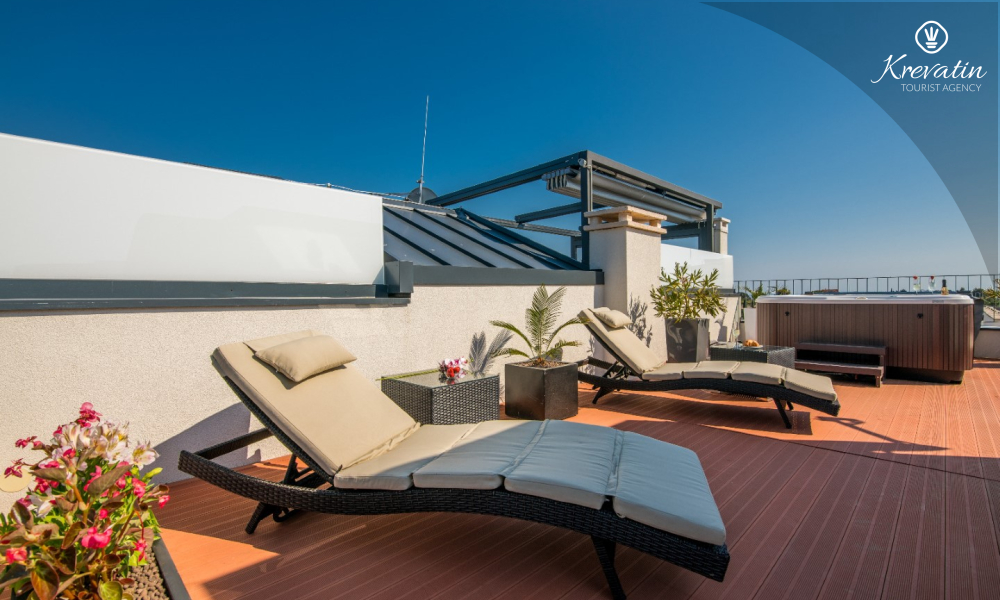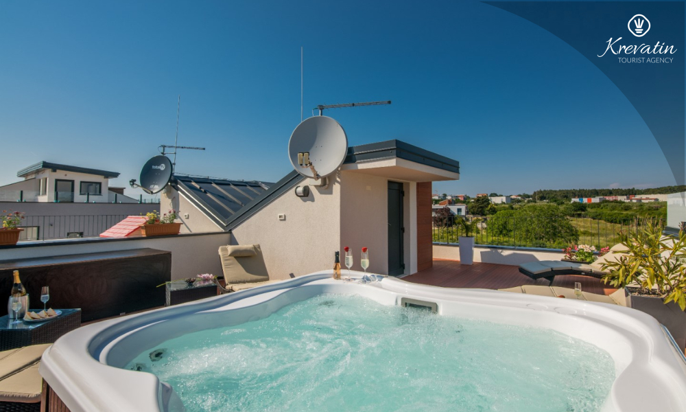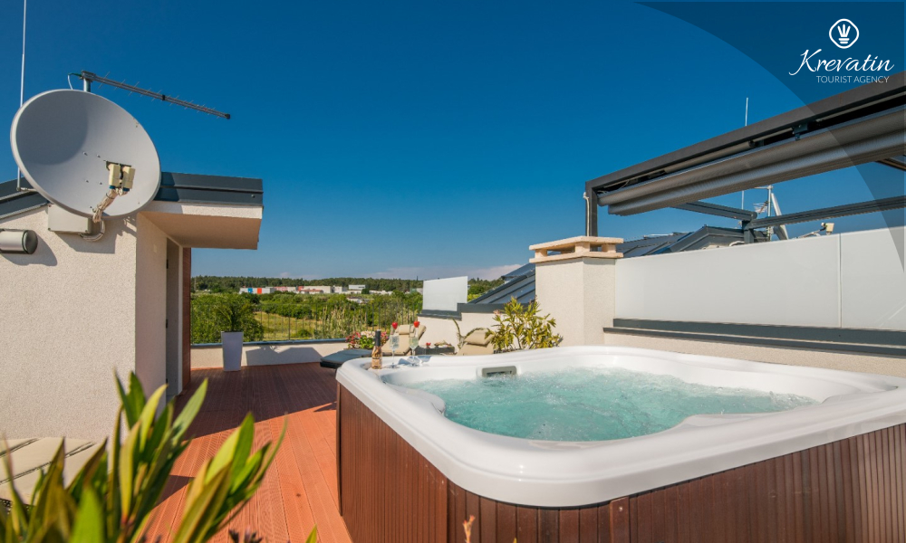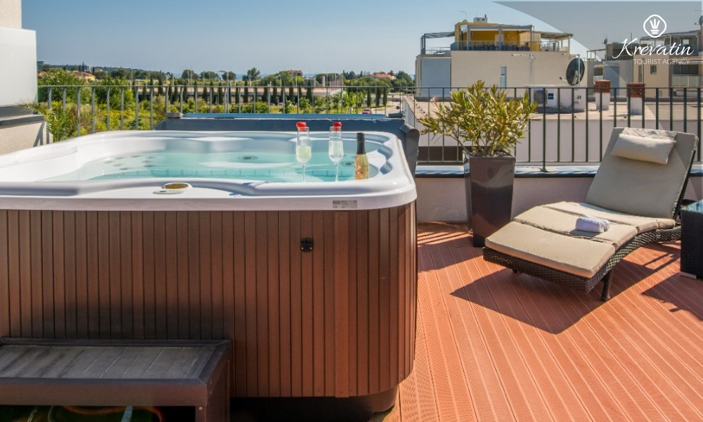 Im ersten Stock befinden sich zwei weitere Schlafzimmer – eines mit Doppelbett und eigenem Bad, das andere mit Etagenbett. Darüber hinaus gibt es im ersten Stock eine zweite Küche und ein Badezimmer mit Badewanne. Auf der Dachterrasse sorgen ein Whirlpool und Sonnenliegen für zusätzlichen Komfort.
