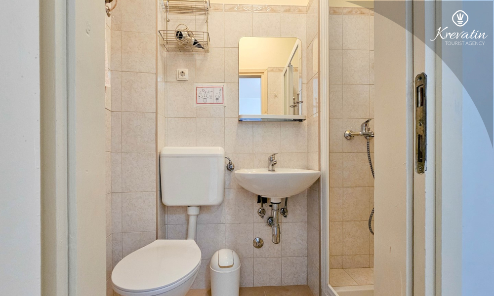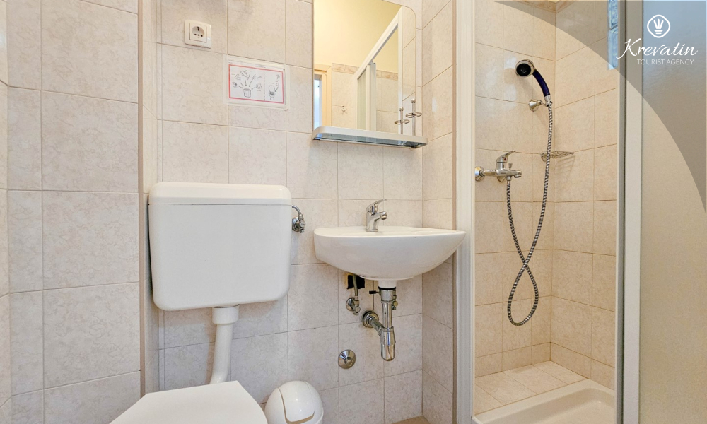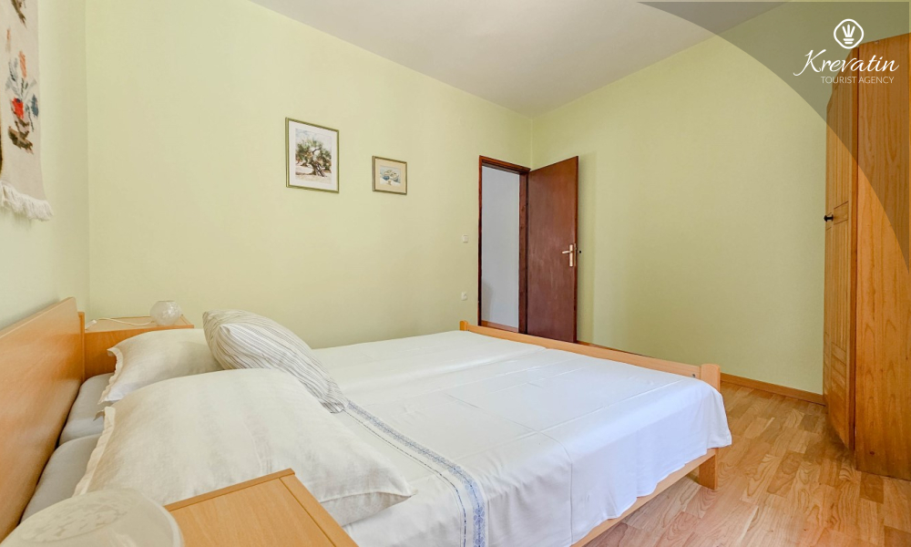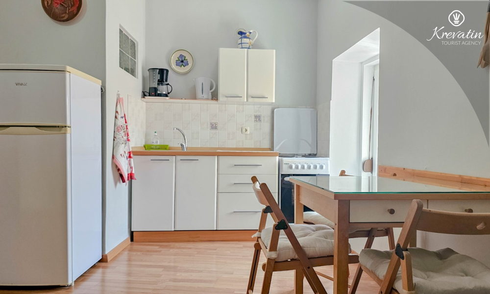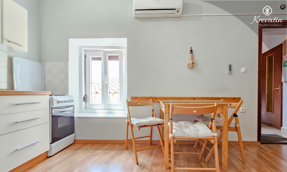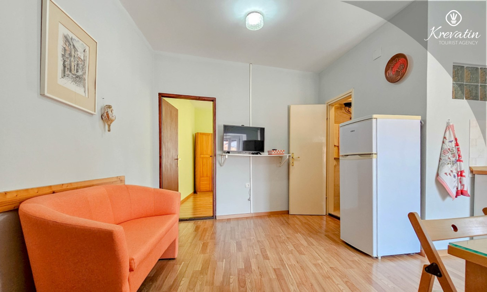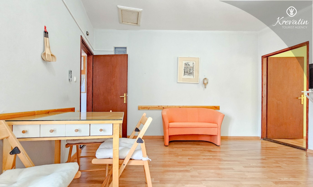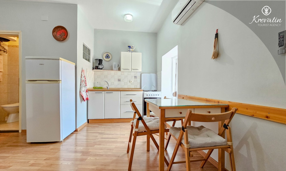 Das Apartment besteht aus einem Wohnzimmer mit Küche, einem Schlafzimmer mit Doppelbett und einem Badezimmer mit Dusche. Im Erdgeschoss befindet sich eine Gemeinschaftsterrasse mit Tisch und Stühlen – ideal für den Morgenkaffee oder ein Glas Wein am Abend.