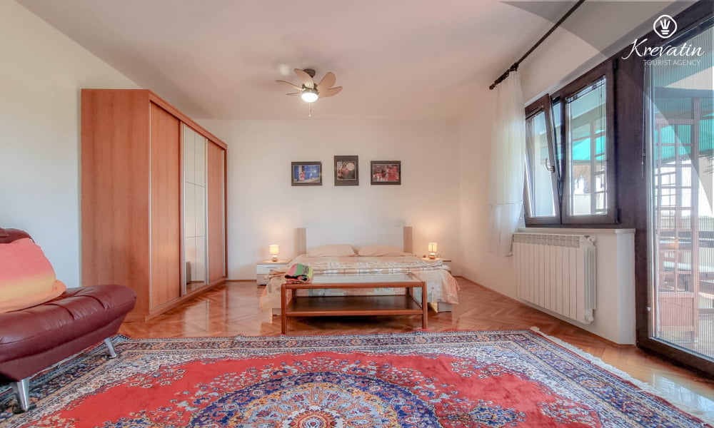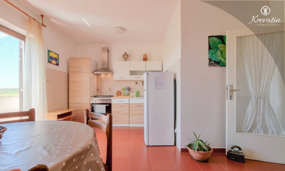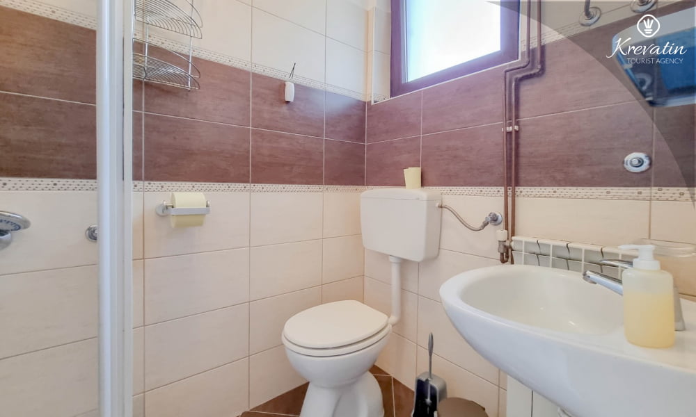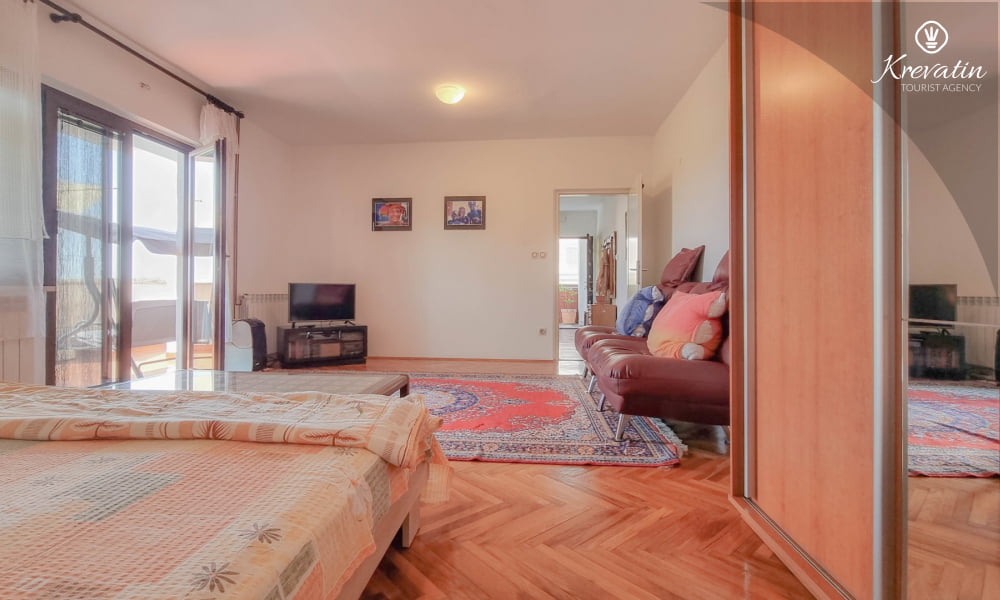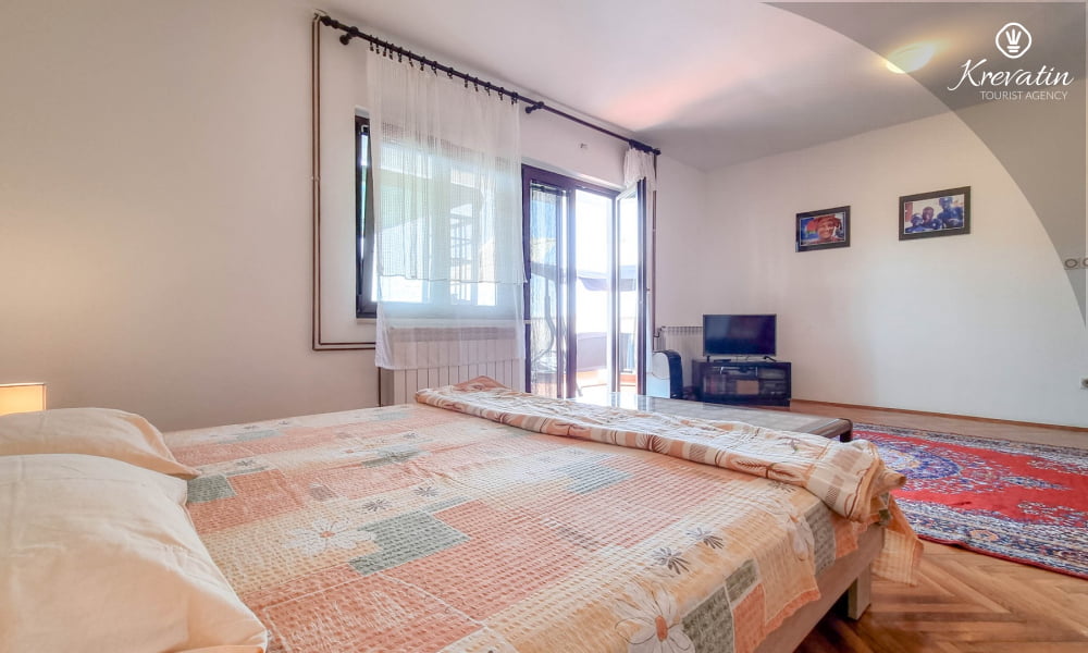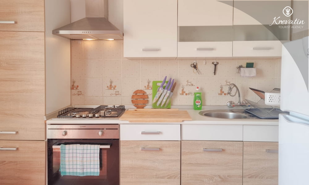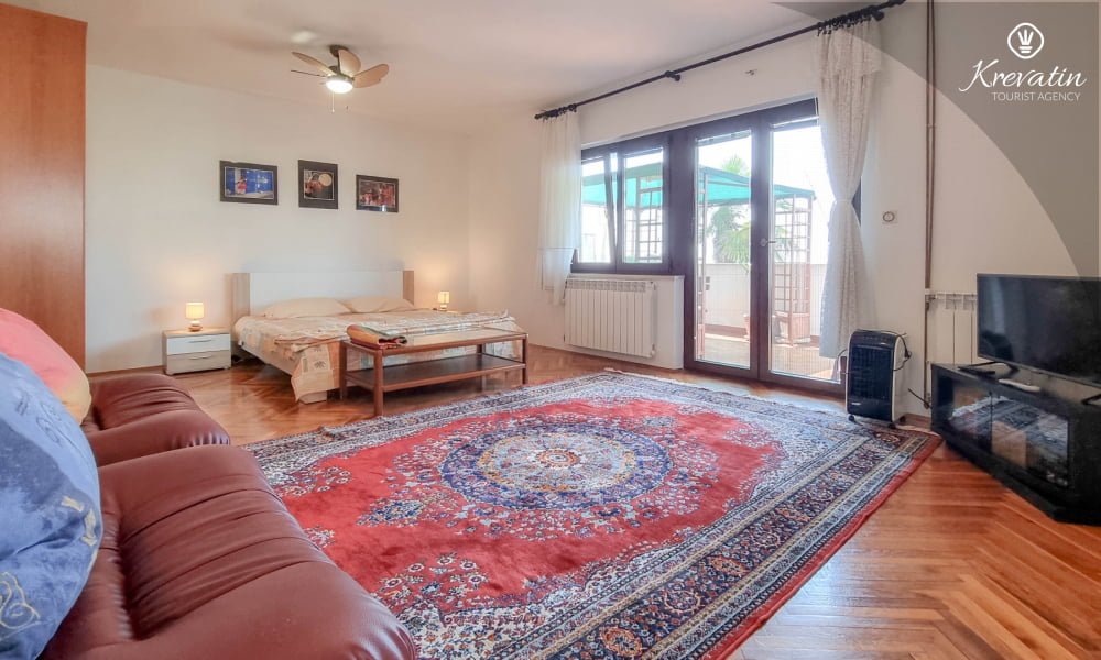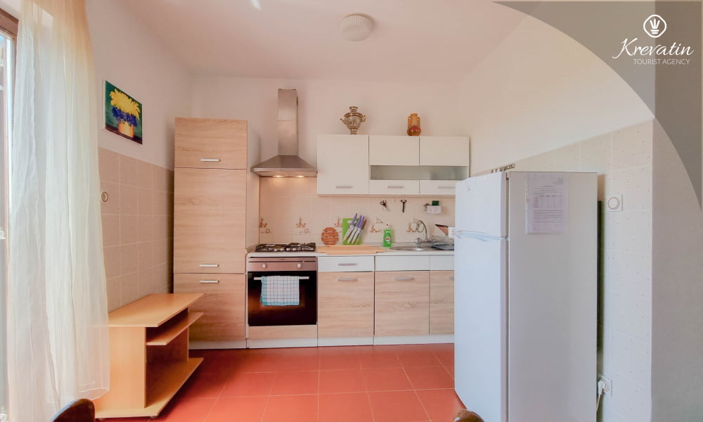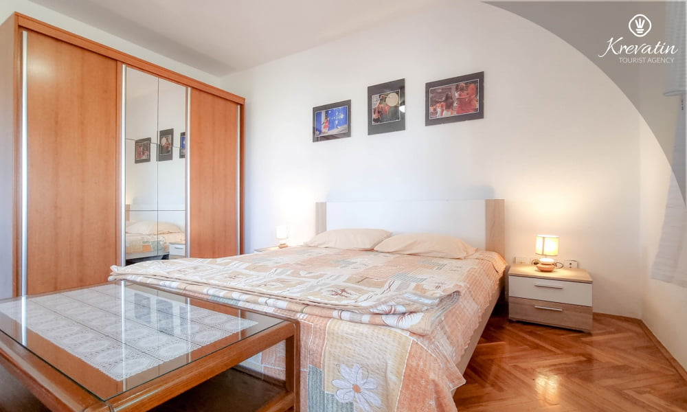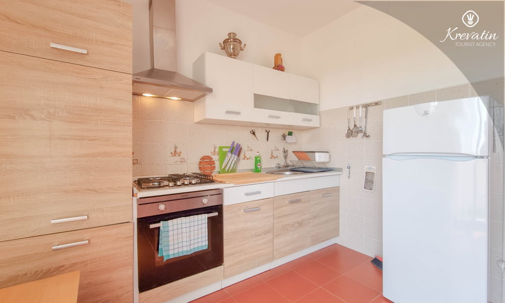 Es besteht aus einem Schlafzimmer mit einem Doppelbett und einem Zustellbett, einer Küche mit Essbereich und grundlegender Ausstattung sowie einem Badezimmer mit Dusche und WC. Ein Balkon mit Meerblick lädt zum Verweilen im Freien ein.Sat-TV, WLAN und Bettwäsche sind im Preis inbegriffen. Haustiere sind gegen eine zusätzliche Gebühr erlaubt, dürfen aber nicht im Bett schlafen.