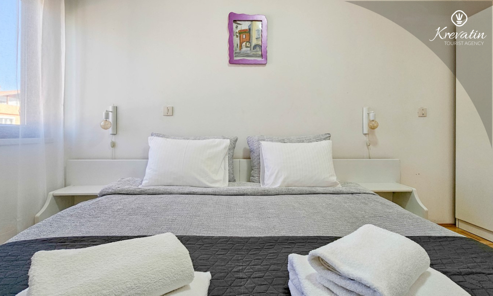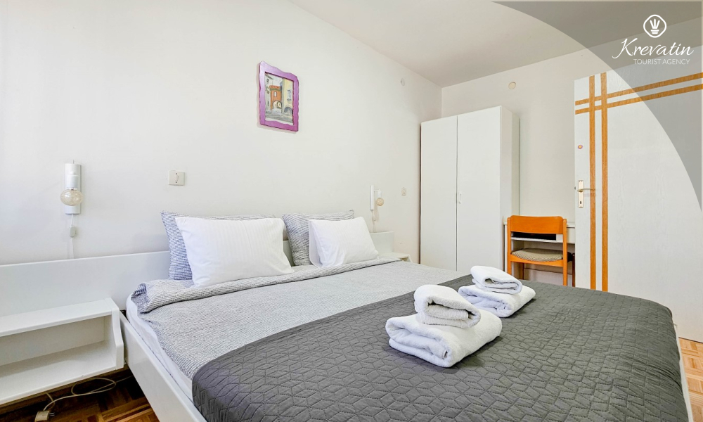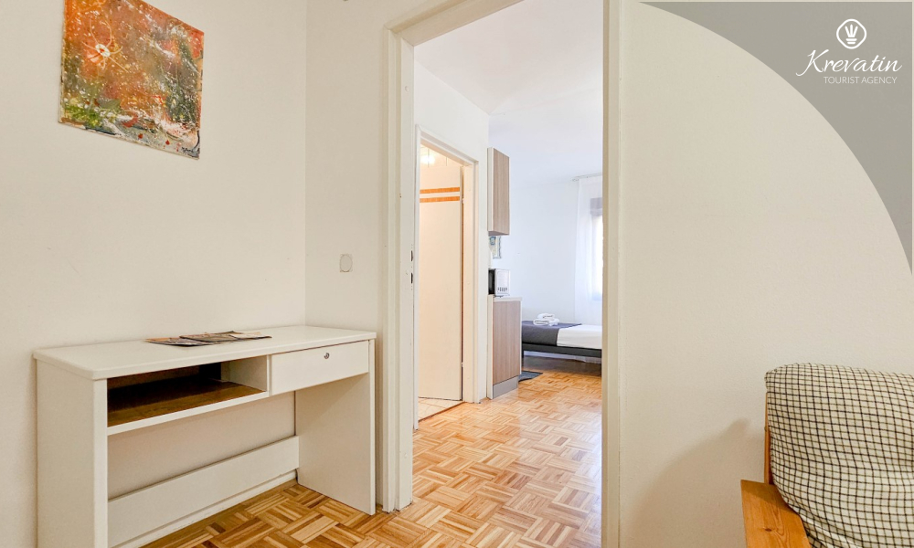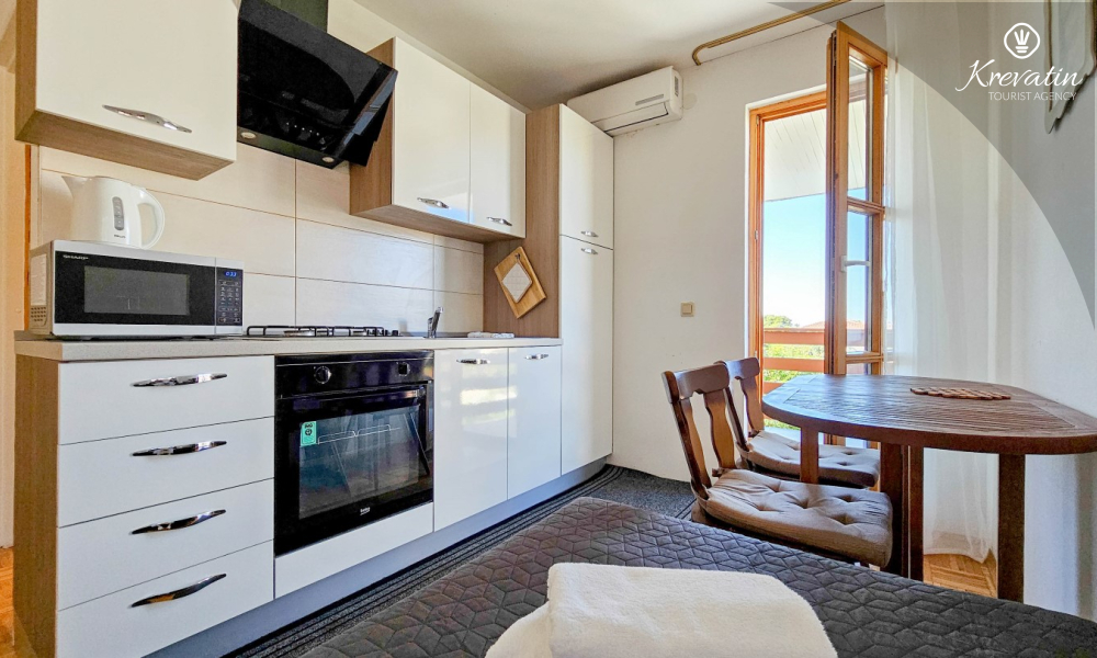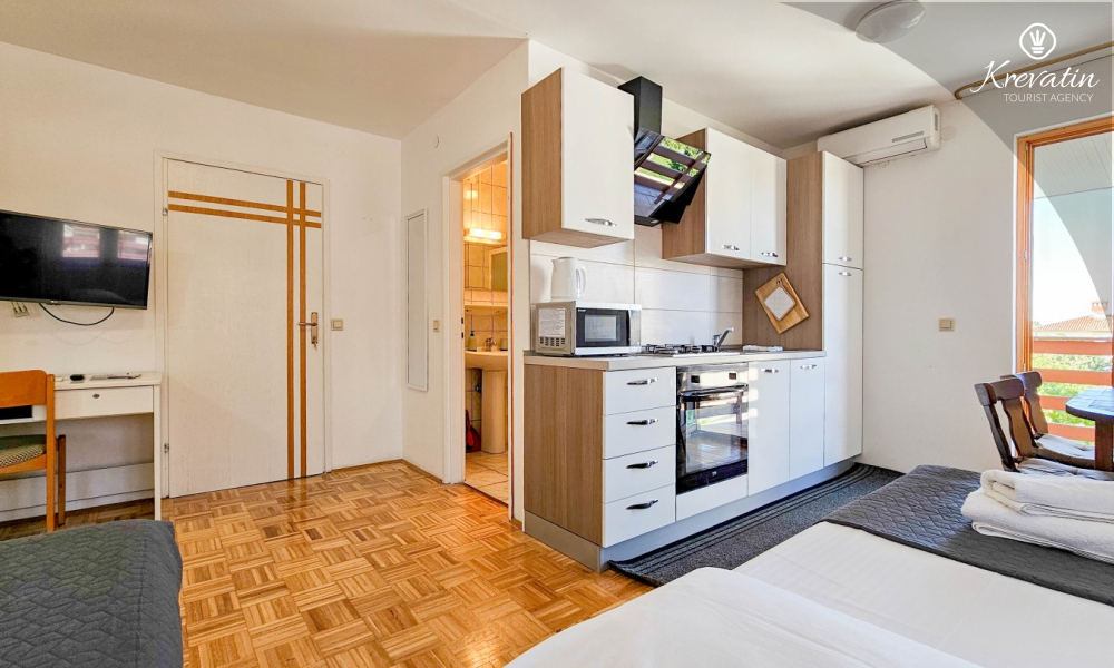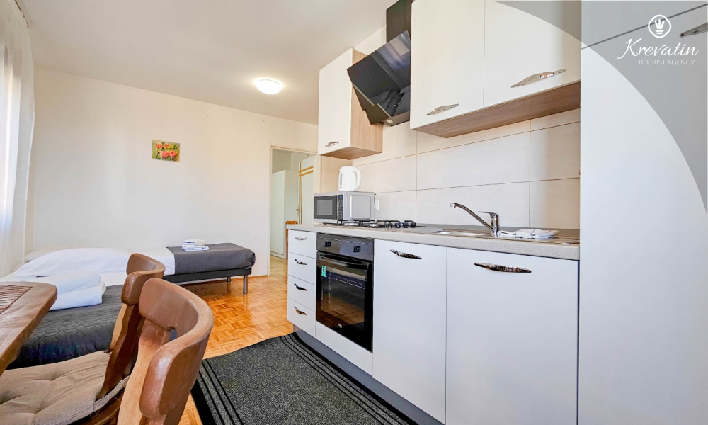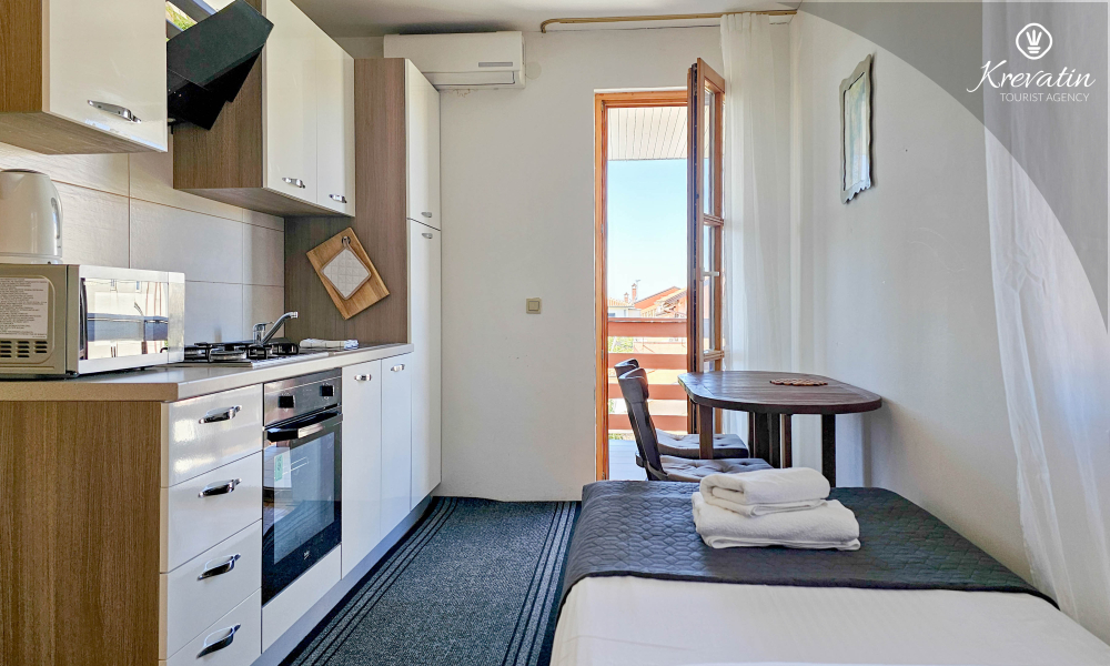 Es besteht aus einem Schlafzimmer mit Doppelbett, einer Küchenzeile mit Zustellbett und einem Badezimmer mit Dusche. Die Küche ist mit allem Nötigen zur Zubereitung von Mahlzeiten ausgestattet. Vom Balkon mit Blick auf die Stadt lässt es sich ideal morgens den Kaffee genießen oder abends entspannen.