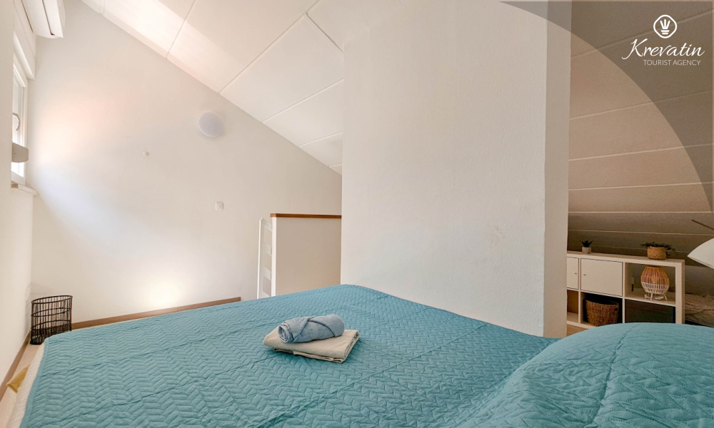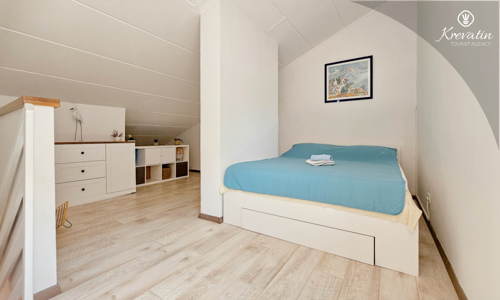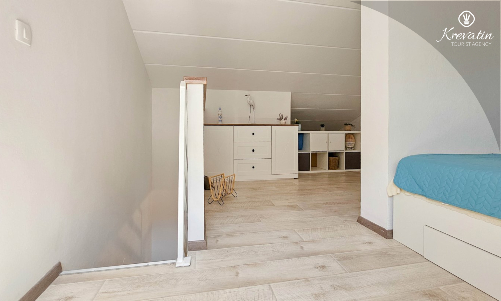 Im ersten Stock befindet sich ein geräumiges Schlafzimmer mit einem bequemen Doppelbett, das Ihnen nach einem Tag voller Erkundungen der Umgebung einen erholsamen Schlaf ermöglicht. Das Apartment ist mit einer Klimaanlage ausgestattet, damit Sie sich an heißen Sommertagen wohlfühlen. Darüber hinaus haben Sie Zugang zum Internet um mit der Welt in Verbindung zu bleiben.