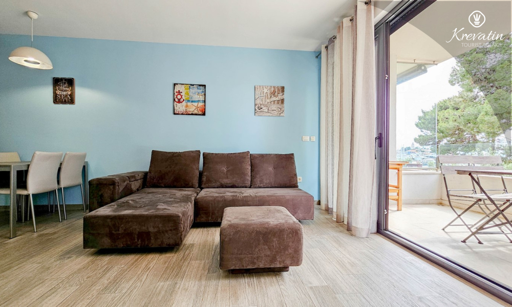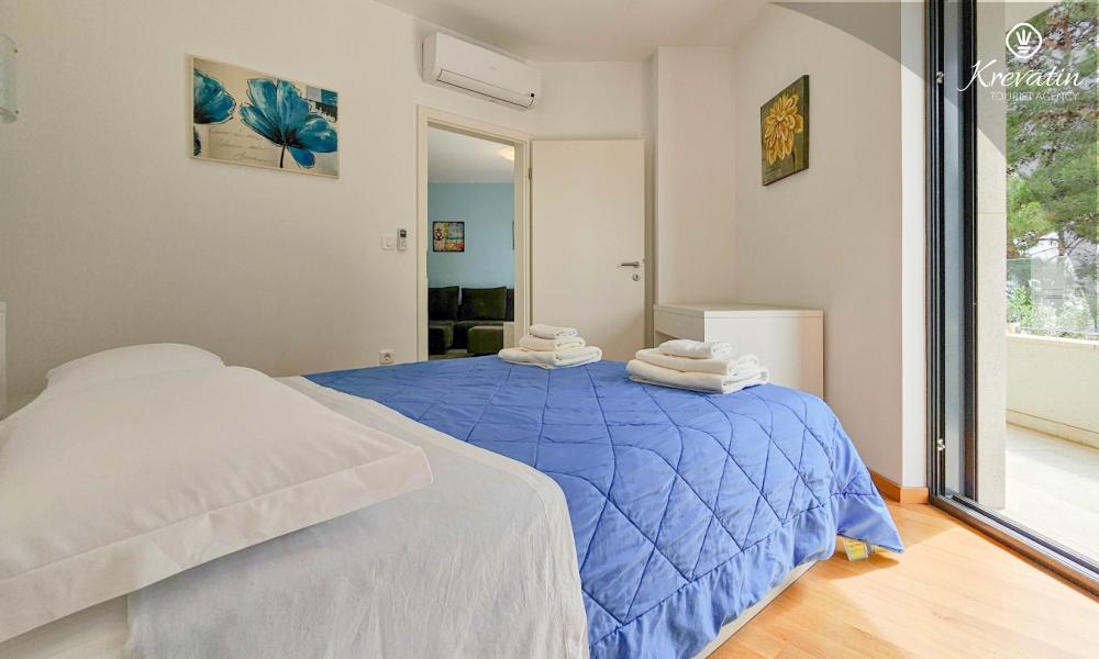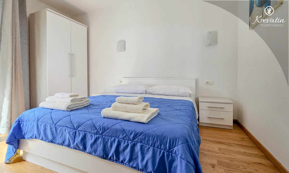 Sie besteht aus einem Schlafzimmer mit Doppelbett, einem Wohnzimmer mit Essbereich und einer Küche mit Grundausstattung zur Zubereitung von Mahlzeiten. Im Wohnzimmer befindet sich ein Bett für zwei weitere Personen. Außerdem gibt es ein Badezimmer mit Dusche und WC. Der Balkon mit schöner Aussicht lädt zu entspannten Stunden im Freien ein.