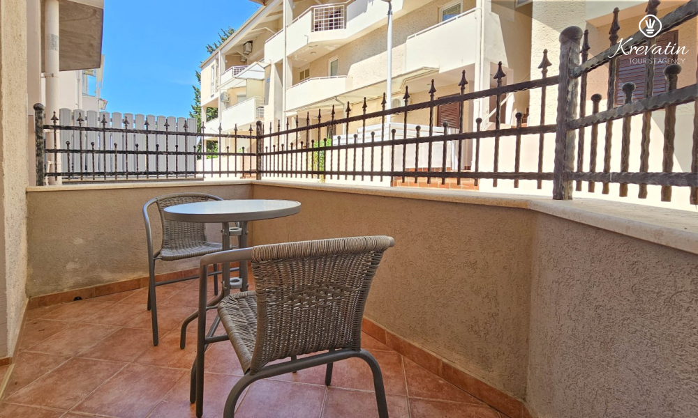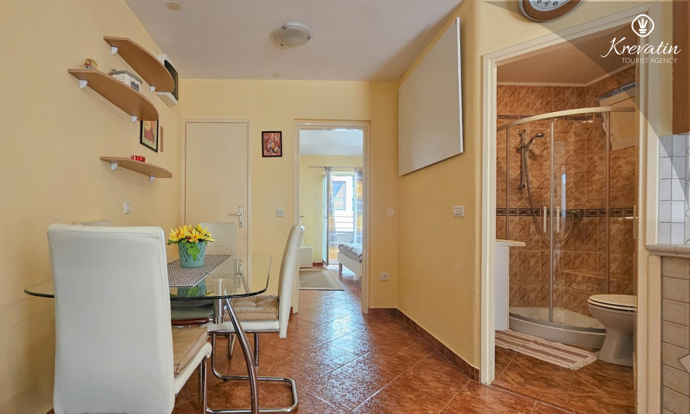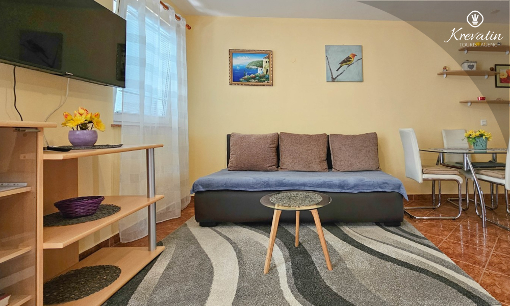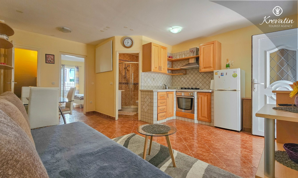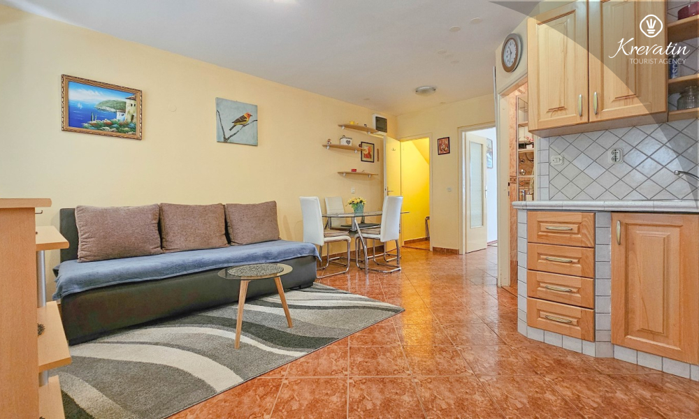 Die Wohnung besteht aus einem Schlafzimmer, einem gemütlichen Wohnzimmer mit Küche und Esszimmer und einer schönen Terrasse. Zwei weitere Gäste können bequem im Wohnzimmer schlafen. Die Küche ist mit dem Nötigsten für die Zubereitung einfacher Mahlzeiten ausgestattet und das praktische Badezimmer verfügt über eine Dusche, eine Toilette und eine Waschmaschine für Ihren Komfort. Entspannen Sie sich auf der mit Tisch und Stühlen ausgestatteten Terrasse, die sich perfekt für einen Kaffee am Morgen oder ein abendliches Beisammensein eignet. Die Wohnung ist mit TV, Klimaanlage, Internet ausgestattet, Bettwäsche und Handtücher stehen Ihnen für einen unbeschwerten Aufenthalt ohne zusätzliche Kosten zur Verfügung.