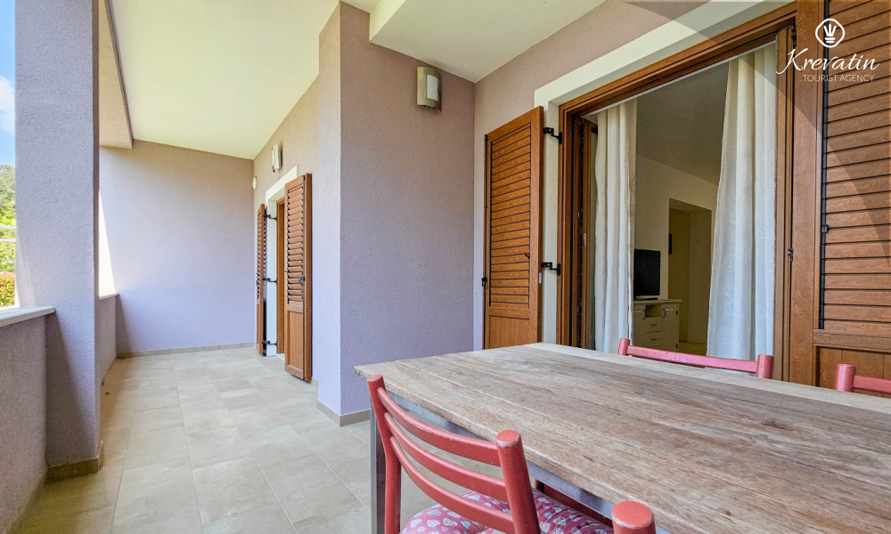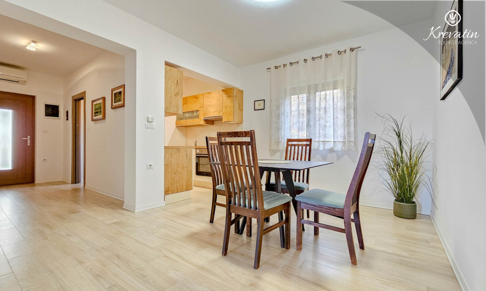 Die Wohnung verfügt über ein Schlafzimmer mit Doppelbett, ein eigenes Bad und Zugang zur Terrasse – der perfekte Ort, um die Natur zu genießen. Außerdem gibt es ein Wohnzimmer mit Essbereich und gut ausgestatteter Küche. Zwei weitere Personen können bequem auf einem Zustellbett übernachten. Ein zusätzliches Badezimmer mit Toilette und Waschbecken sowie eine Terrasse mit Tisch und Stühlen sind ebenfalls vorhanden. Sie können im Garten grillen und den Gemeinschaftsbereich mit den Gästen der anderen beiden Wohnungen nutzen – ideal für geselliges Beisammensein.