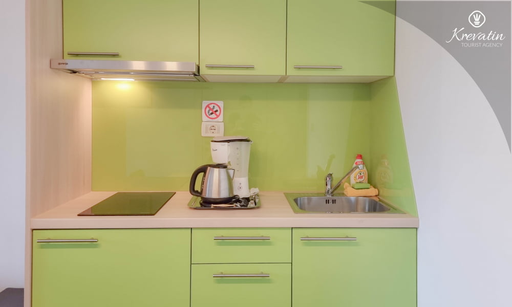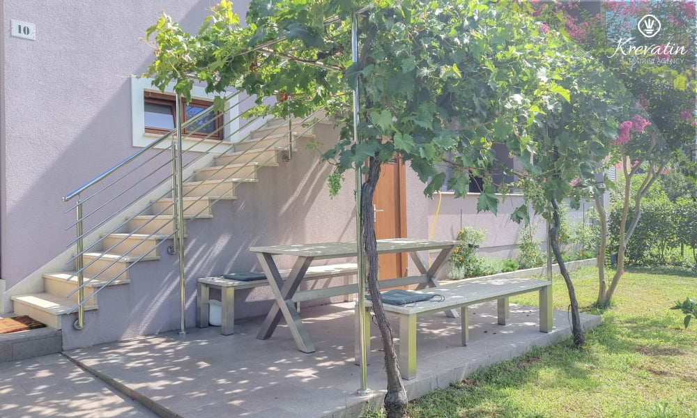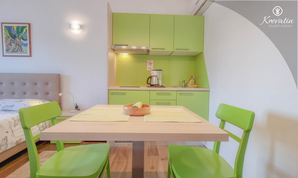 Das Studio verfügt über ein Doppelbett, eine gut ausgestattete Küche und ein Badezimmer mit Dusche und WC. Ein schöner Garten und eine Terrasse mit Grill laden zum gemeinsamen Genießen mit anderen Gästen ein. Genießen Sie duftende Köstlichkeiten vom Grill.
