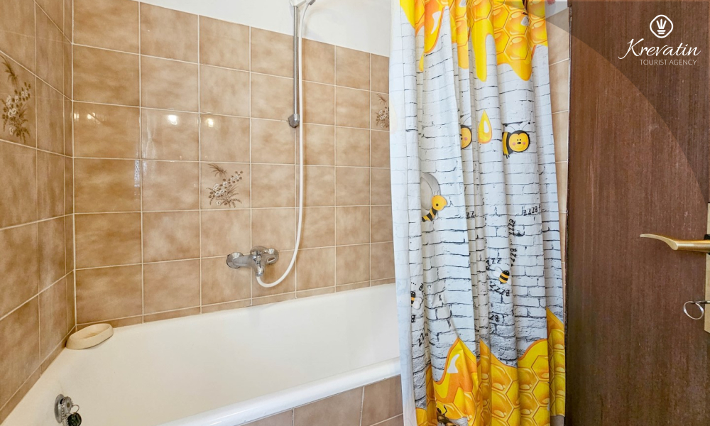 Das Apartment bietet ein Schlafzimmer, eine Küche mit Esszimmer – ausgestattet mit grundlegenden Annehmlichkeiten, ein Badezimmer mit Badewanne und WC sowie eine überdachte Terrasse mit Tisch und Stühlen – ideal zum Entspannen nach einem Tag am Strand.