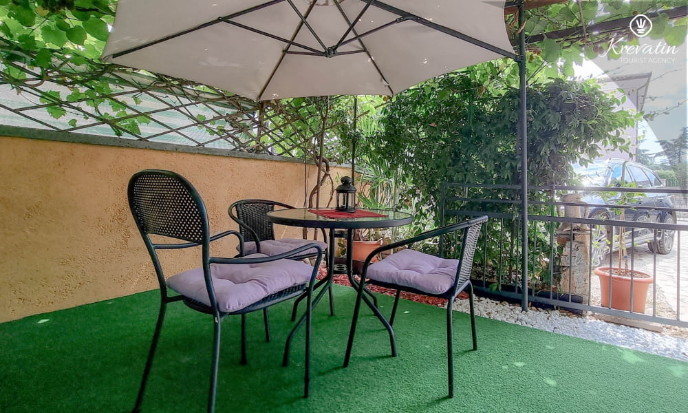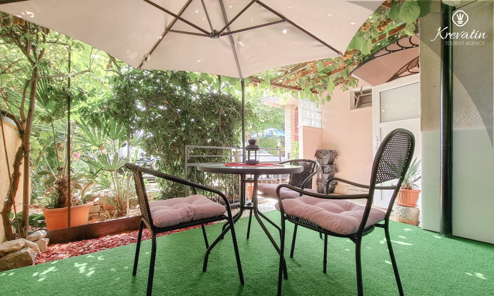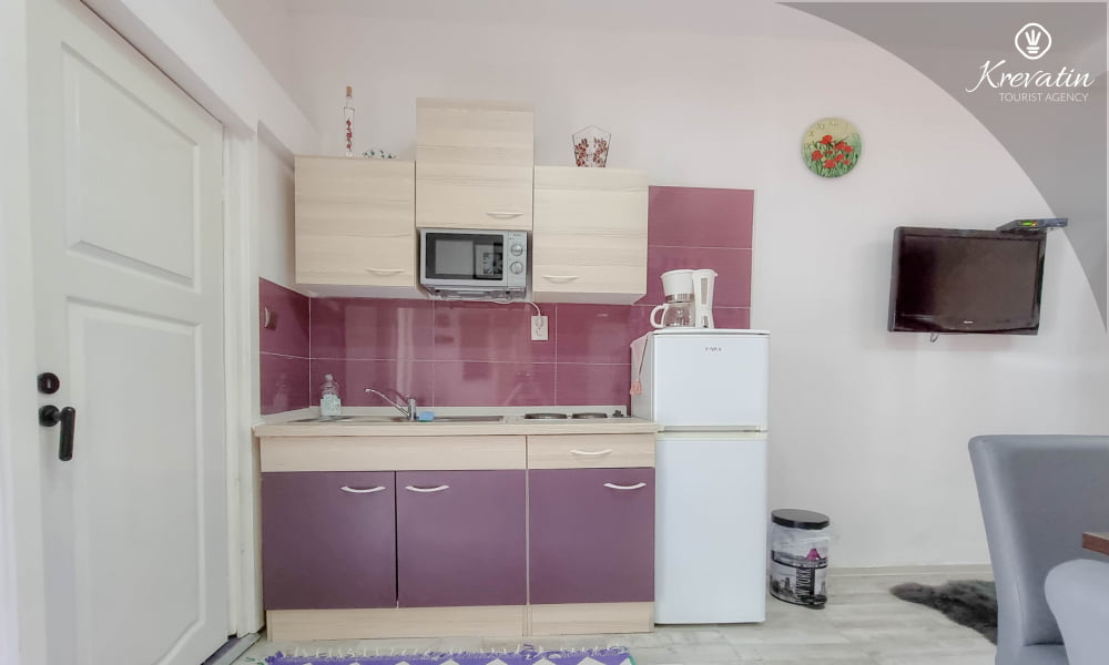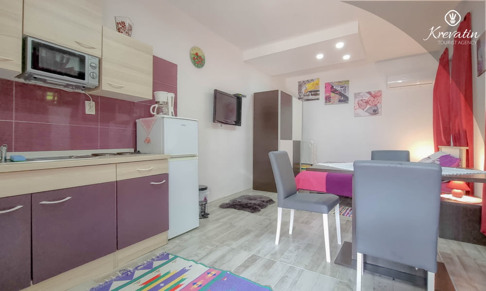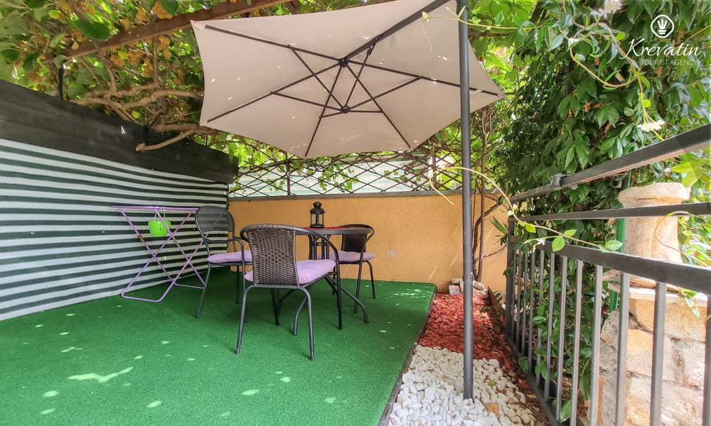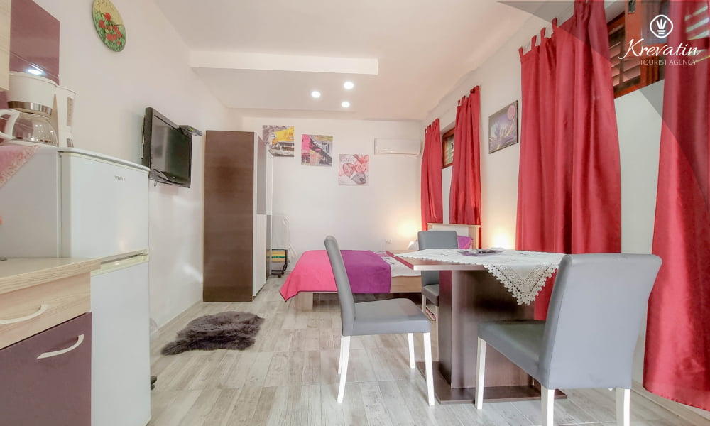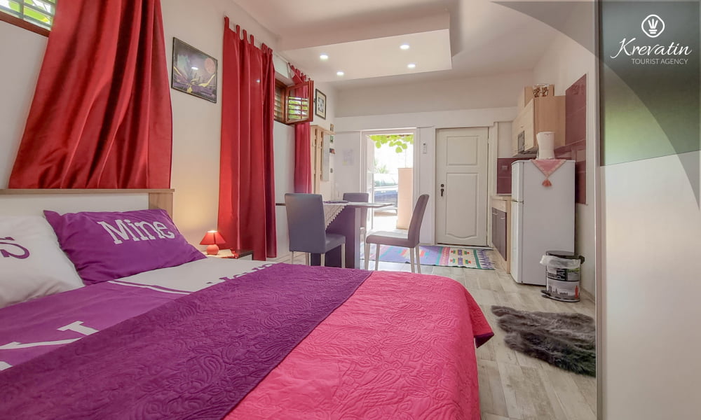 Diese Studio Apartment für 2 Personen, im Erdgeschoss gelegen, besteht aus einem Schlafzimmer mit Doppelbett und eine Küche. Die Küche ist mit Elektroherd, Kühlschrank, Mikrowelle und Kaffeemaschine ausgestattet. Desweiteren gibt es ein Badezimmer mit Dusche und Toilete, sowie eine schöne Terrase mit Terrassenmöbeln. Inklusive sind SAT-TV, Klimaanlage, WLAN, Bettwäsche und Handtücher. Haustiere sind willkommen gegen Gebühr.