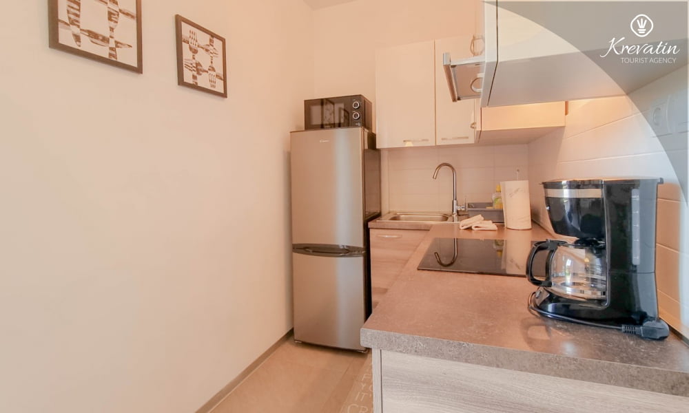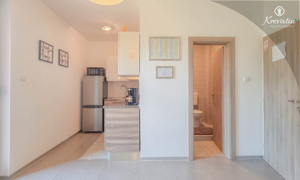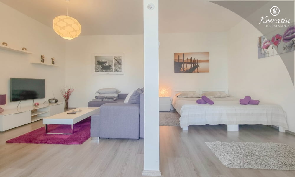 Es besteht aus einem Schlafzimmer mit einem bequemen Bett, einem Wohnzimmer mit einem Schlafsofa und einer Küche mit den wichtigsten Utensilien für die Zubereitung von Mahlzeiten. Ein Badezimmer mit Dusche und WC sorgt für Komfort, und die geräumige Terrasse mit Blick auf den Garten ist der ideale Ort für den Morgenkaffee oder die abendliche Ruhepause.