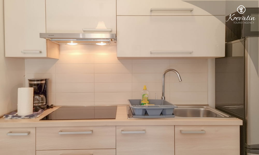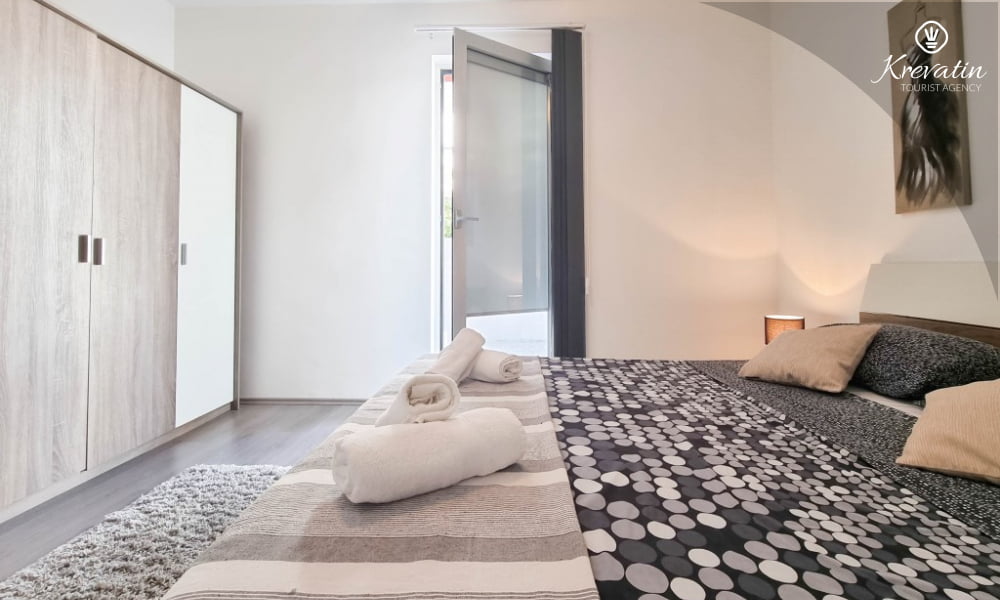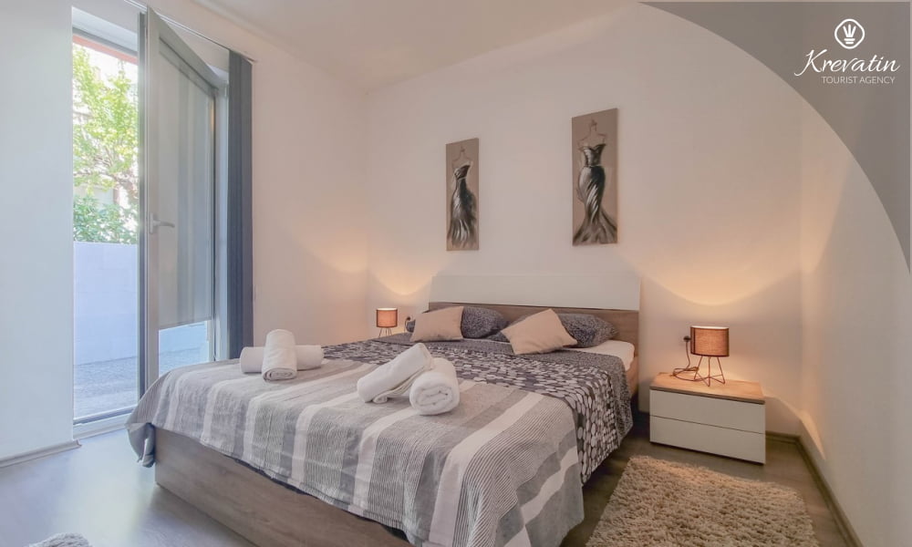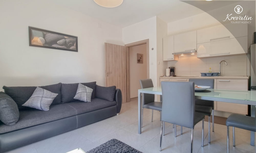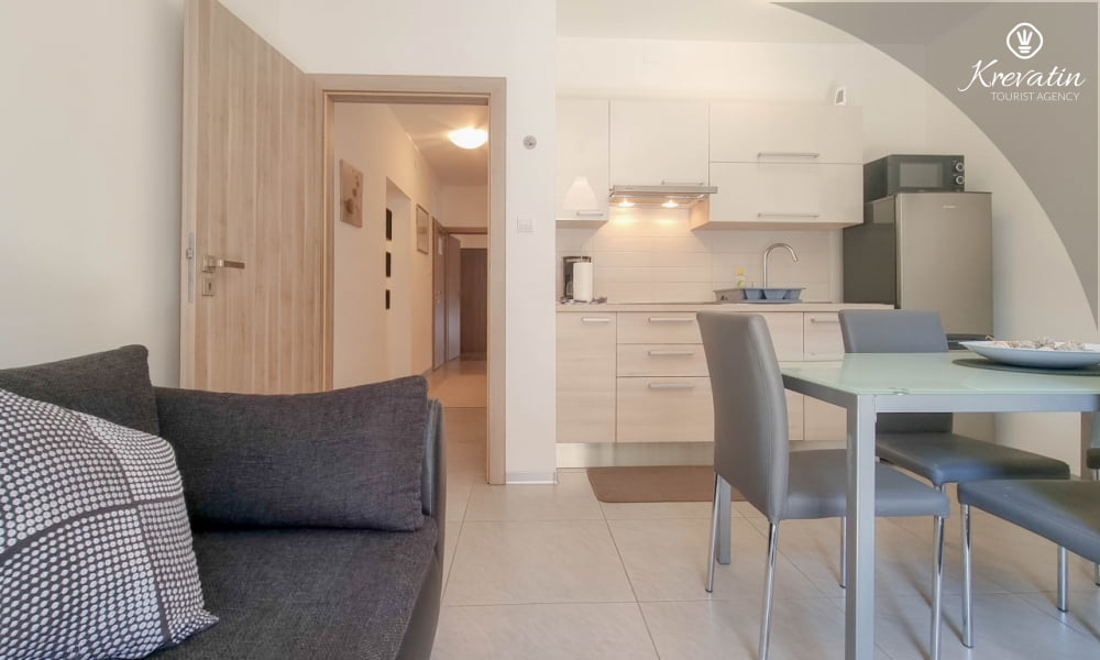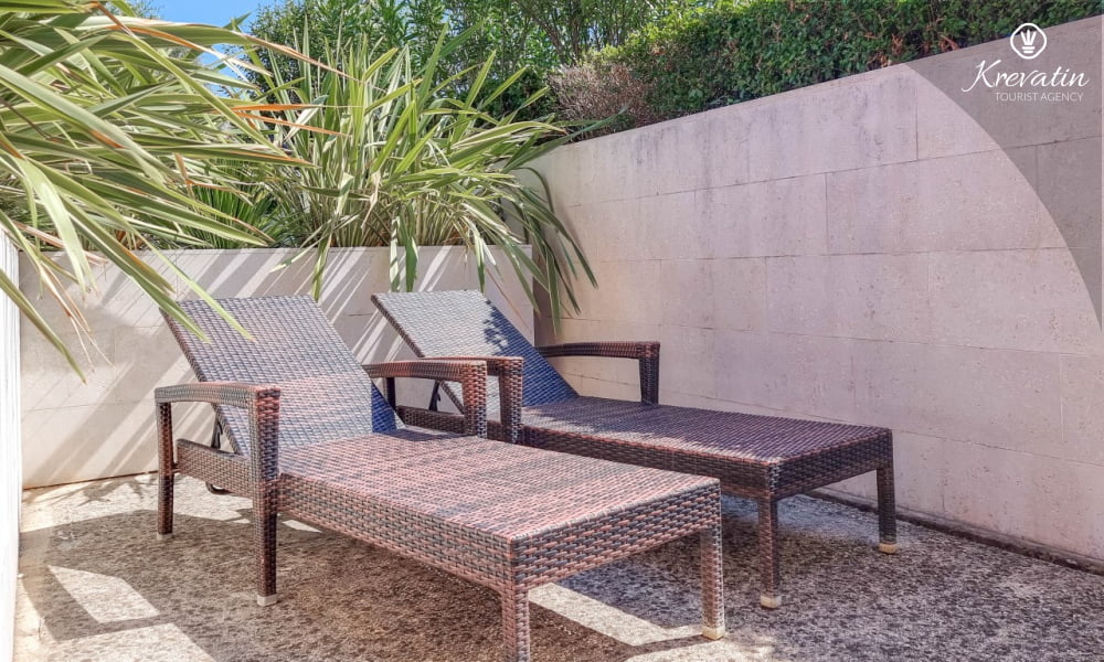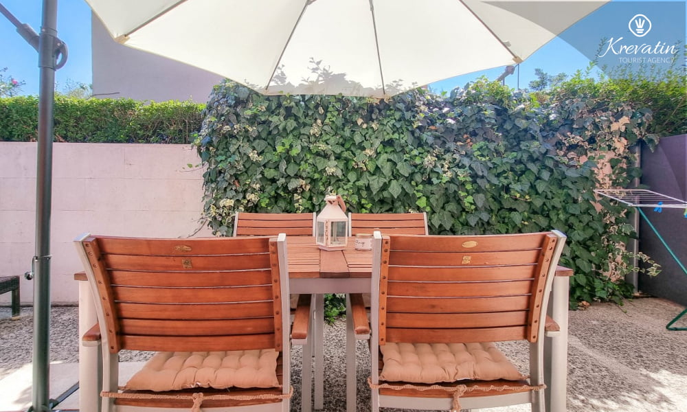 Das Apartment verfügt über zwei Schlafzimmer – eines mit Doppelbett und eines mit Einzelbett – und ein Wohnzimmer mit Schlafsofa, ideal für eine weitere Person. Die Küche ist mit allen Annehmlichkeiten ausgestattet und bietet alles, was Sie für die Zubereitung leichter Mahlzeiten benötigen. Das Badezimmer mit Dusche und WC sowie die schöne Terrasse mit Gartenmöbeln und viel Grün laden zum Entspannen bei einem Morgenkaffee oder einem Glas Wein am Abend ein.