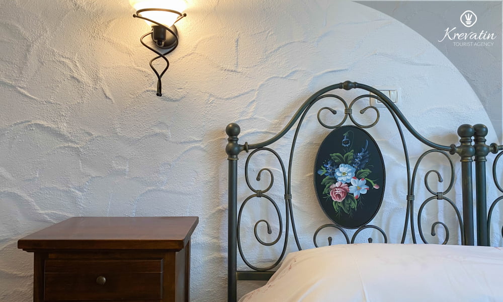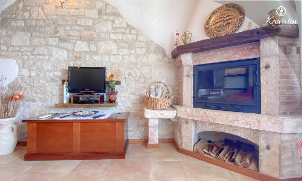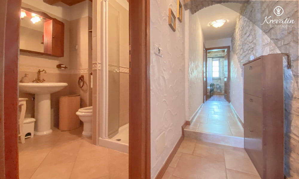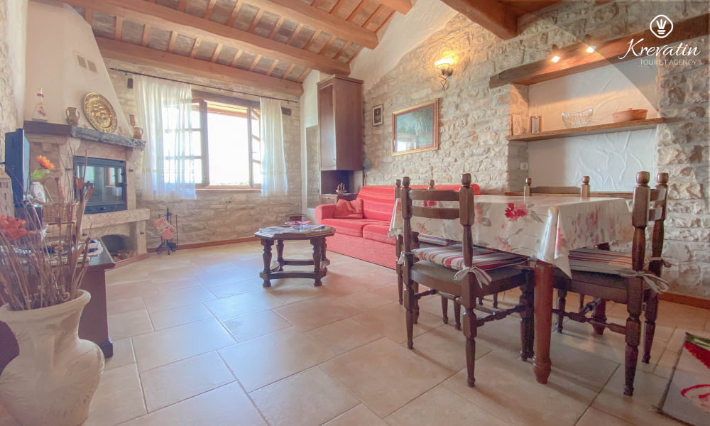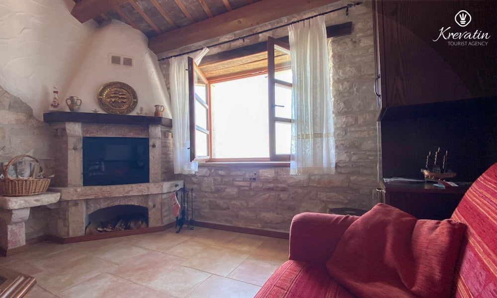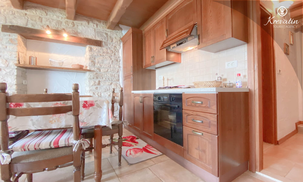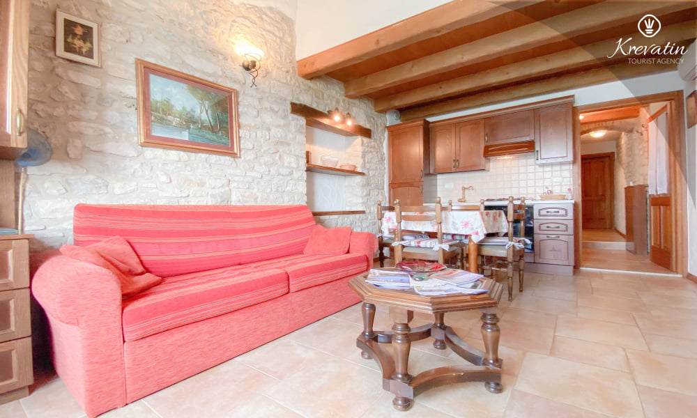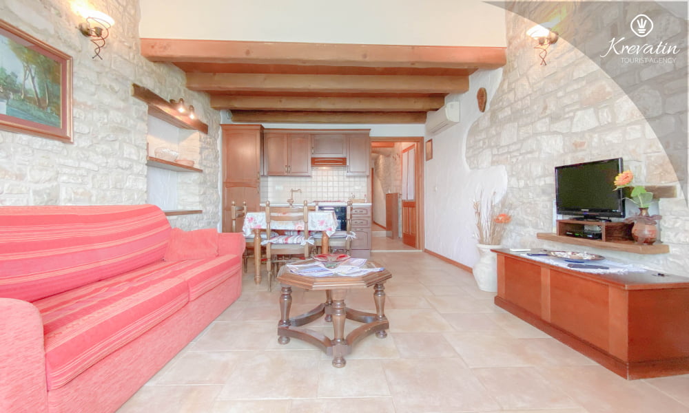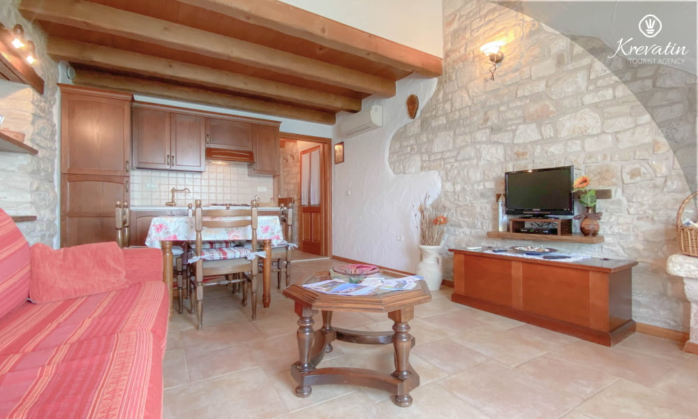 Es verfügt über ein Schlafzimmer mit Doppelbett, ein gemütliches Wohnzimmer mit Schlafcouch für weitere Gäste und eine funktionale Küche mit allem Nötigen für die Zubereitung einfacher Mahlzeiten. Das Badezimmer ist rustikal und praktisch mit Dusche und WC ausgestattet.