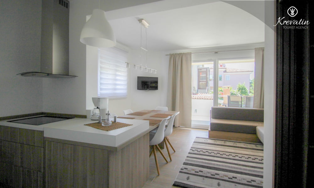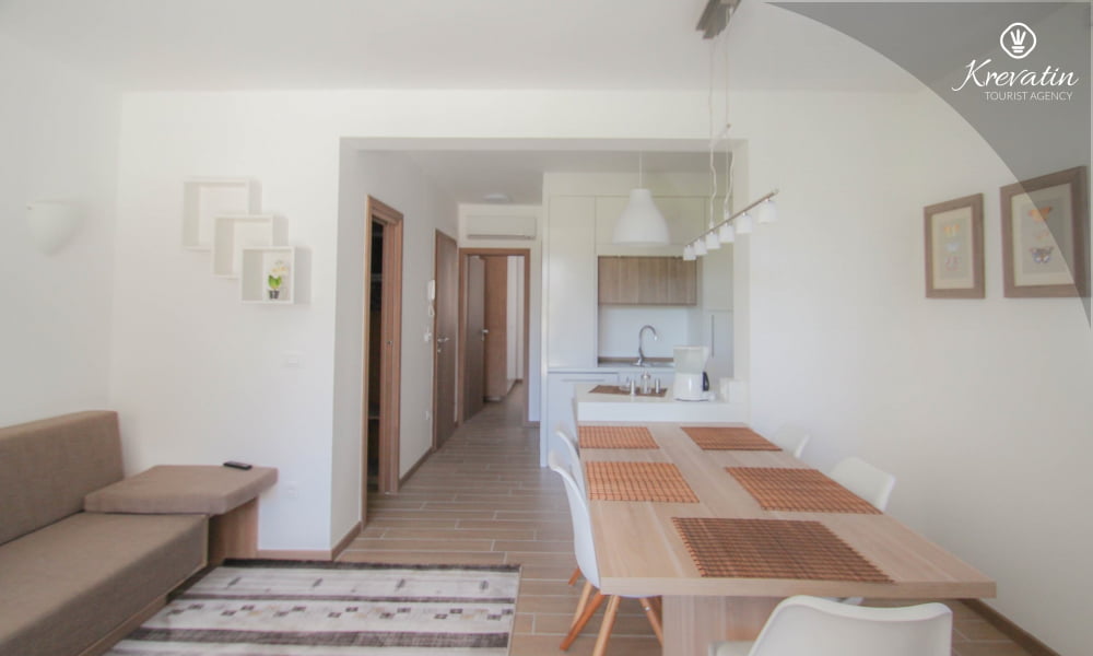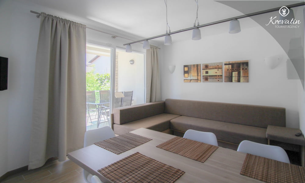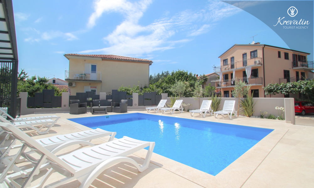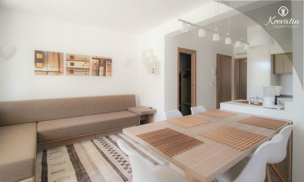 Dieses Apartment für 2 bis 4 Personen befindet sich am ersten Stock und besteht aus einem Schlafzimmer mit Doppelbett und einem Wohnzimmer mit ein Sofabett und mit Küche. Die Küche ist mit Elektroherd, Kühlschrank, Geschirrspüler und Kaffeemaschineausgestattet. Darüber hinaus gibt es ein Badezimmer mit Dusche und WC und einen schönen Balkon mit Sitzgelegenheiten. Es gibt auch ein Schwimmbad zu gemeinsamen Nutzung. Inklusive sind SAT-TV, Klimaanlage, WiFi, Bettwäsche und Handtücher. Haustiere sind willkommen gegen Gebühr.