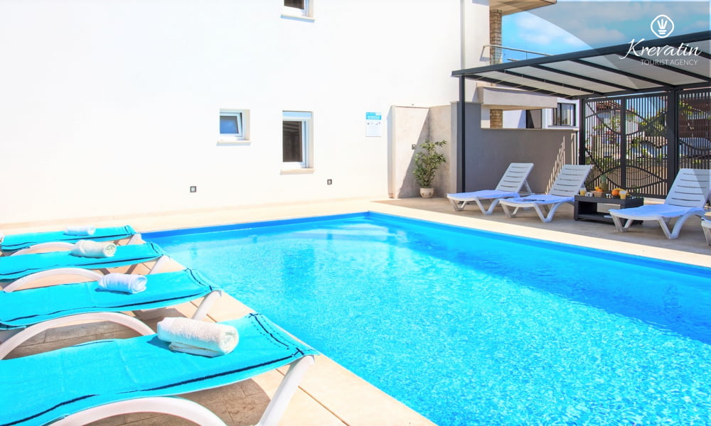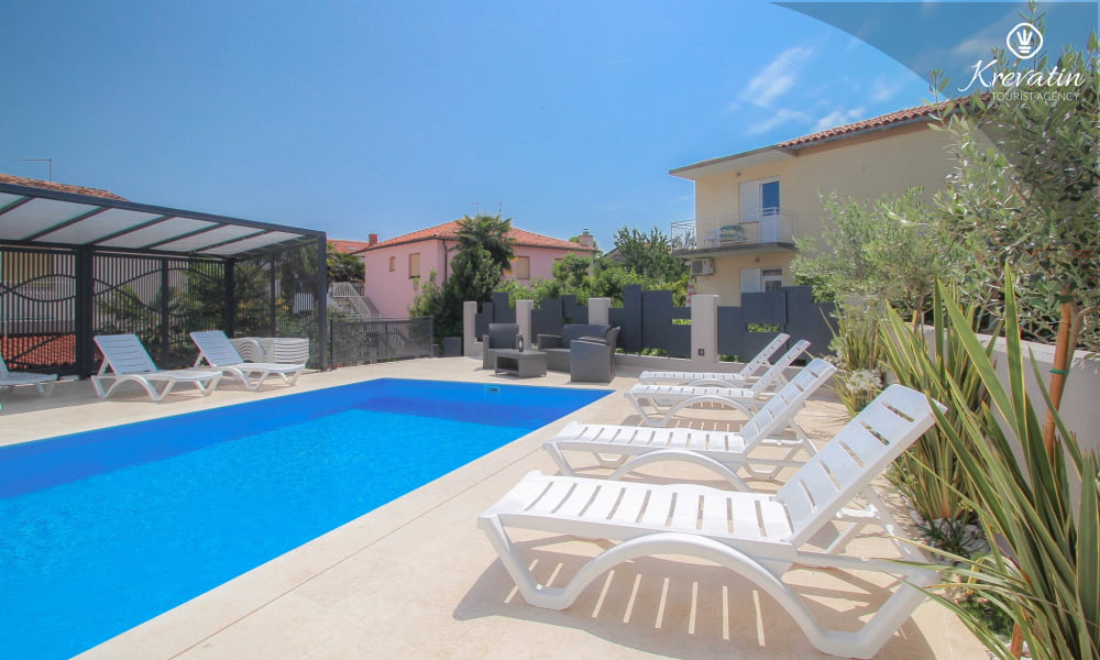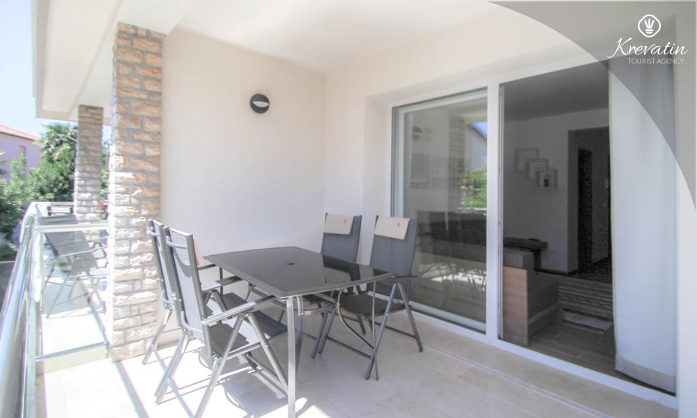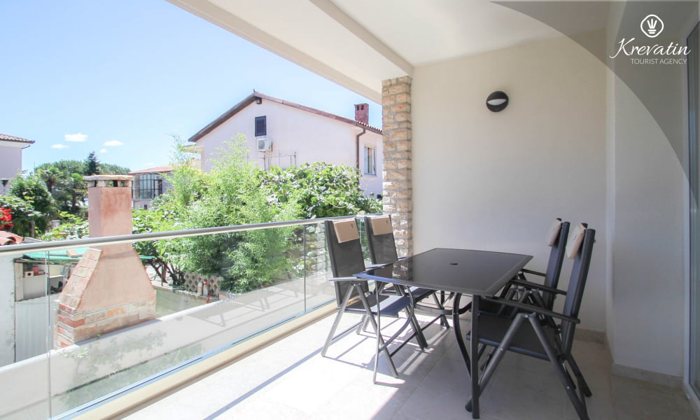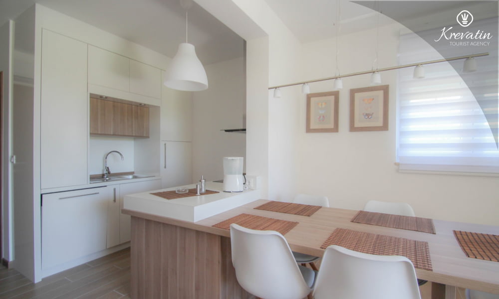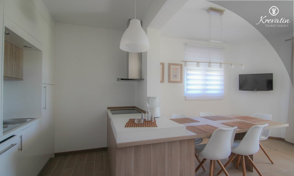 Dieses Apartment für 2 bis 4 Personen befindet sich am ersten Stock und besteht aus einem Schlafzimmer mit Doppelbett und einem Wohnzimmer mit ein Sofabett und mit Küche. Die Küche ist mit Elektroherd, Kühlschrank, Geschirrspüler und Kaffeemaschineausgestattet. Darüber hinaus gibt es ein Badezimmer mit Dusche und WC und einen schönen Balkon mit Sitzgelegenheiten. Es gibt auch ein Schwimmbad zu gemeinsamen Nutzung. Inklusive sind SAT-TV, Klimaanlage, WiFi, Bettwäsche und Handtücher. Haustiere sind willkommen gegen Gebühr.