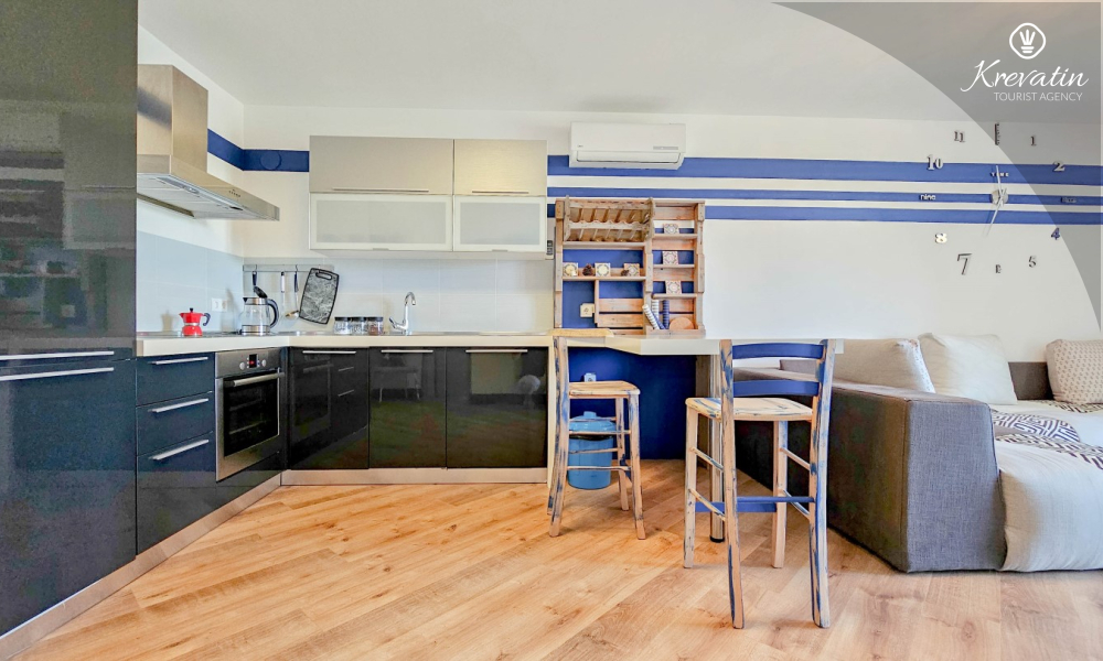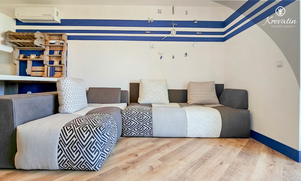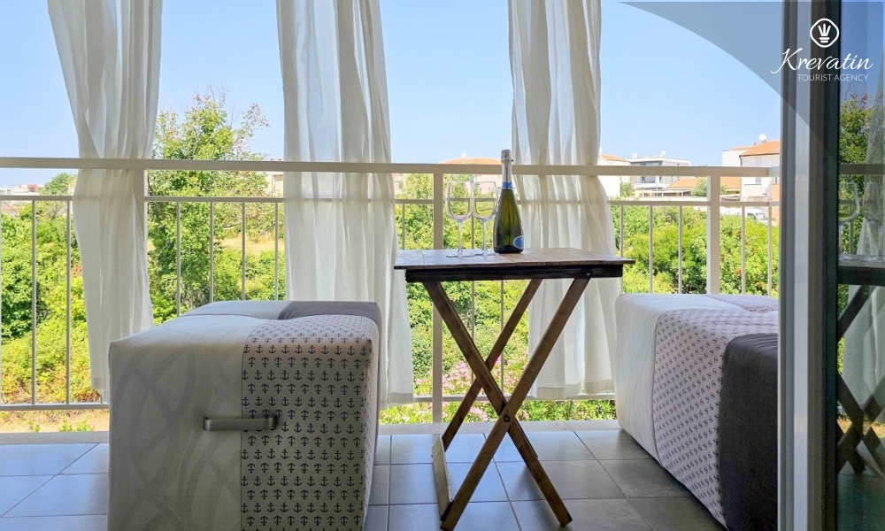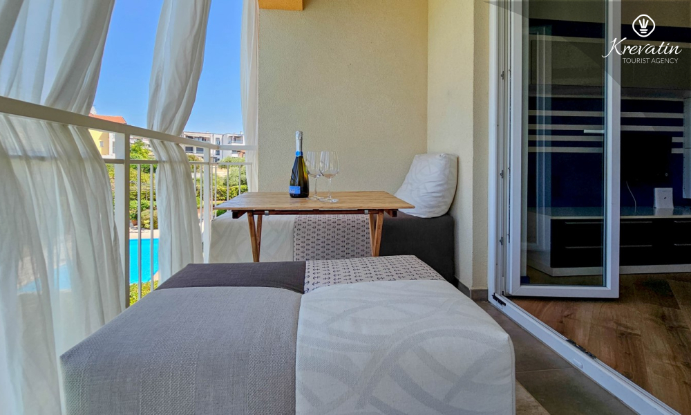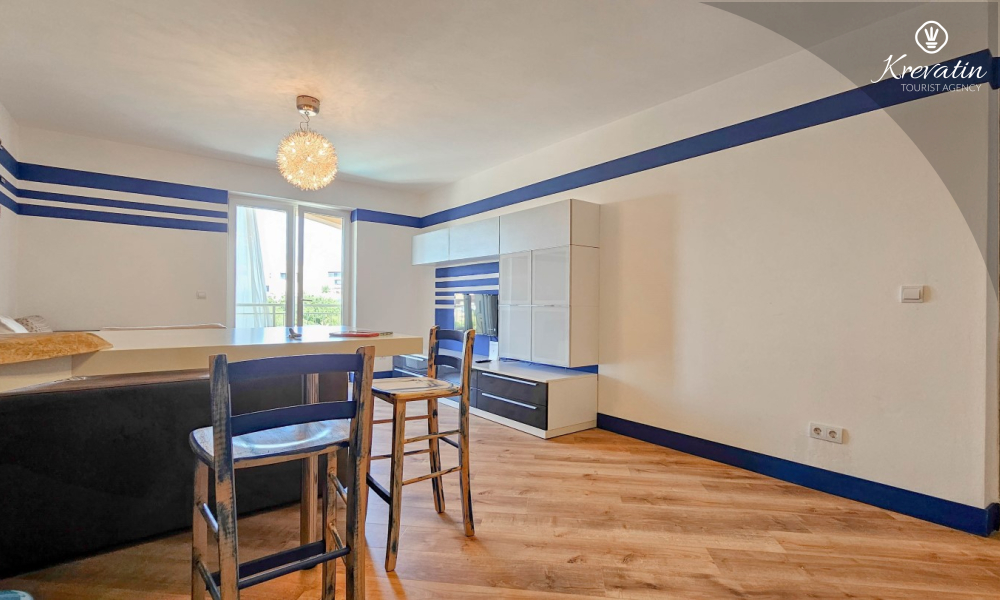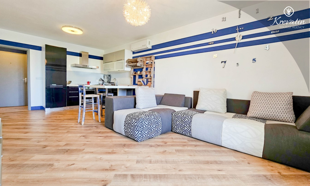 Das Apartment verfügt über ein Schlafzimmer mit Doppelbett, ein Wohnzimmer mit Schlafsofa, ein Badezimmer mit Dusche und WC sowie eine funktionale Küche mit allen notwendigen Annehmlichkeiten. Vom Wohnzimmer aus gelangt man auf einen Balkon mit Gartenmöbeln und Grill – ideal für den Morgenkaffee oder ein Abendessen im Freien.
