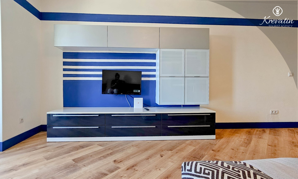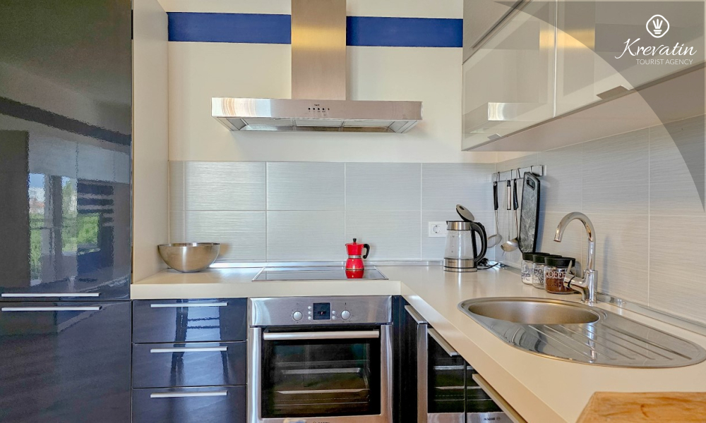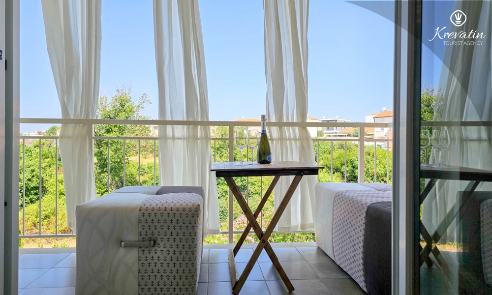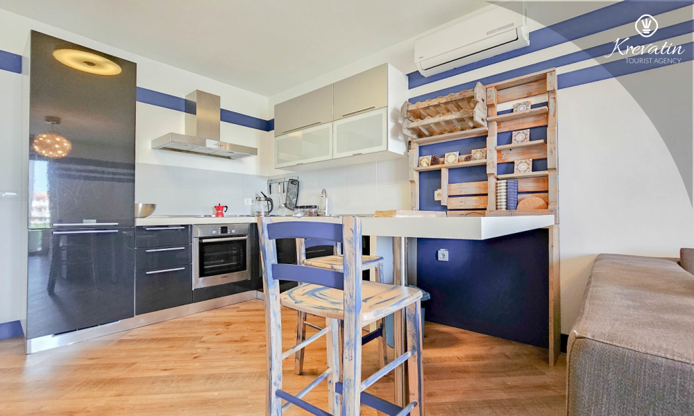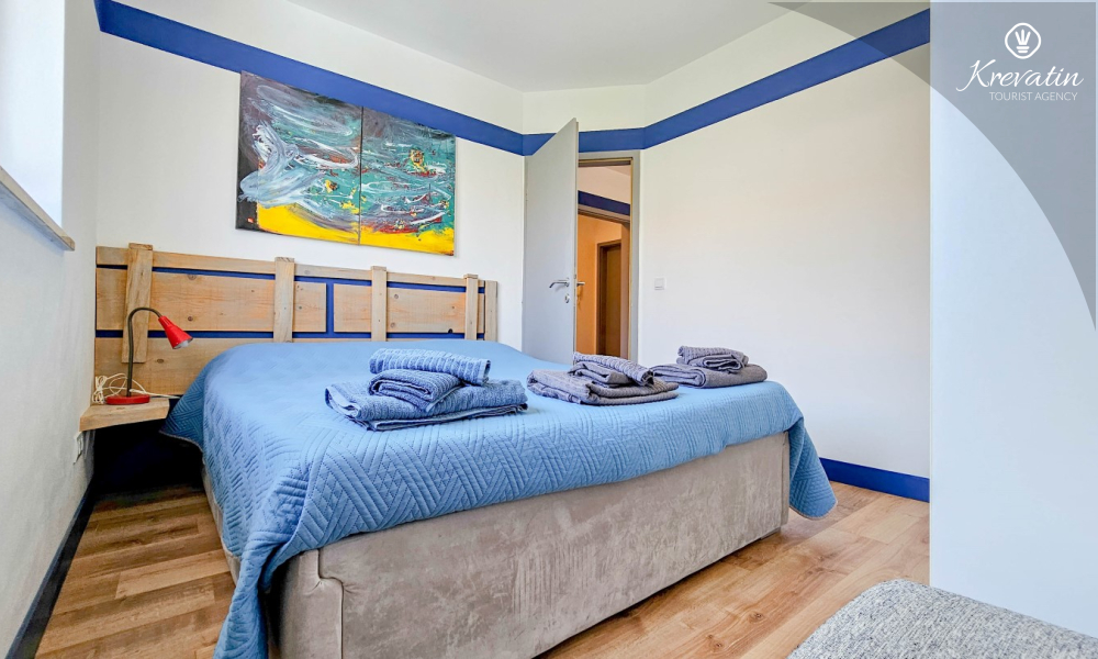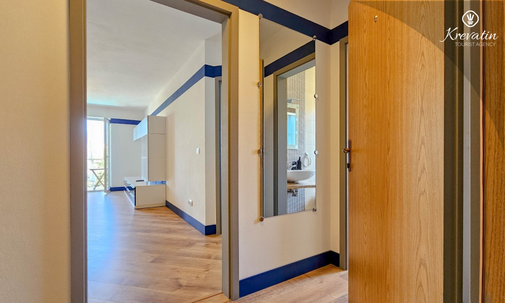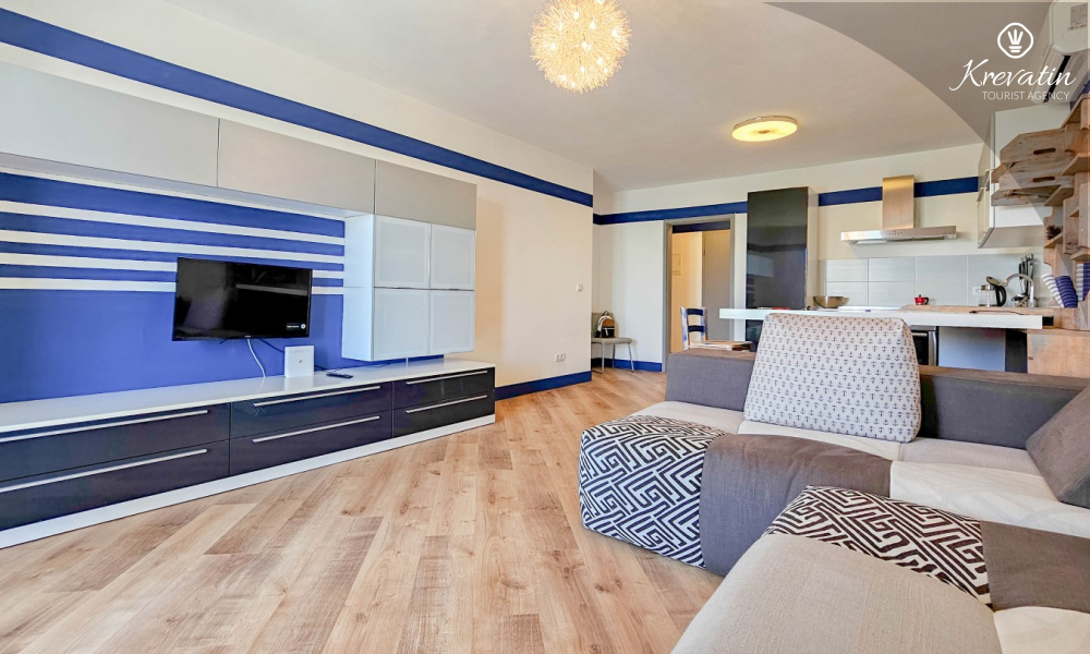 Das Apartment verfügt über ein Schlafzimmer mit Doppelbett, ein Wohnzimmer mit Schlafsofa, ein Badezimmer mit Dusche und WC sowie eine funktionale Küche mit allen notwendigen Annehmlichkeiten. Vom Wohnzimmer aus gelangt man auf einen Balkon mit Gartenmöbeln und Grill – ideal für den Morgenkaffee oder ein Abendessen im Freien.
