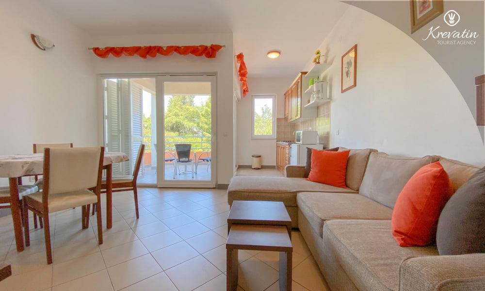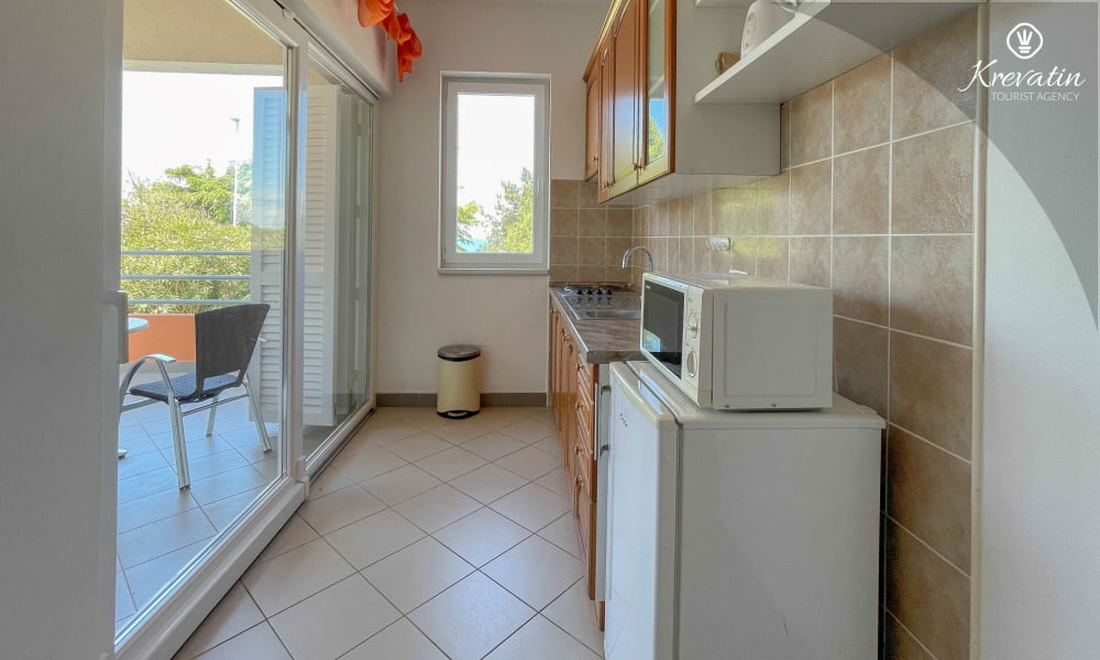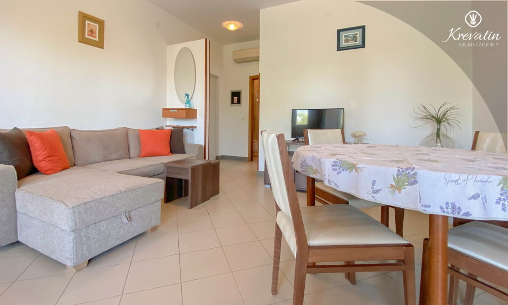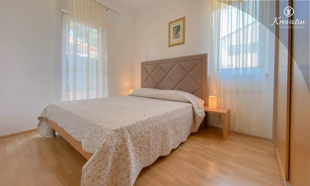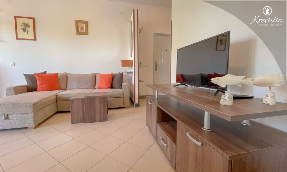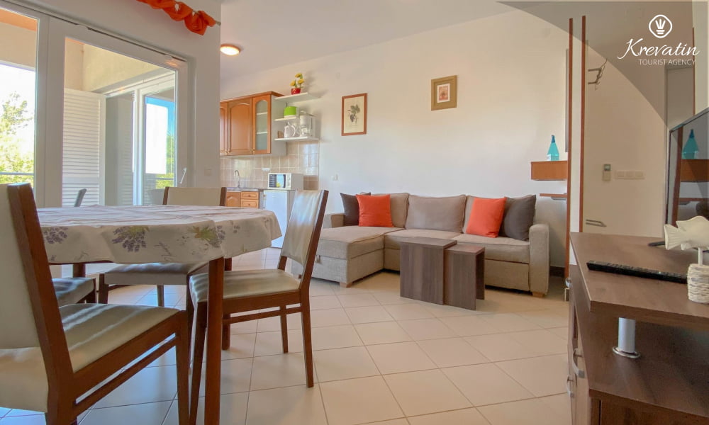 Diese Apartment für bis 4 Personen befindet sich im Erdgeschoss und verfügt über einem Schlafzimmer, ein Wohnzimmer mit ein Sofabett und eine Küche. Die Küche ist mit Elektroherd, Kühlschrank und Kaffemaschine ausgestattet. Desweiteren gibt es noch ein Badezimmer mit Dusche und WC und eine Terrasse mit Möbeln und teilweise Meerblick. Inklusive sind SAT-TV, Klimaanlage, WiFi, Bettwäsche und Handtücher. Haustiere sind nicht erlaubt.