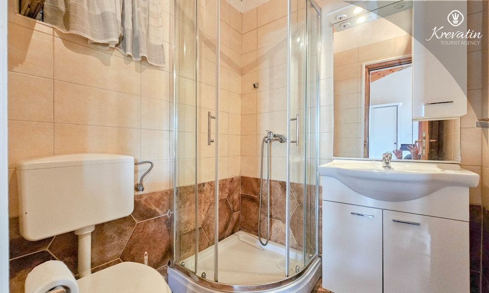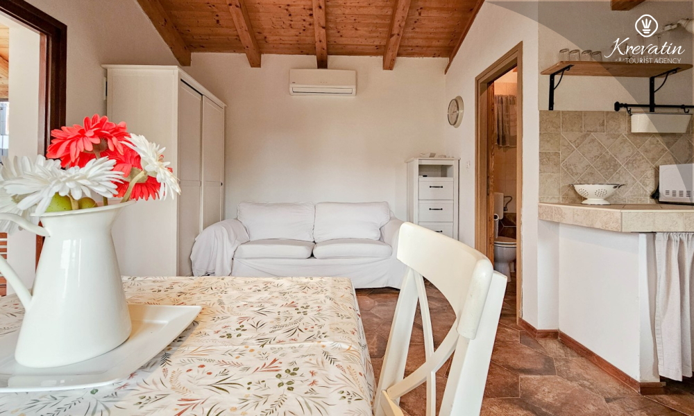 Das Apartment besteht aus einem Zimmer mit einem bequemen Schlafsofa, einer Küche mit allem Nötigen zur Zubereitung von Mahlzeiten und einem praktisch eingerichteten Badezimmer mit Dusche und WC. Zum Studio gehört außerdem eine Terrasse mit Tisch und Stühlen – perfekt für den Morgenkaffee oder zum Entspannen am Abend.