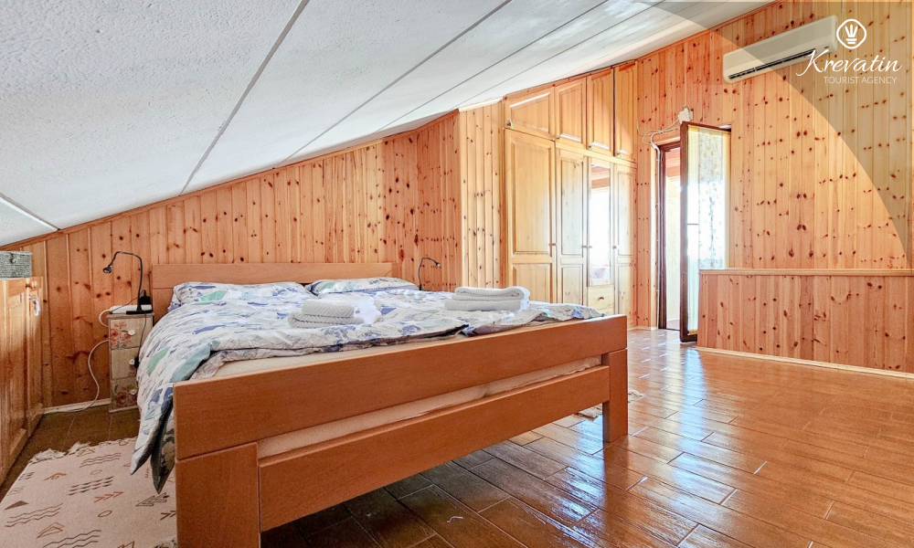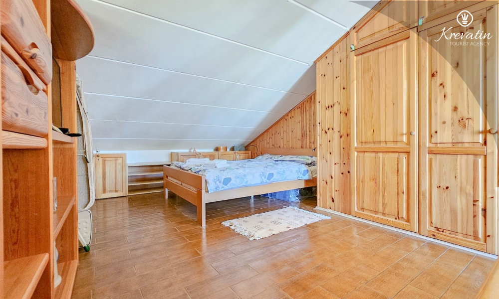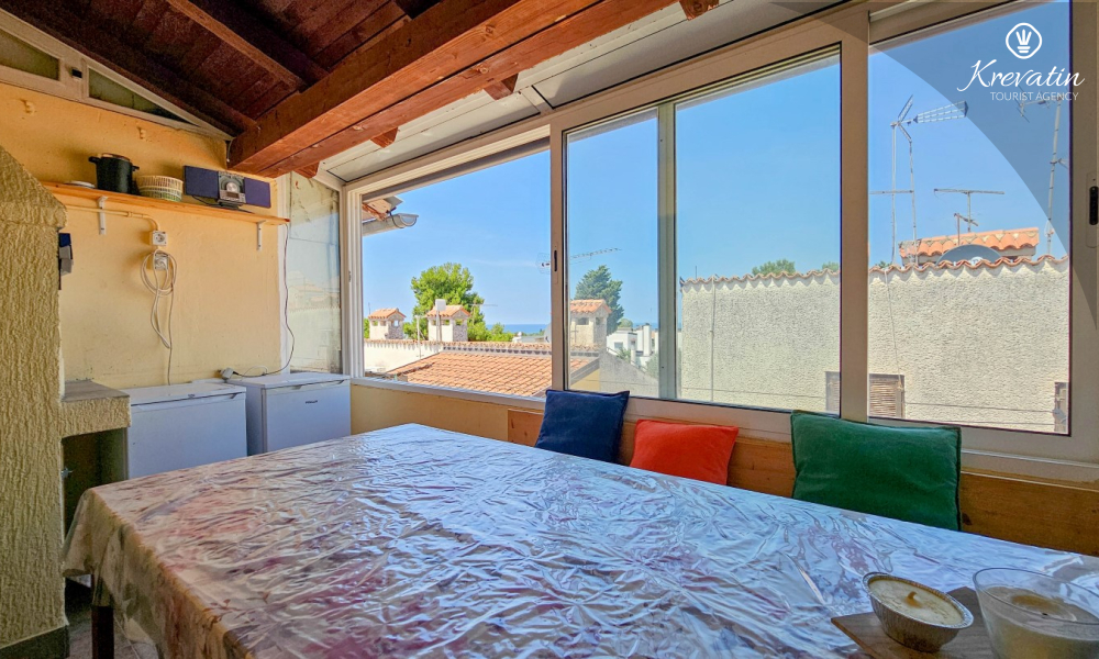 Im Erdgeschoss gibt es eine gut ausgestattete Küche, ein Wohnzimmer mit Esszimmer, in dem Sie gemeinsame Mahlzeiten genießen können, und ein praktisches Badezimmer mit Dusche, WC und Waschmaschine. Im ersten Stock gibt es ein gemütliches Schlafzimmer mit Doppelbett und geschlossenem Balkon, ideal für einen Kaffee am Morgen oder zum Entspannen am Abend.