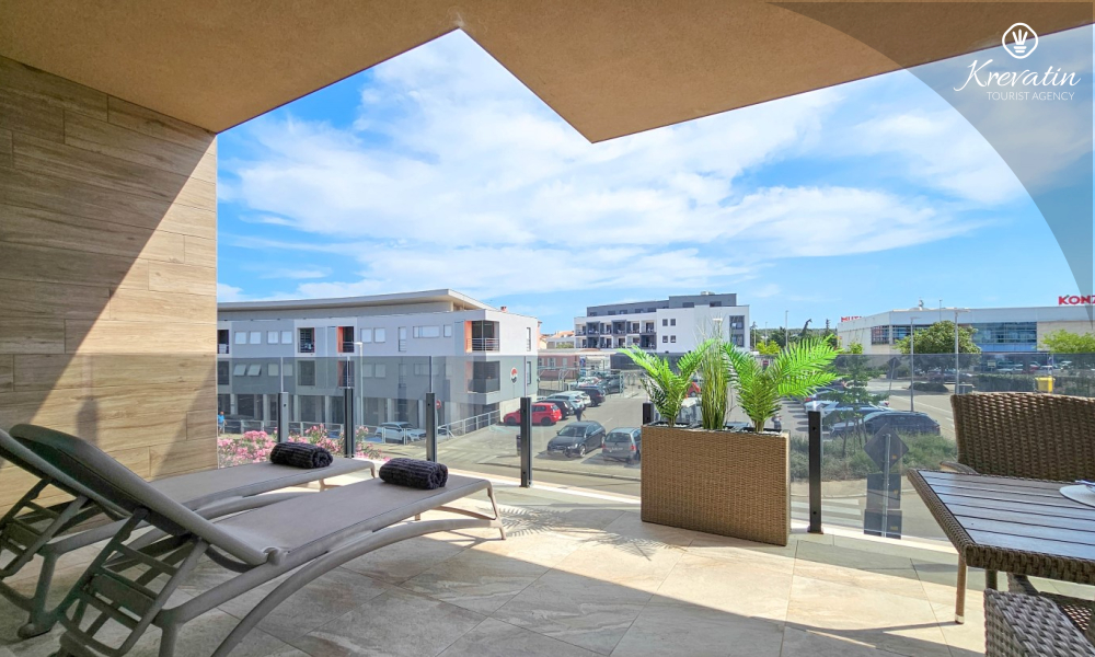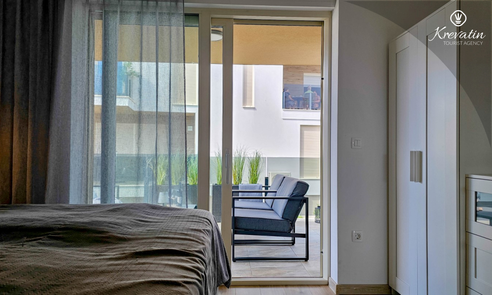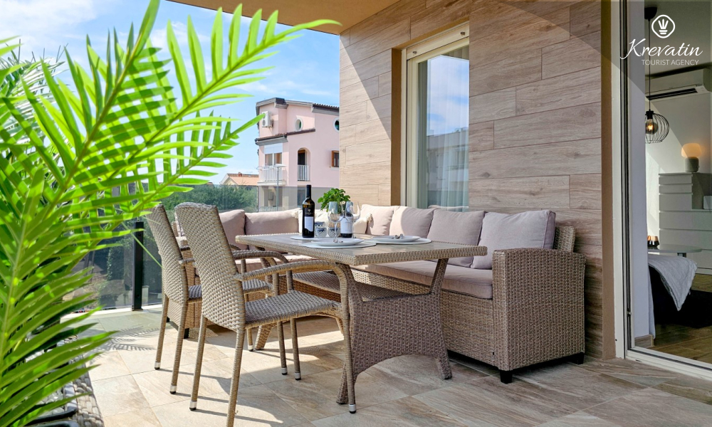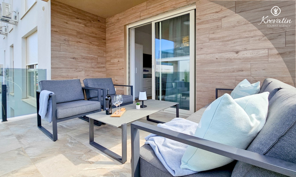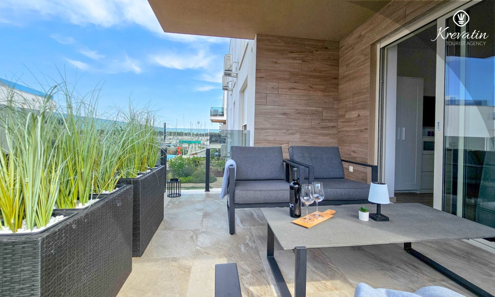 Den Gästen stehen zwei Balkone zur Verfügung: einer ist vom Schlafzimmer aus zugänglich, der andere hat einen Ausgang vom Wohnzimmer und ist mit Liegestühlen, einem Sonnenschirm und einer gemütlichen Sitzecke ausgestattet.