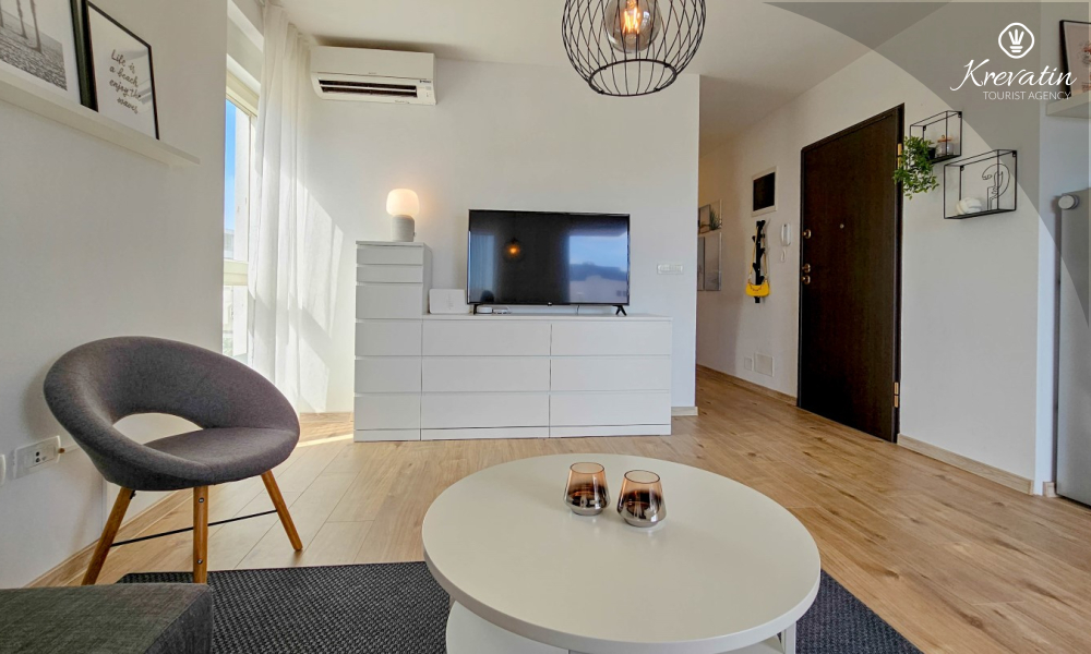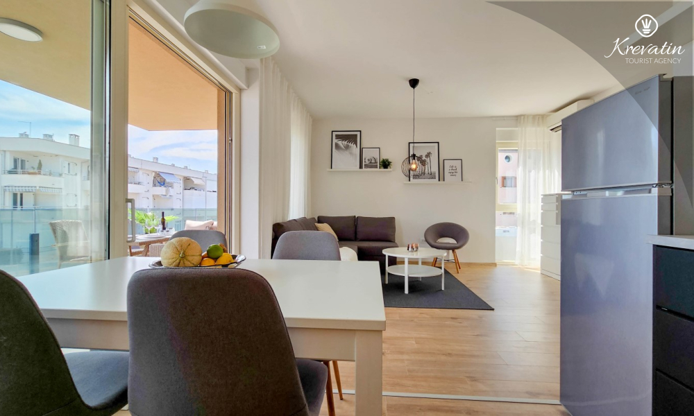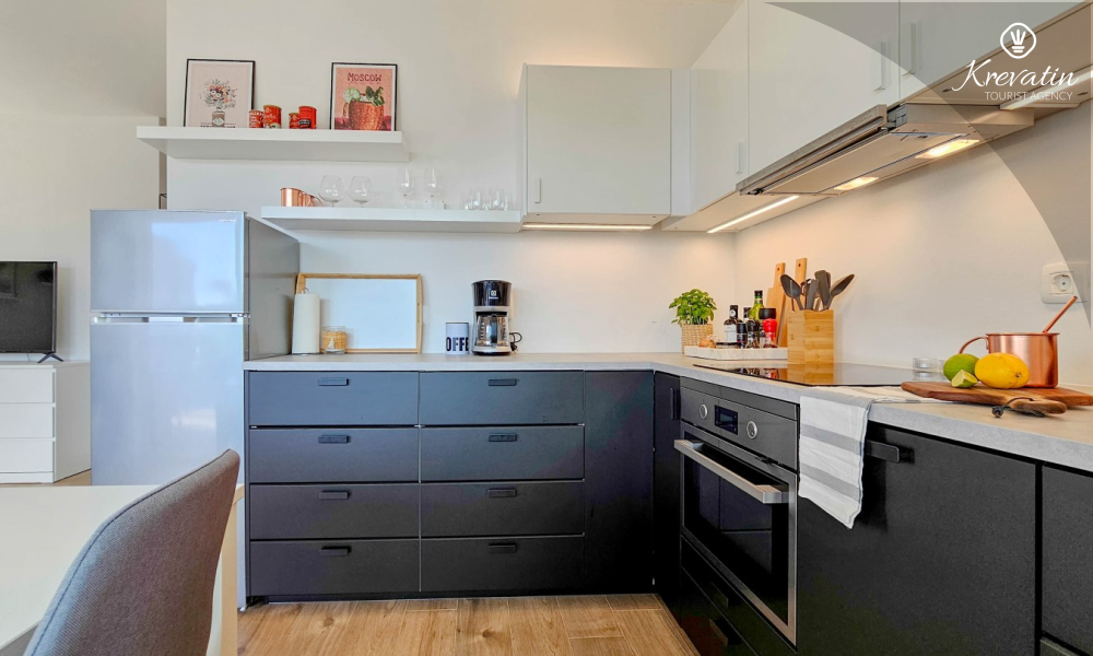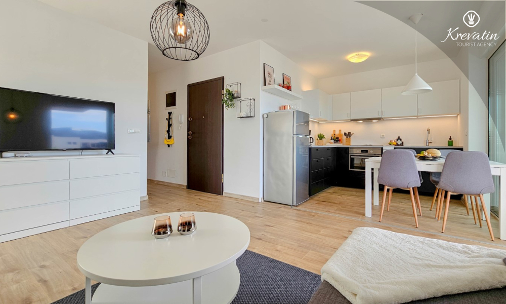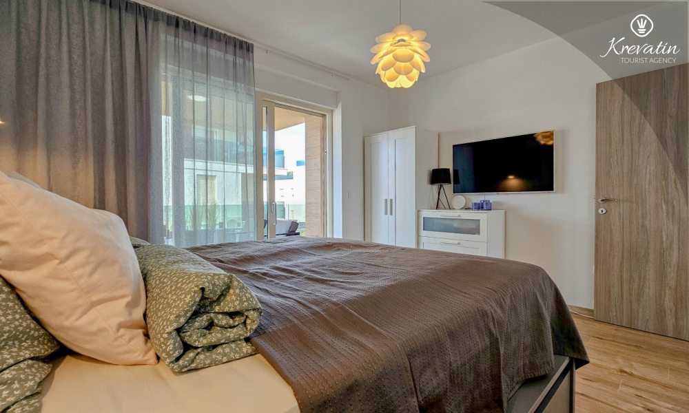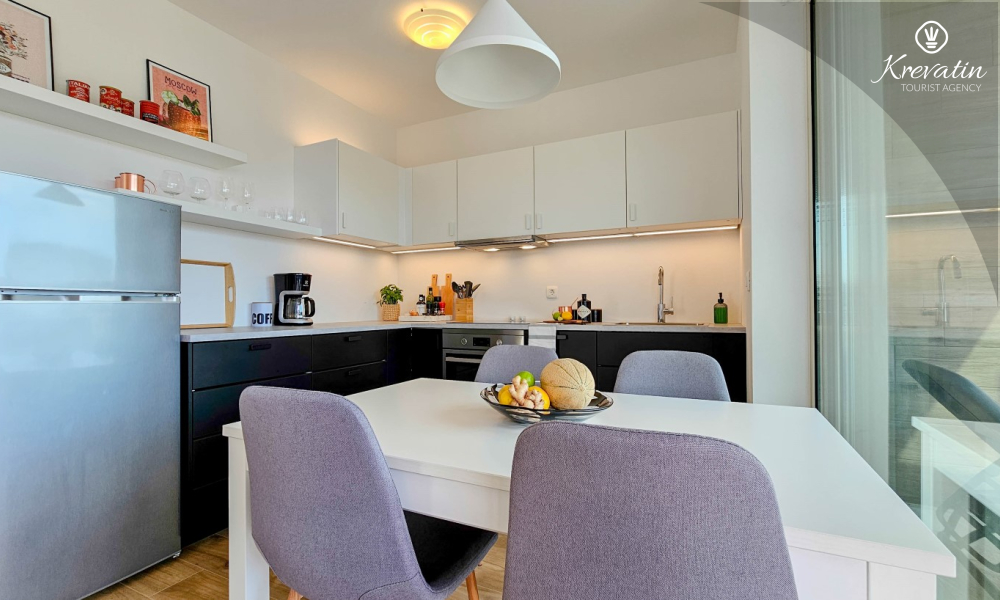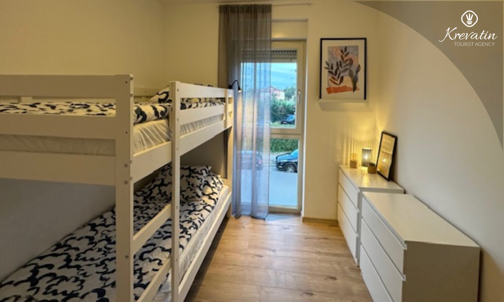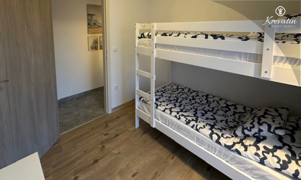 Das Apartment verfügt über zwei Schlafzimmer, eines mit einem Doppelbett und das andere mit einem Etagenbett. Zwei weitere Gäste können auf einem Schlafsofa im Wohnzimmer übernachten. Die moderne Küche ist mit allem Nötigen zur Zubereitung von Mahlzeiten ausgestattet.