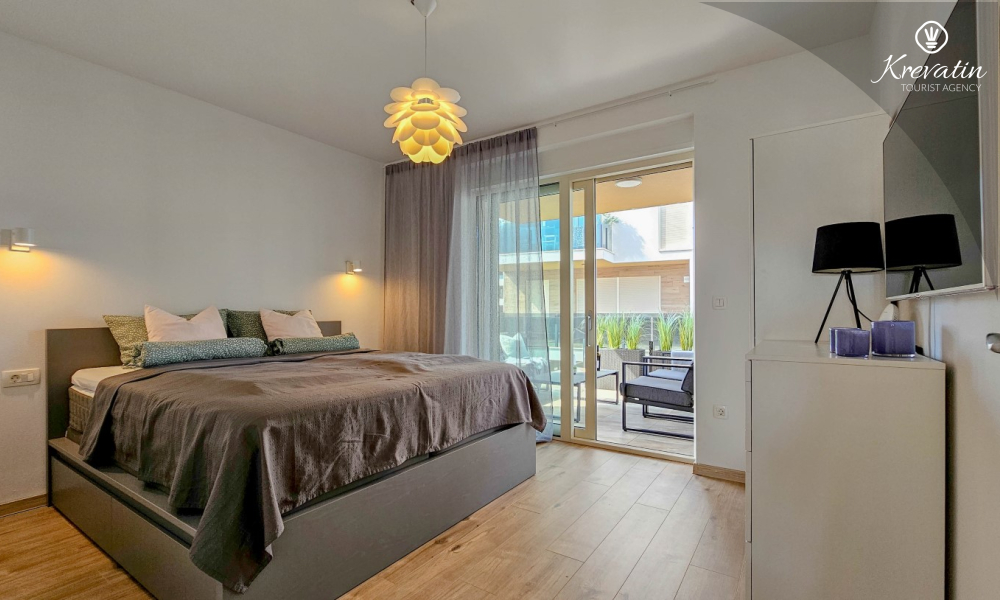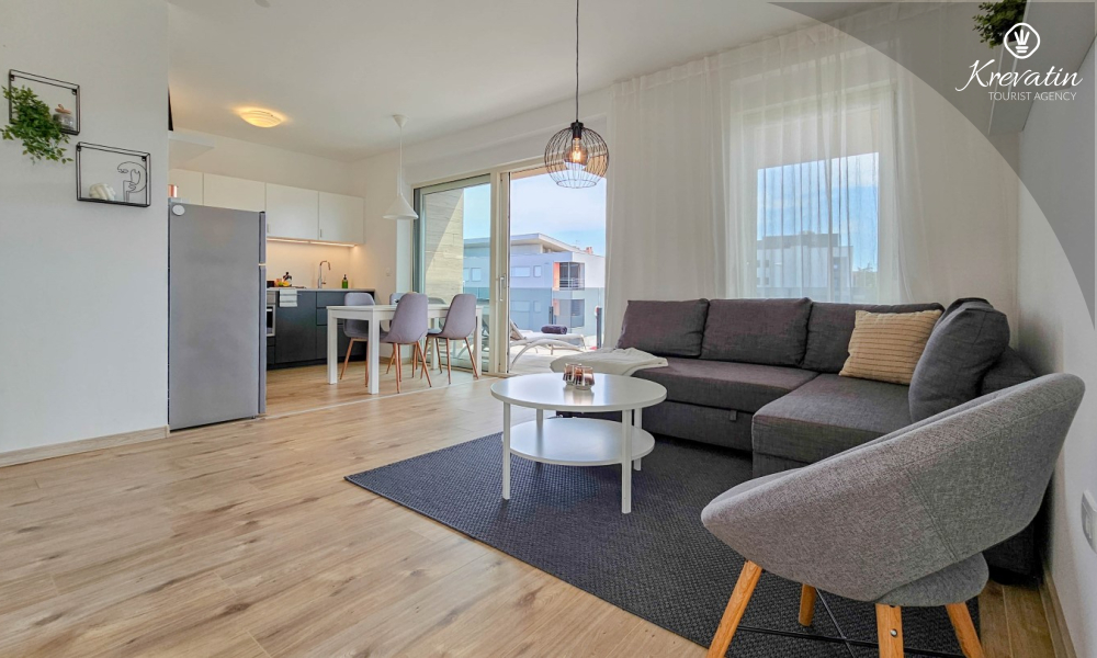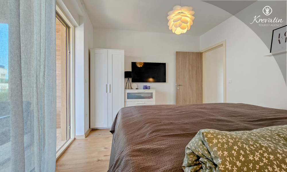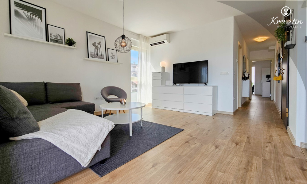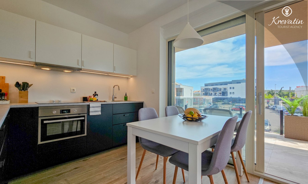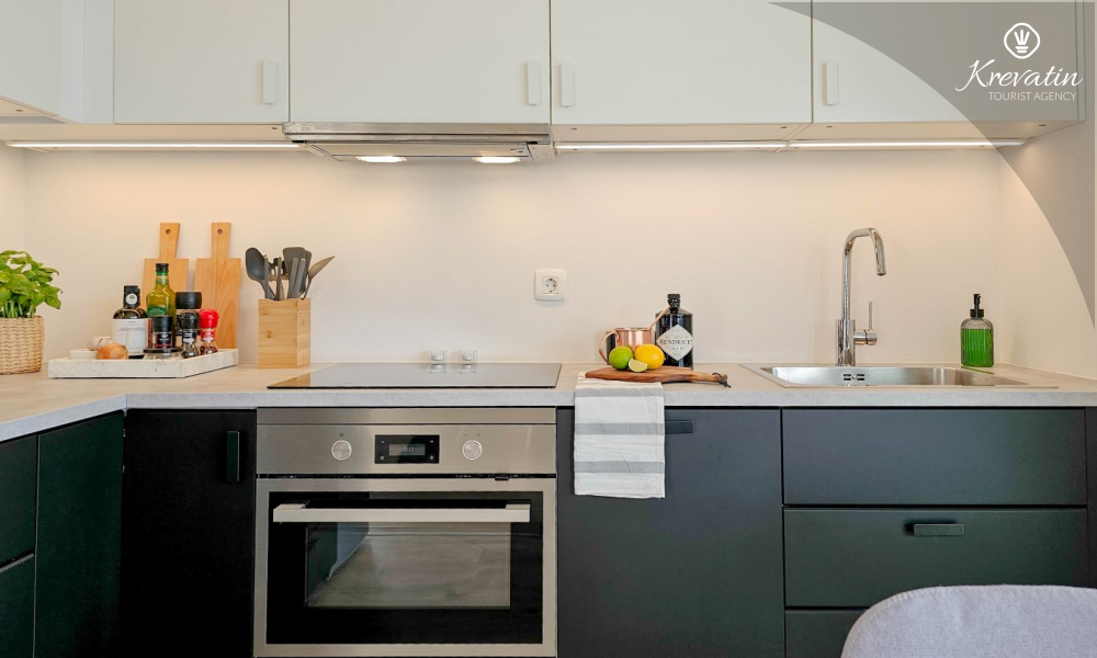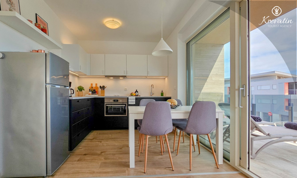 Das Apartment verfügt über zwei Schlafzimmer, eines mit einem Doppelbett und das andere mit einem Etagenbett. Zwei weitere Gäste können auf einem Schlafsofa im Wohnzimmer übernachten. Die moderne Küche ist mit allem Nötigen zur Zubereitung von Mahlzeiten ausgestattet.
