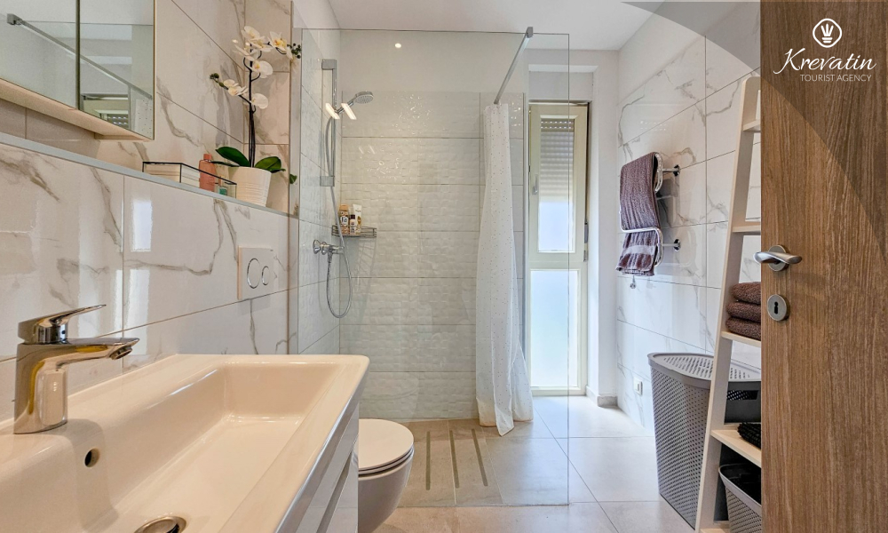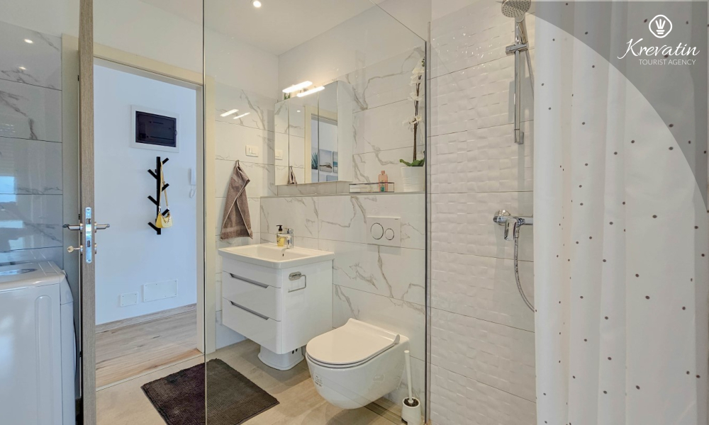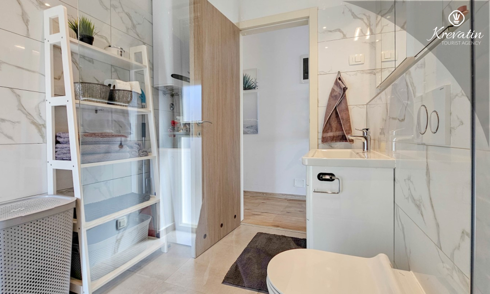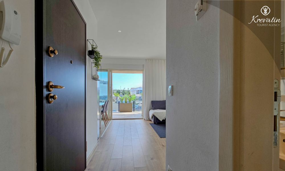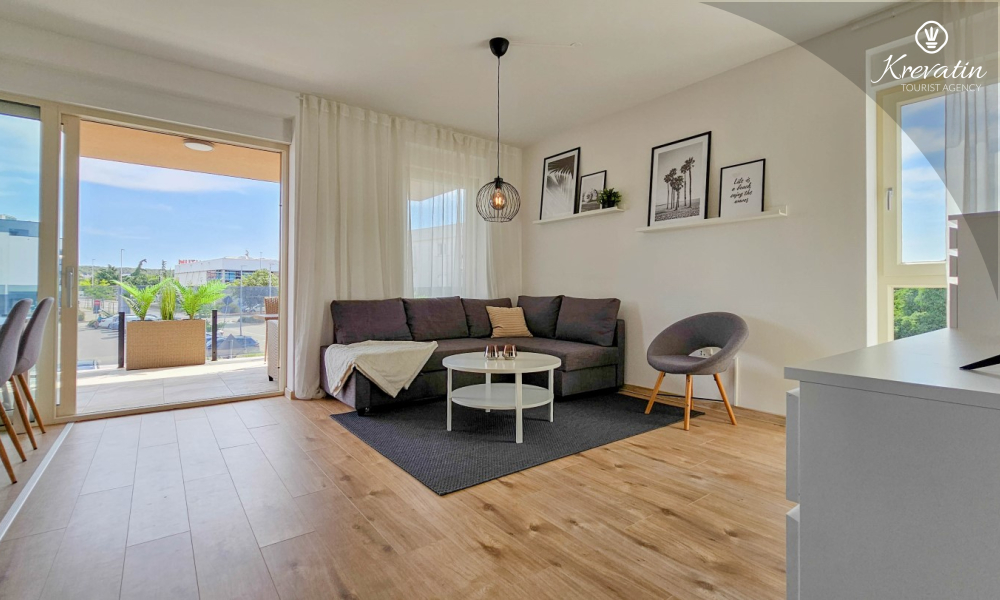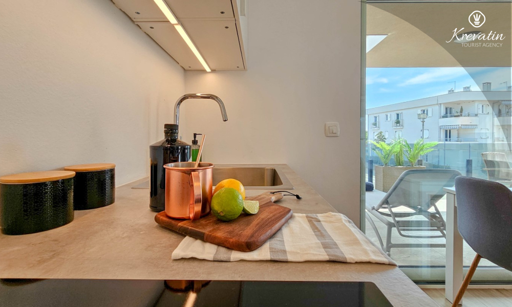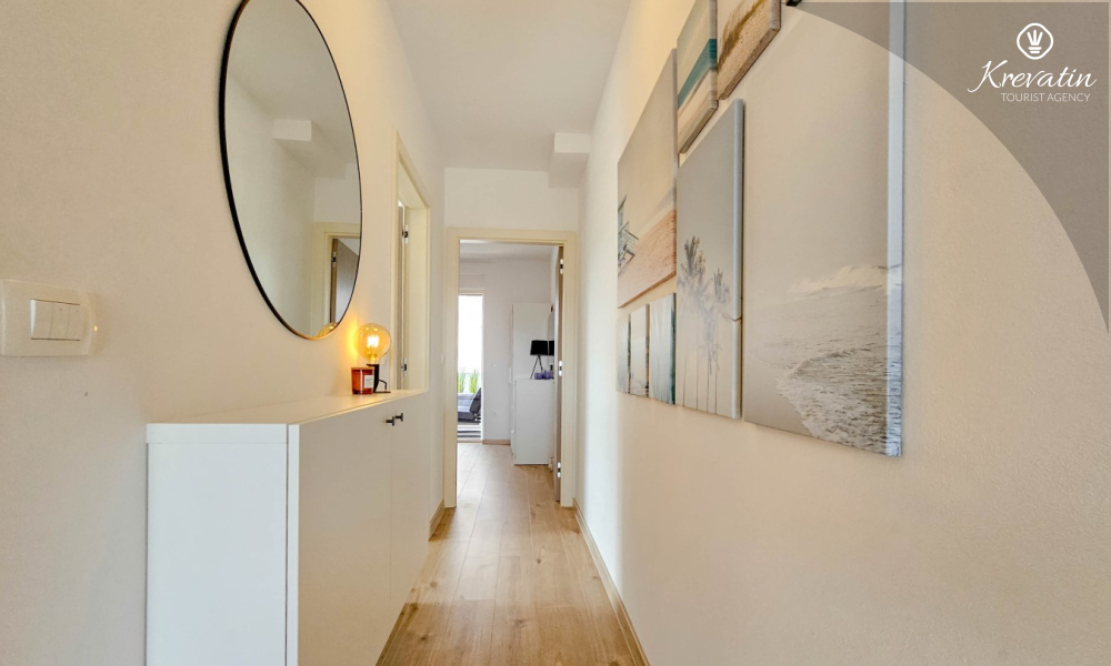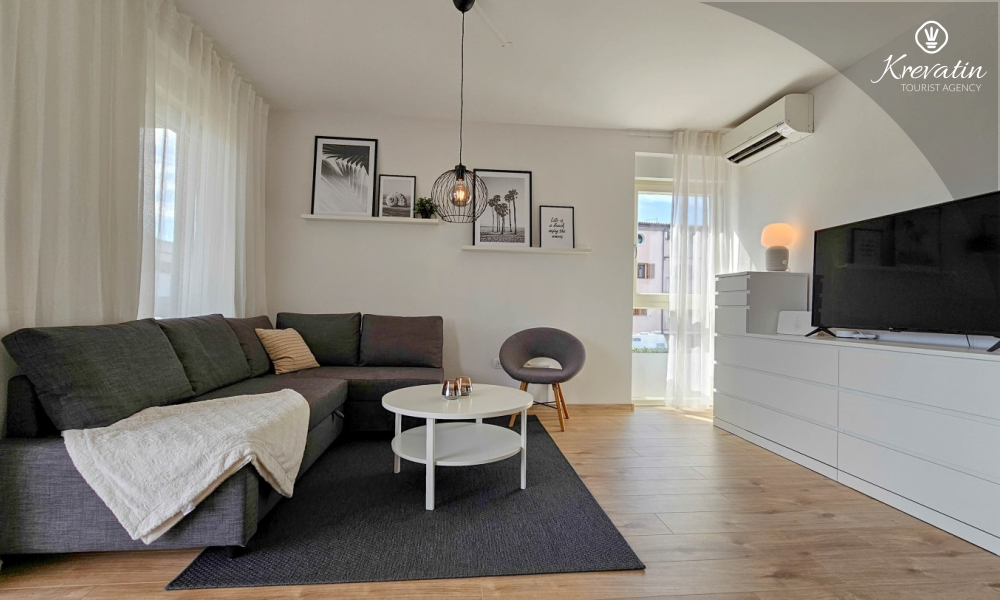 Das Apartment verfügt über zwei Schlafzimmer, eines mit einem Doppelbett und das andere mit einem Etagenbett. Zwei weitere Gäste können auf einem Schlafsofa im Wohnzimmer übernachten. Die moderne Küche ist mit allem Nötigen zur Zubereitung von Mahlzeiten ausgestattet.