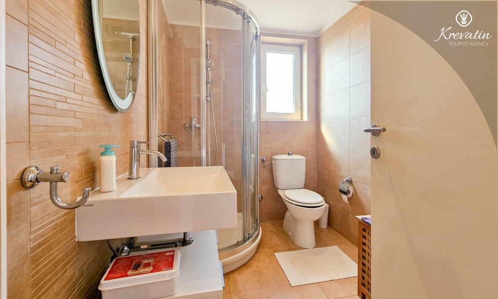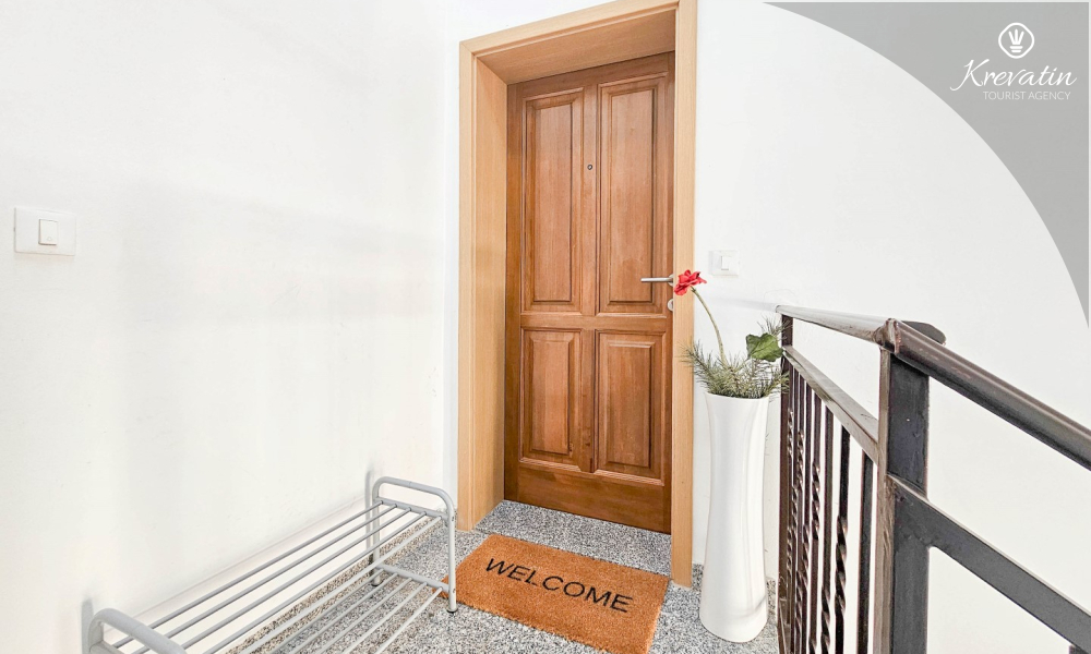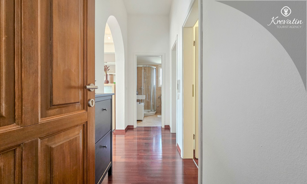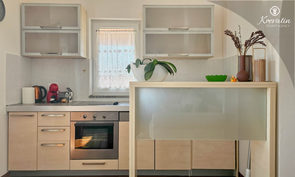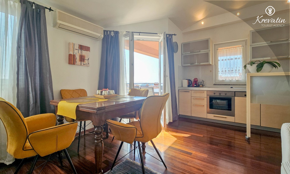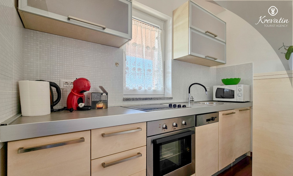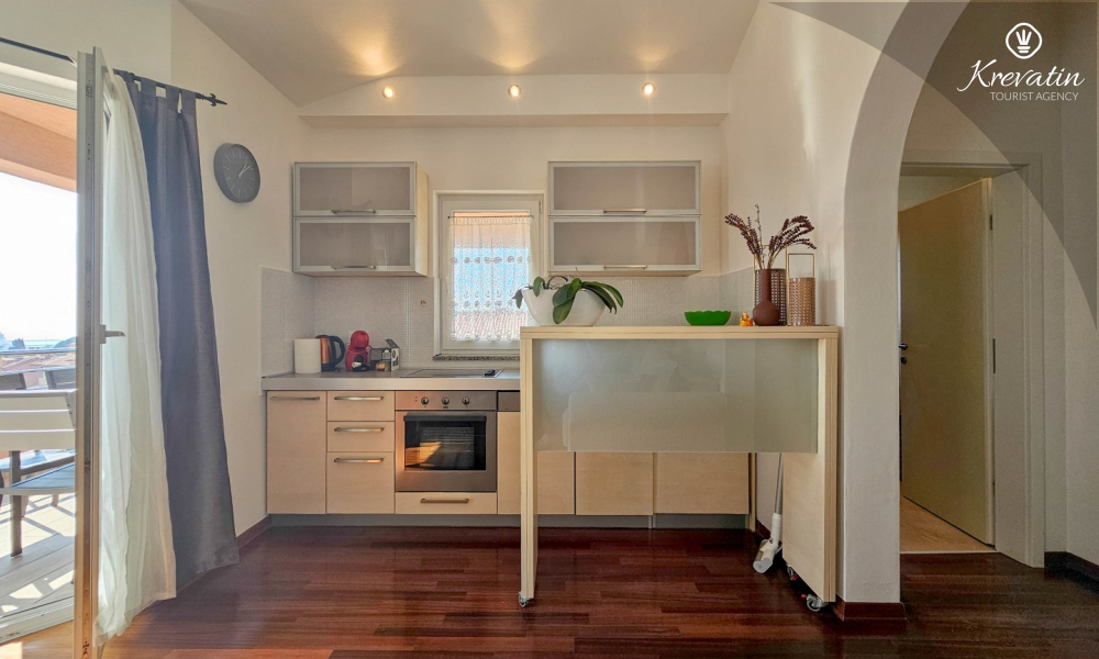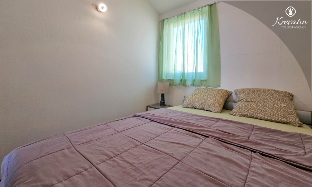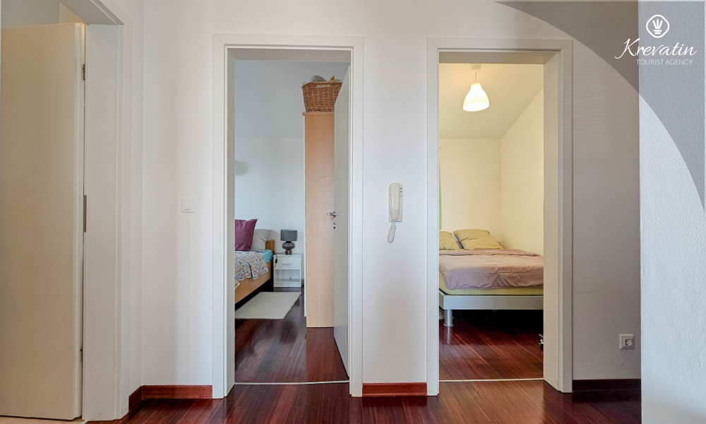 Die Wohnung besteht aus zwei Schlafzimmern, beide mit Doppelbetten ausgestattet, die nach einem Tag voller Erkundungen einen ruhigen Schlaf garantieren. Die Küche mit Wohnzimmer und Essbereich bietet Funktionalität und Komfort und ist mit den grundlegenden Annehmlichkeiten für die Zubereitung köstlicher Mahlzeiten ausgestattet. Das Wohnzimmer ist der ideale Ort zum Entspannen mit einem Fernseher oder zum geselligen Beisammensein, und der Zugang zum Balkon ermöglicht es, die frische Luft und die herrliche Aussicht zu genießen.