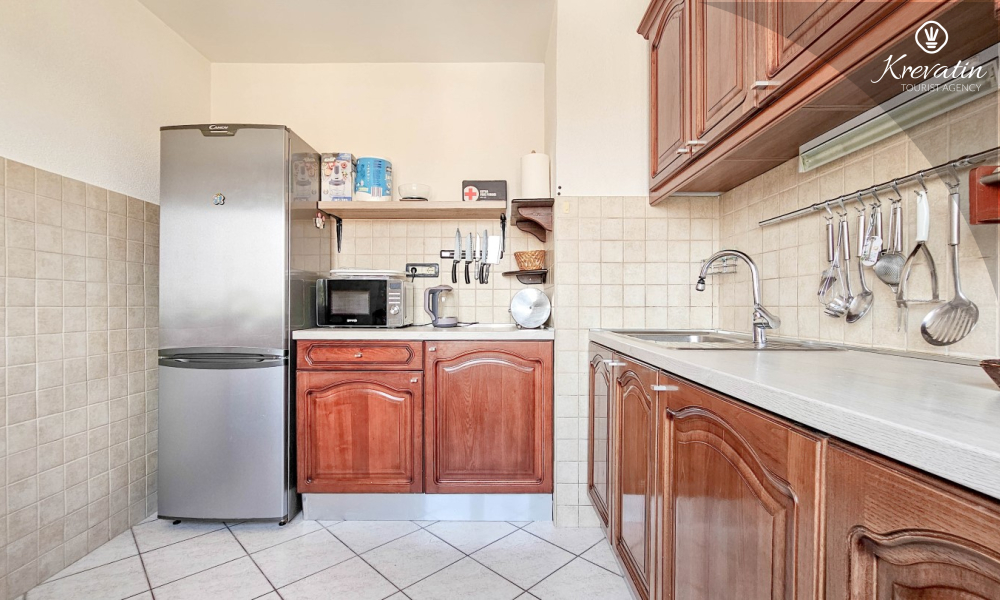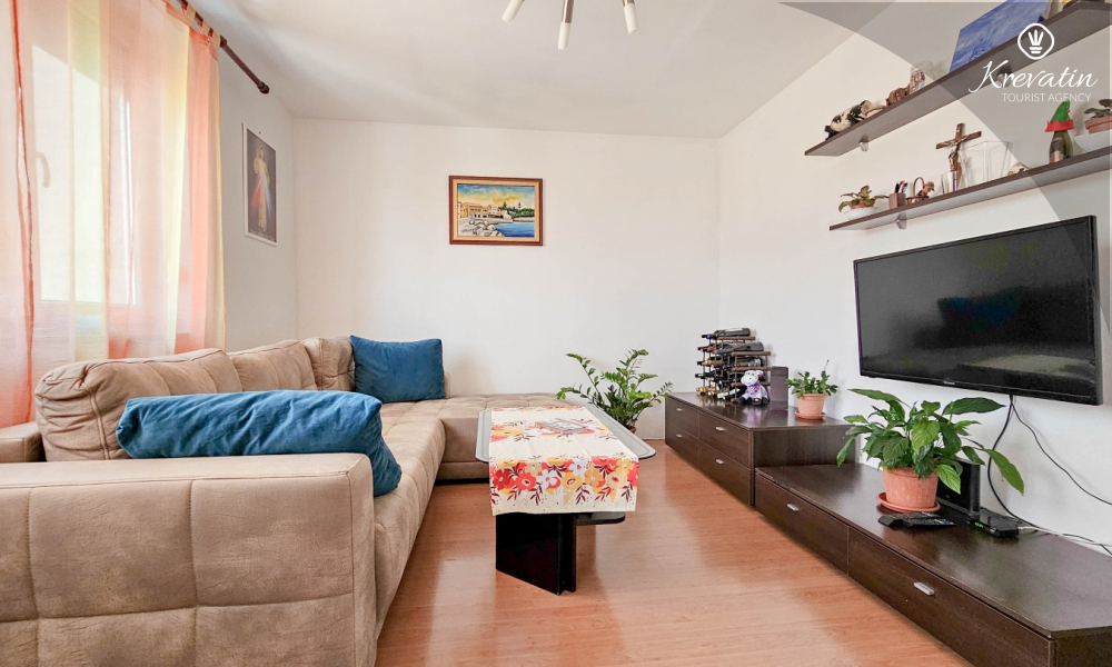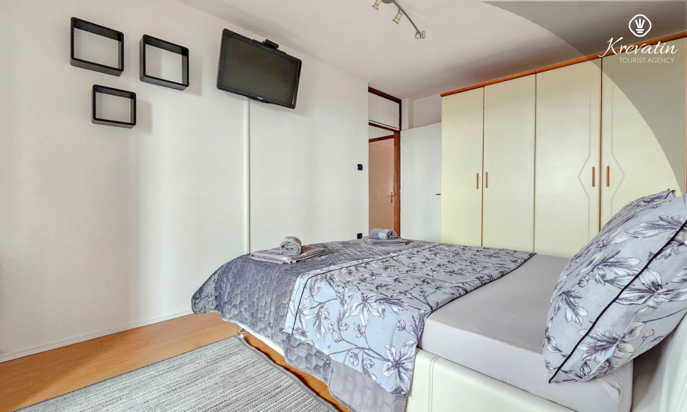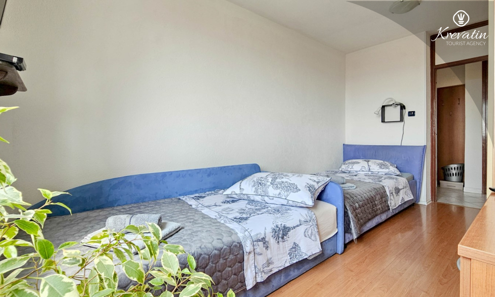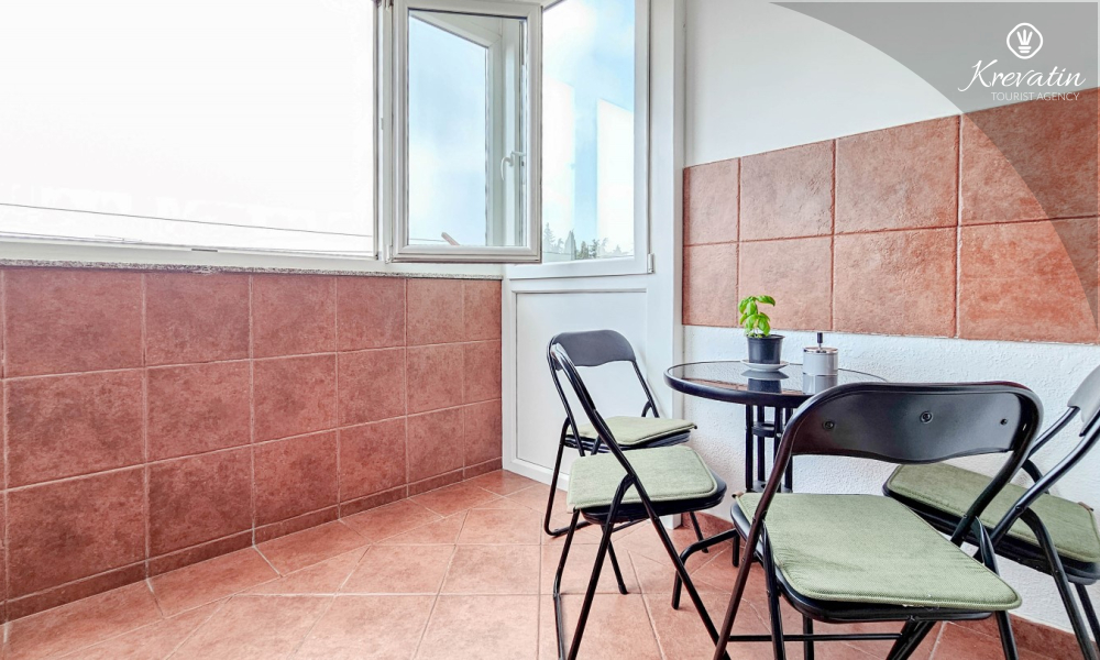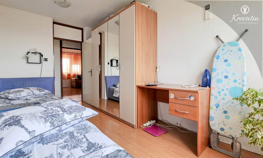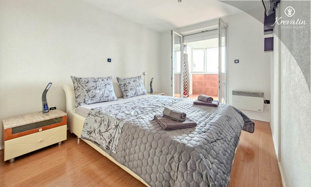 Es verfügt über zwei Schlafzimmer – eines mit einem Doppelbett und das andere mit zwei Einzelbetten – sowie ein geräumiges Wohnzimmer mit einer Küche, die mit den wichtigsten Annehmlichkeiten ausgestattet ist. Das Badezimmer ist mit Badewanne, Dusche und WC ausgestattet. Vom Hauptschlafzimmer aus gelangt man auf einen Balkon mit Gartenmöbeln – ideal für den Morgenkaffee oder zum Entspannen am Abend.