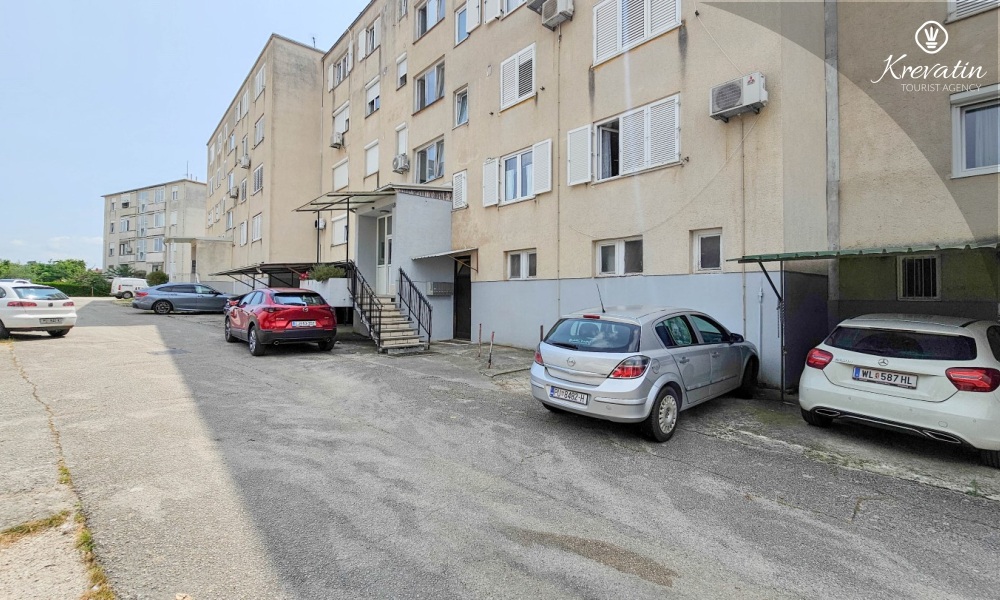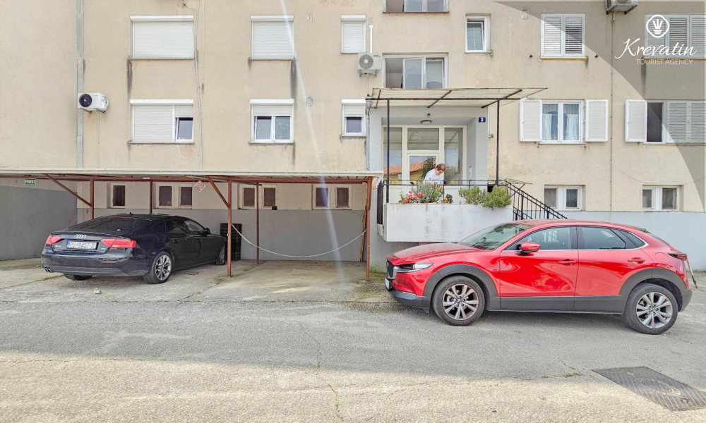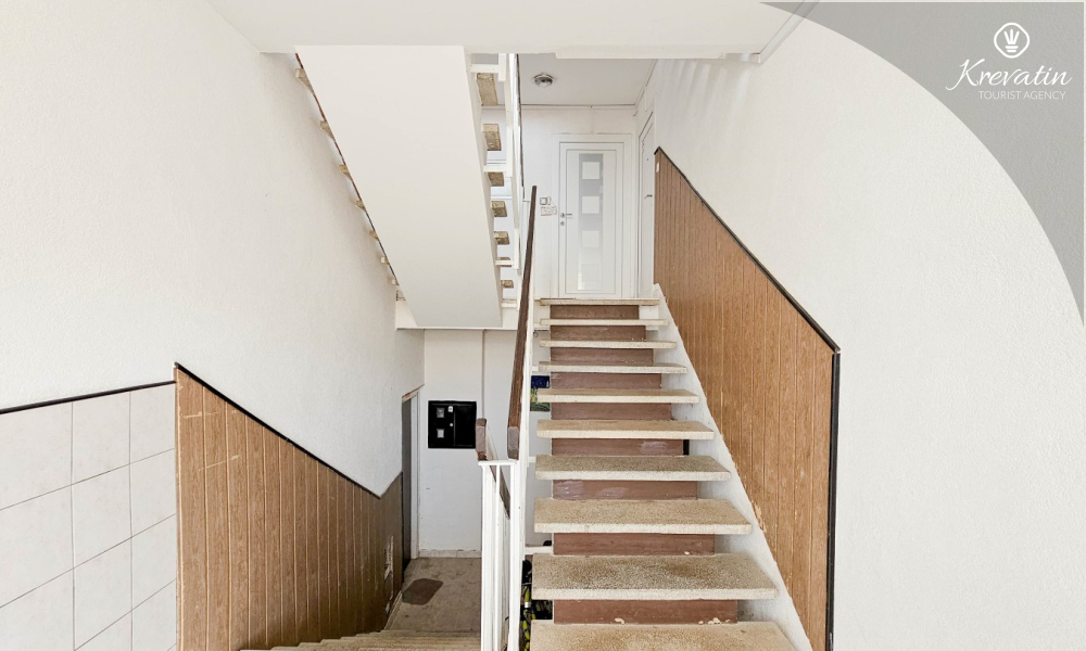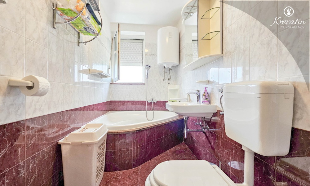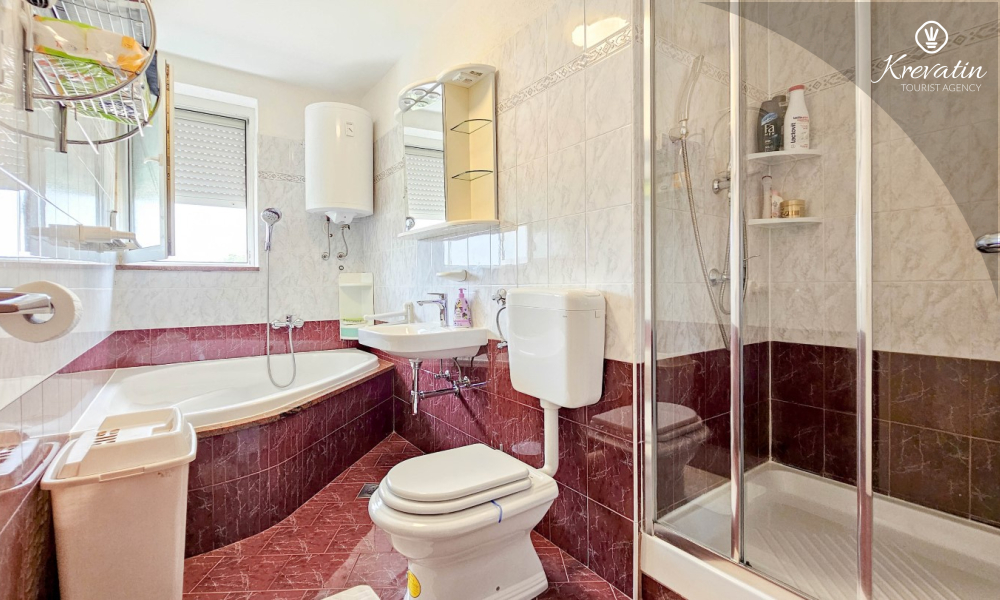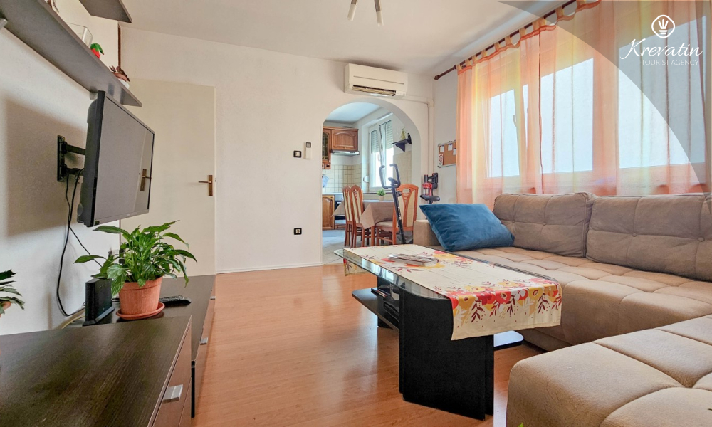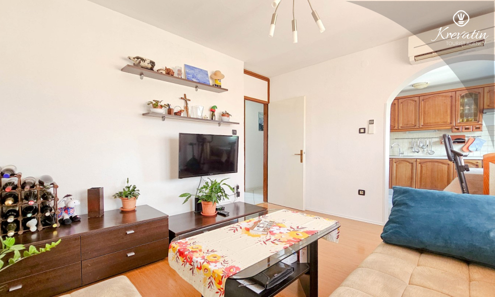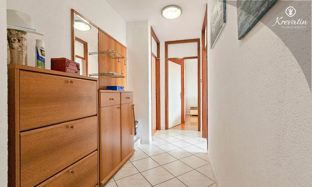 Es verfügt über zwei Schlafzimmer – eines mit einem Doppelbett und das andere mit zwei Einzelbetten – sowie ein geräumiges Wohnzimmer mit einer Küche, die mit den wichtigsten Annehmlichkeiten ausgestattet ist. Das Badezimmer ist mit Badewanne, Dusche und WC ausgestattet. Vom Hauptschlafzimmer aus gelangt man auf einen Balkon mit Gartenmöbeln – ideal für den Morgenkaffee oder zum Entspannen am Abend.