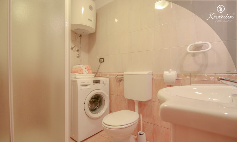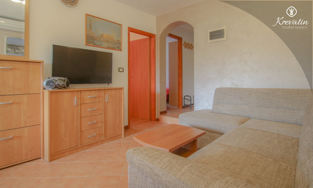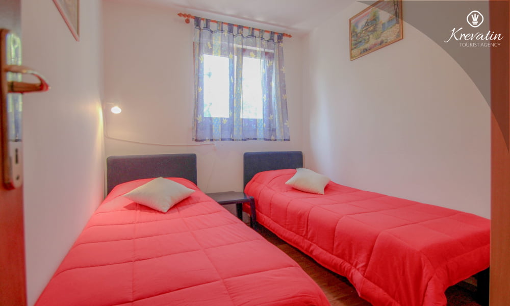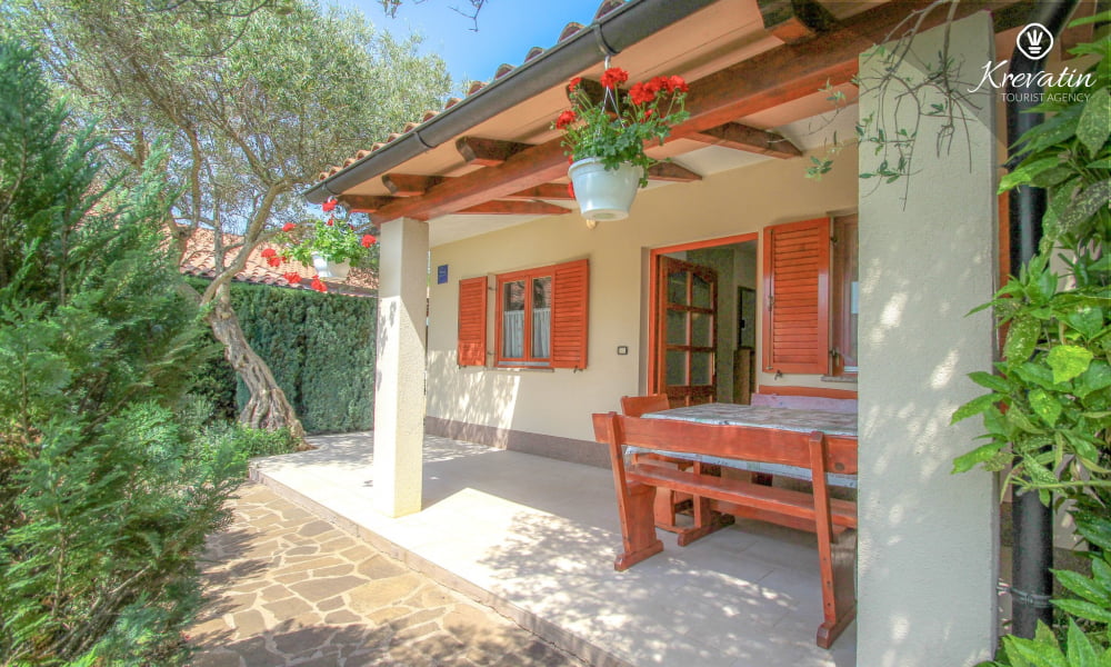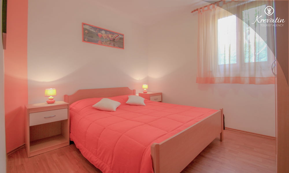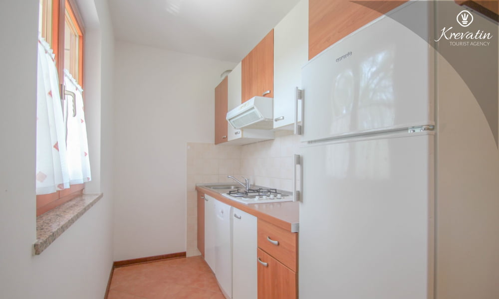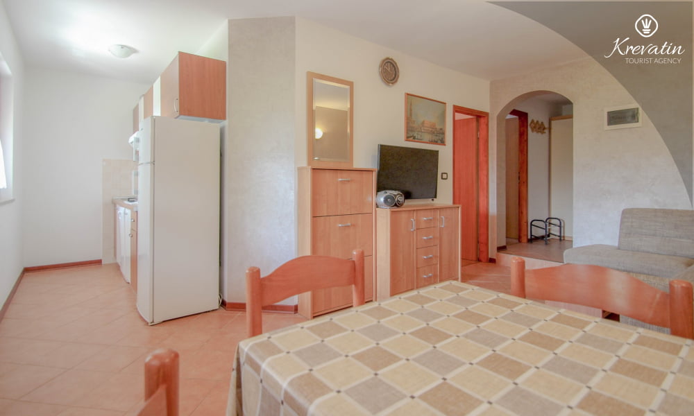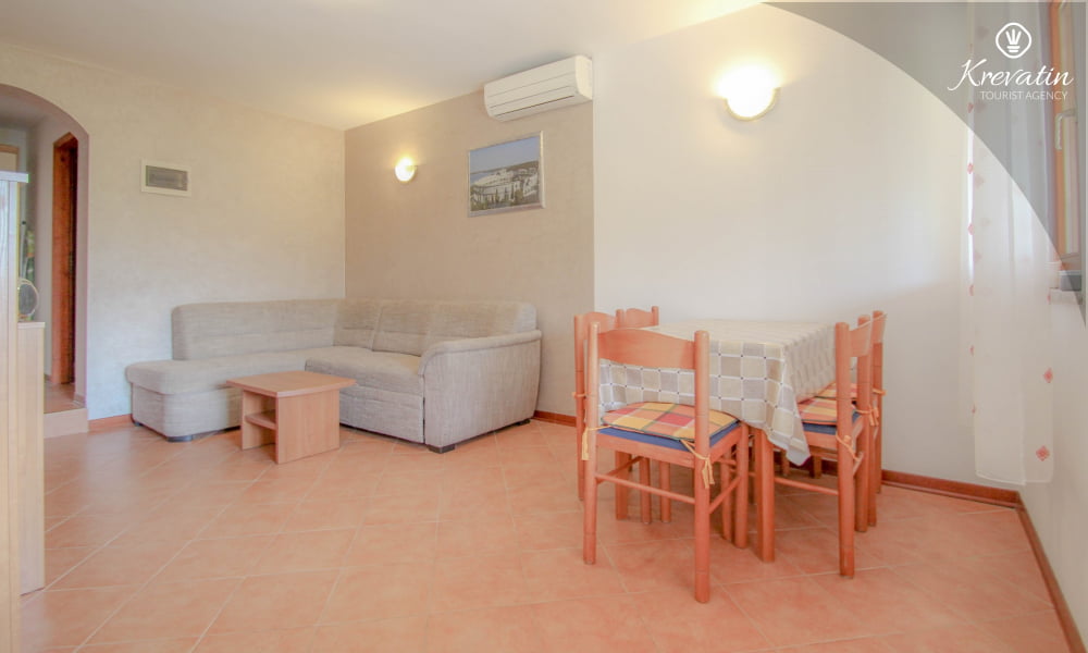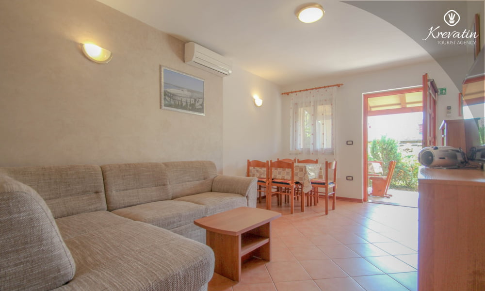 Es besteht aus einem Wohnzimmer mit Küche, zwei Schlafzimmern und einem praktisch eingerichteten Badezimmer mit Dusche, WC und Waschmaschine. Die Küche ist mit allen grundlegenden Utensilien für die Zubereitung einfacher Mahlzeiten ausgestattet. Auf der geräumigen Terrasse mit Tisch und Stühlen können Sie Mahlzeiten im Freien genießen oder gesellige Abende verbringen.