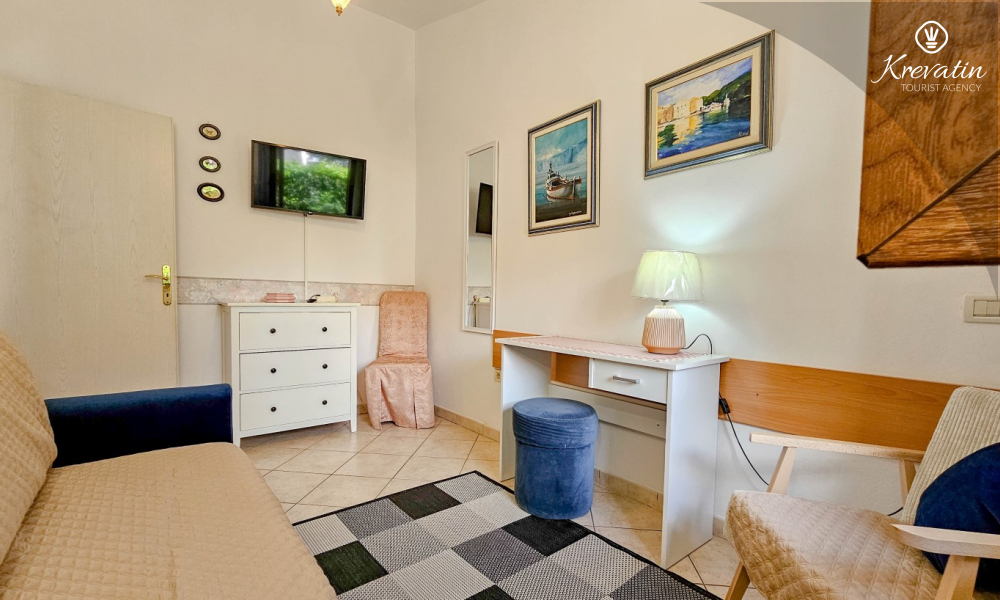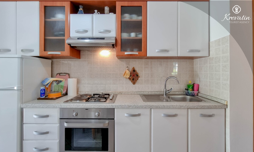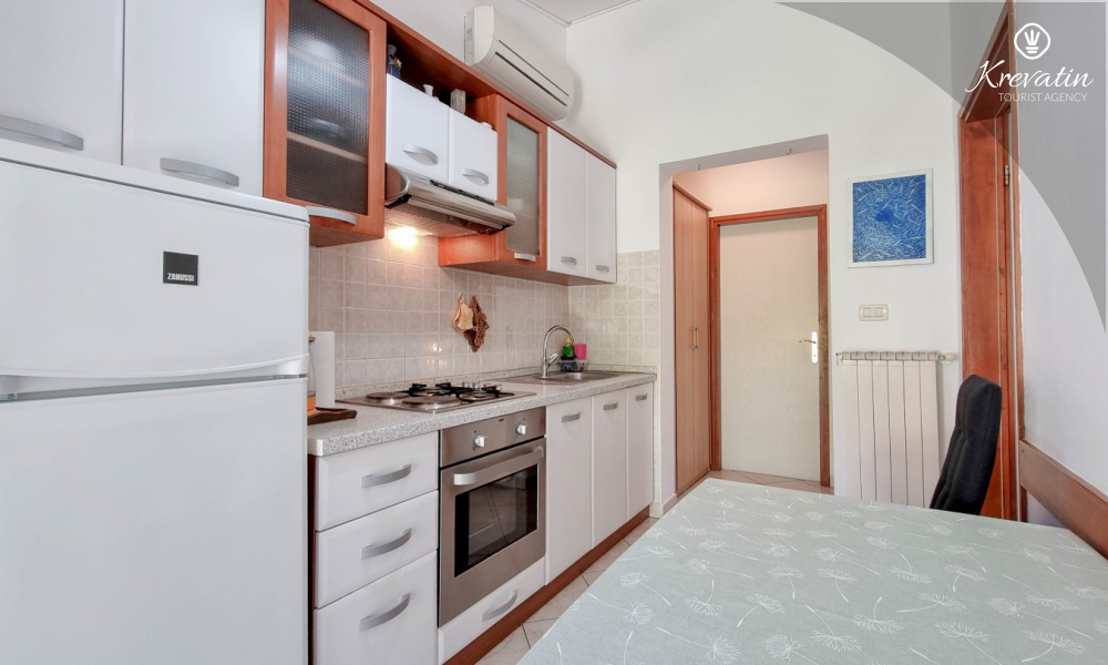 Die Wohnung verfügt über ein Schlafzimmer mit Doppelbett und ein Wohnzimmer mit einem Zustellbett für eine Persone. Das Esszimmer ist Teil der Küche, die mit den wichtigsten Utensilien zur Zubereitung von Mahlzeiten ausgestattet ist. Das praktische Badezimmer verfügt über eine Dusche und eine Toilette. Auf der Terrasse können Sie nach einem Tag in der Sonne und am Strand einen Kaffee, ein Buch oder abends ein Glas Wein genießen.