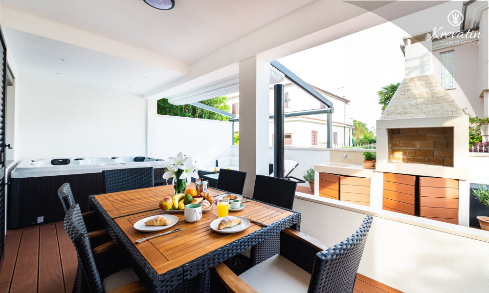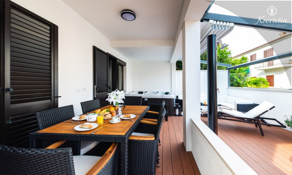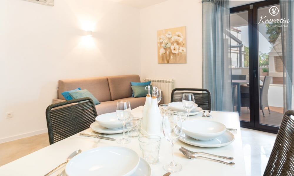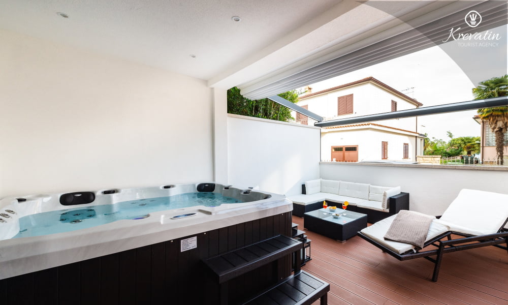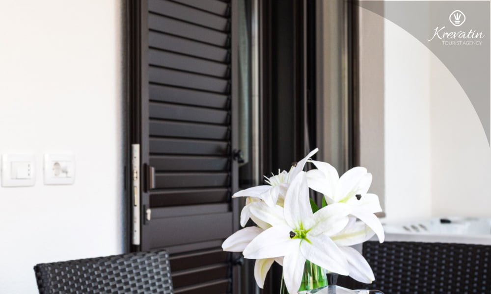 Diese Apartment für 4-6 Personen, im Erdgeschoss gelegen, besteht aus drei Schlafzimmern (zwei mit Doppelbett und eins mit ein Sofabett), ein Wohnzimmer und eine Küche mit Esszimmer. Die Küche ist mit Elektroherd, Backofen, Kühlschrank, Mikrowelle, Spülmaschine und Kaffeemaschine ausgestattet. Desweiteren gibt es ein Badezimmer mit Dusche und Toilete, eine weitere Toilete sowie eine grosse Terrasse mit Terrassenmöbeln und mit Whirlpool. Inklusive sind SAT-TV, Klimaanlage, WLAN, Waschmaschine, Bettwäsche und Handtücher. Haustiere sind nicht erlaubt.