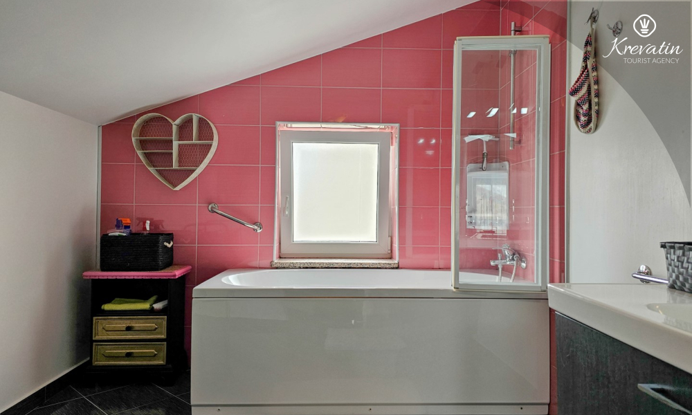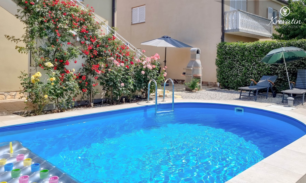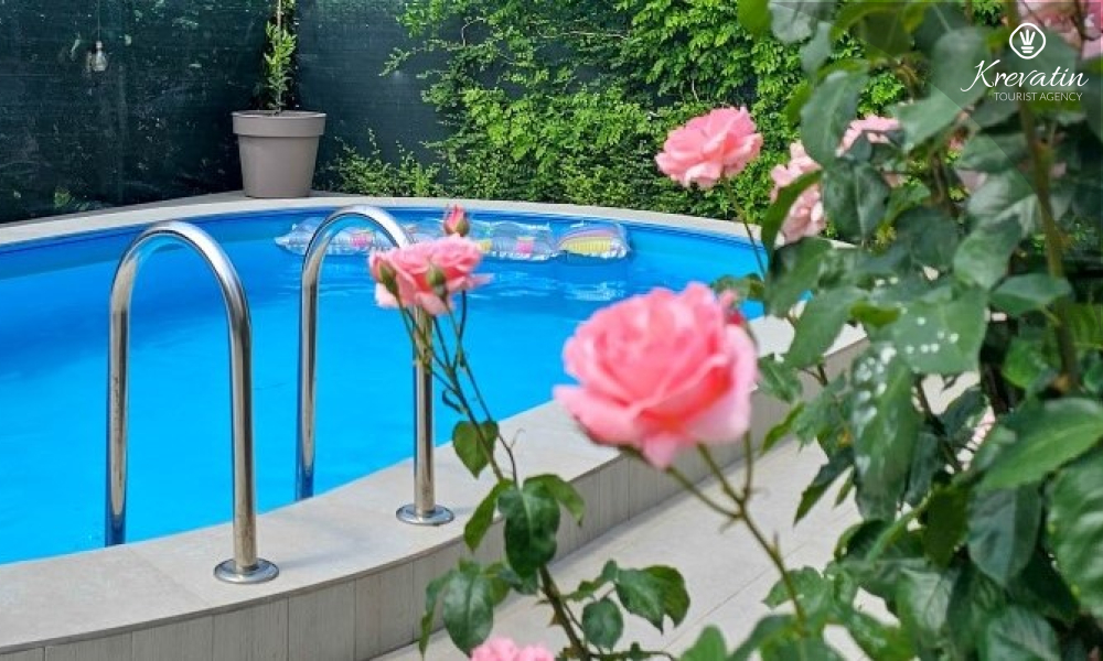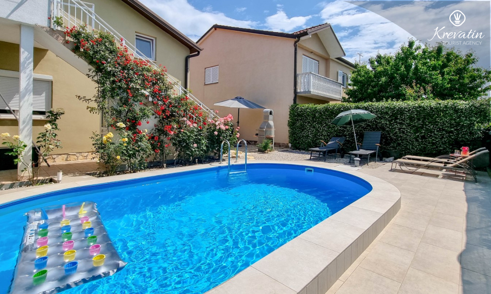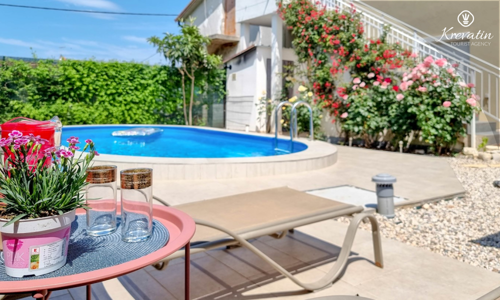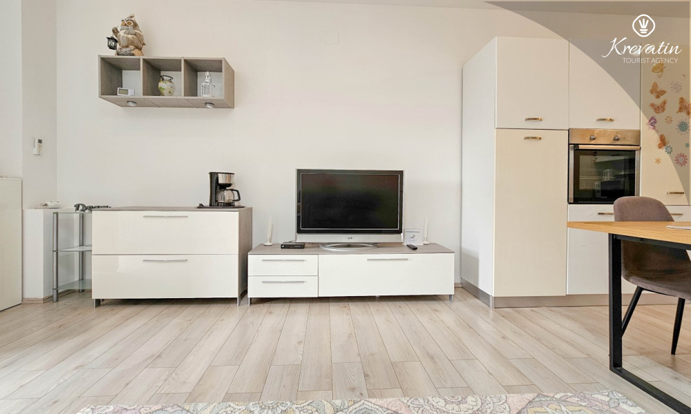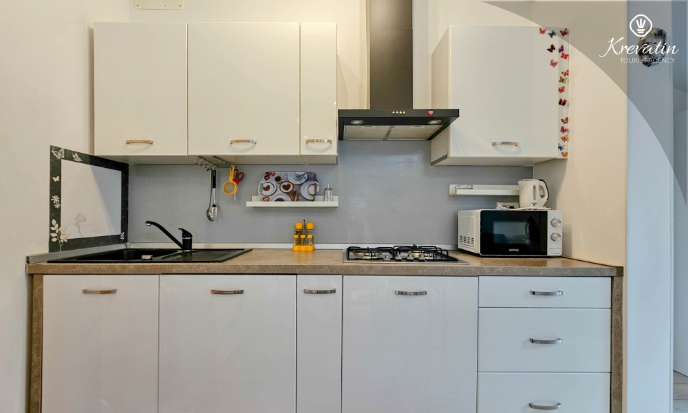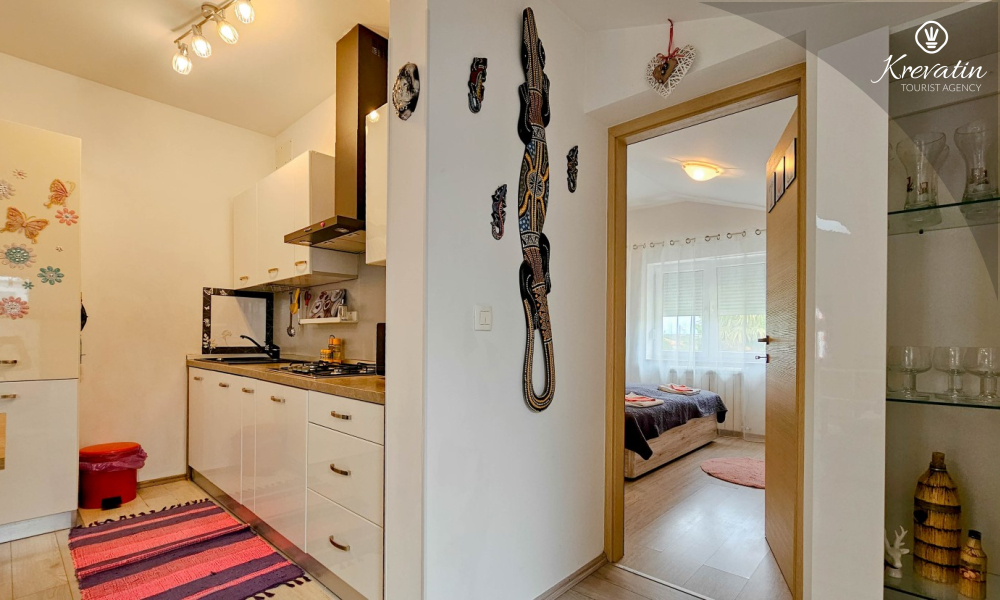 Die Wohnung besteht aus zwei komfortablen Schlafzimmern, einem geräumigen Wohnzimmer, einem Balkon mit schöner Aussicht und einer modernen Küche, die mit allen notwendigen Geräten ausgestattet ist, darunter Gas-/Elektroherd, Backofen, Geschirrspüler, Kühlschrank, Mikrowelle und Kaffeemaschine. In unserem umzäunten Garten finden Sie einen privaten Swimmingpool mit Liegestühlen, einer Außendusche und einem Grill – der perfekte Ort, um sonnige Tage und warme Abende zu genießen.