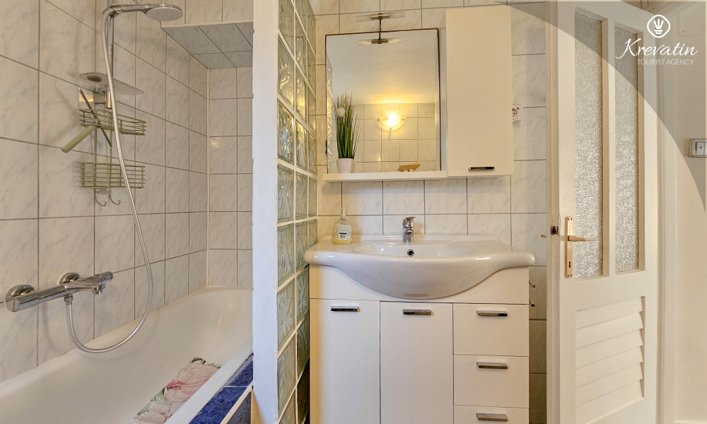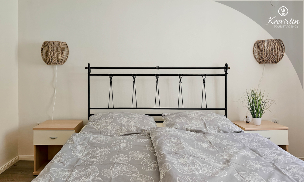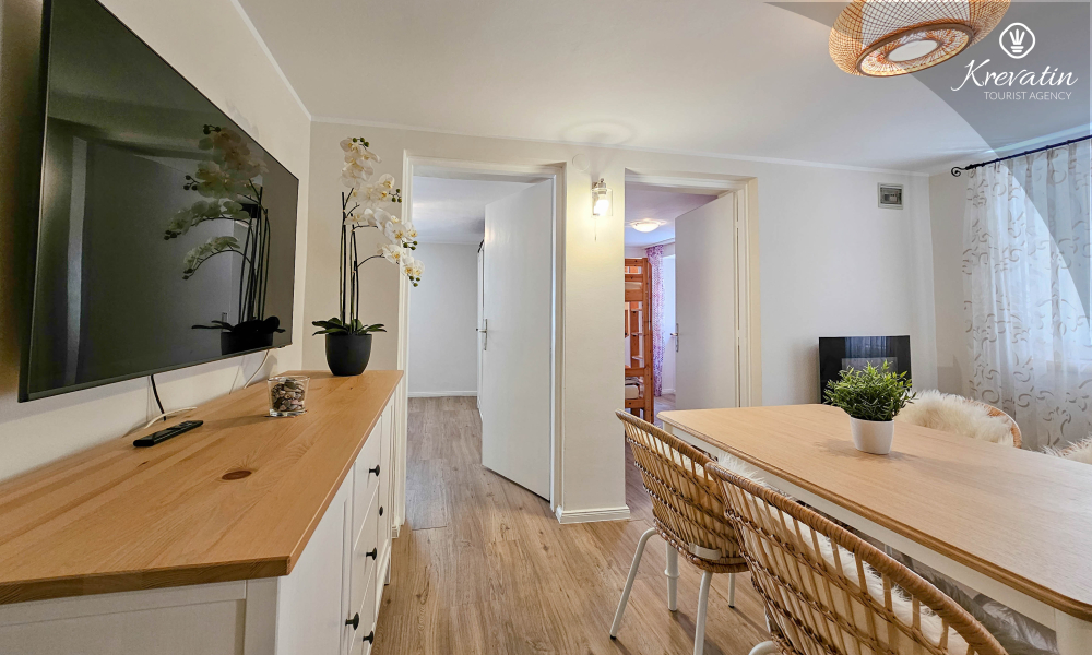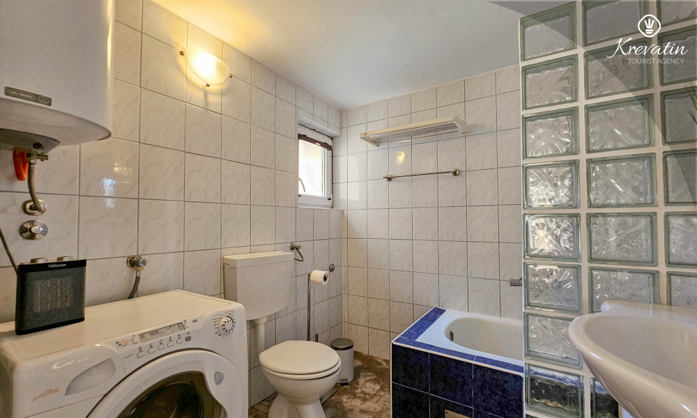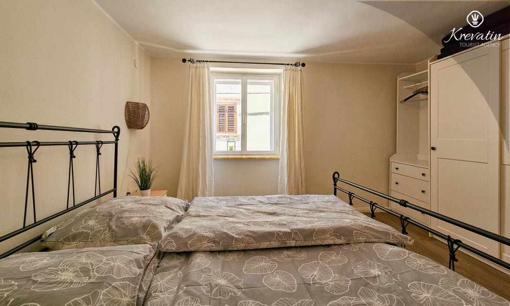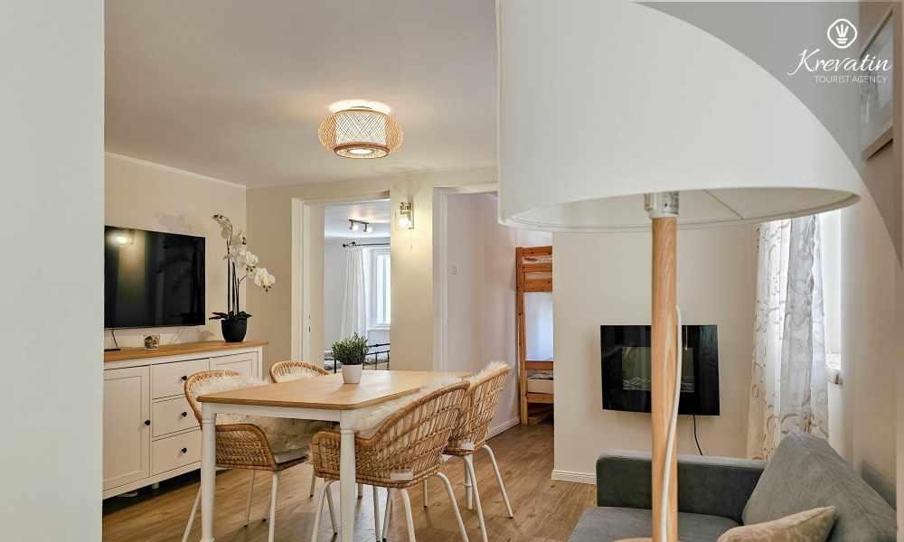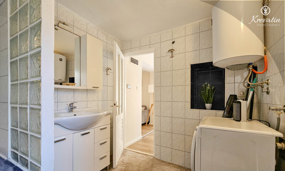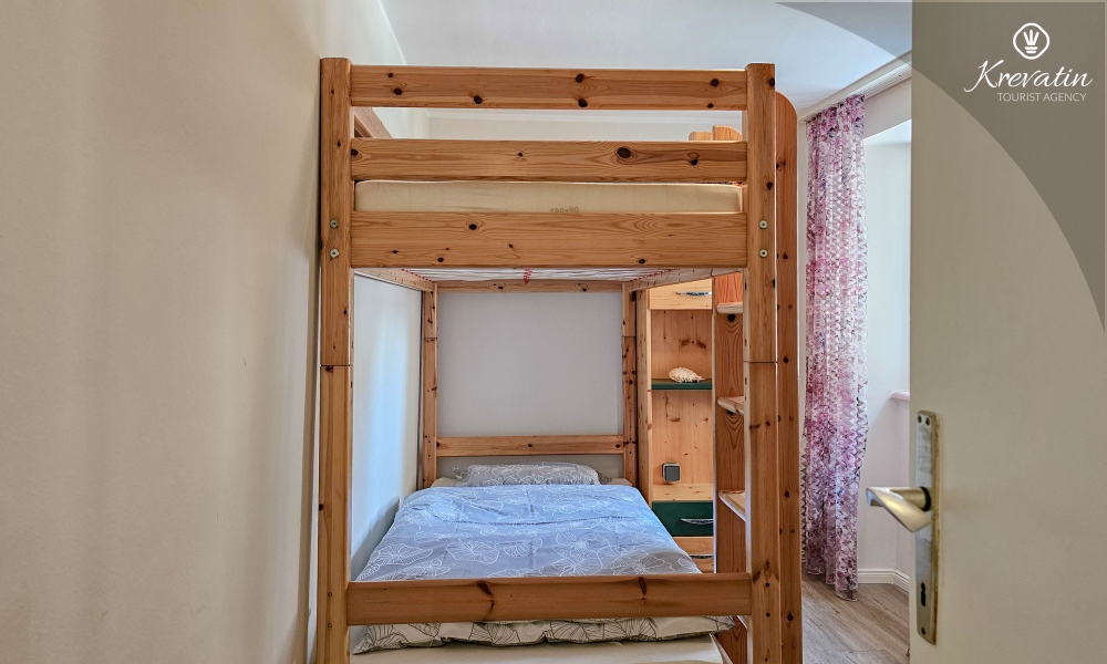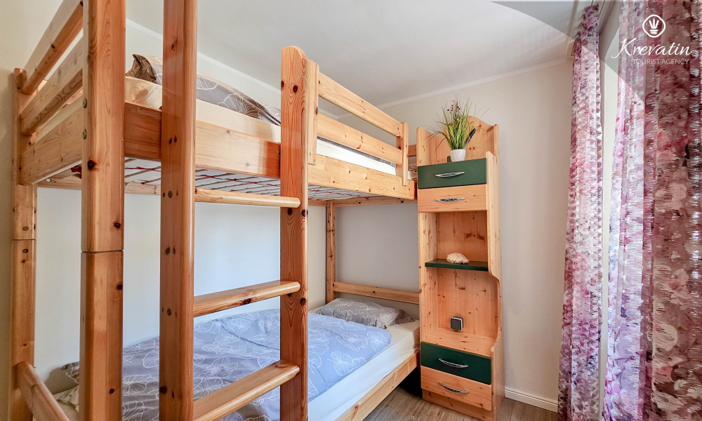 Die Wohnung verfügt über zwei Schlafzimmer. Das erste Zimmer verfügt über ein bequemes Doppelbett, ideal für eine erholsame Nachtruhe. Das zweite Zimmer ist mit einem Etagenbett ausgestattet, ideal für gemeinsam reisende Familien oder Freunde. Das Badezimmer ist schön eingerichtet und verfügt zu Ihrer Bequemlichkeit über eine Waschmaschine.