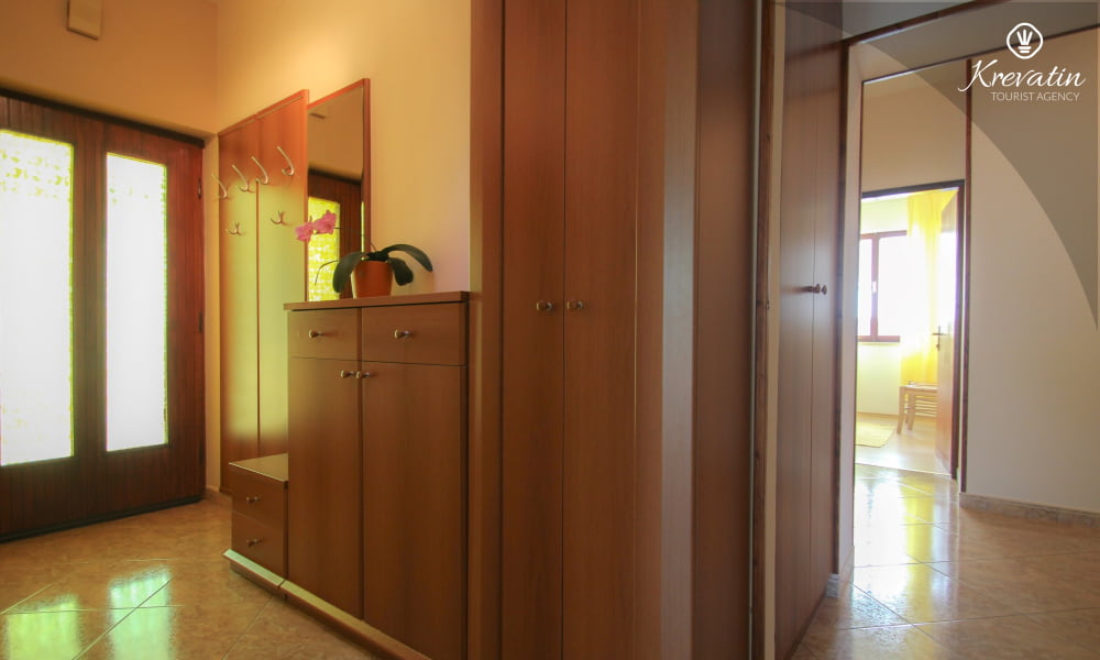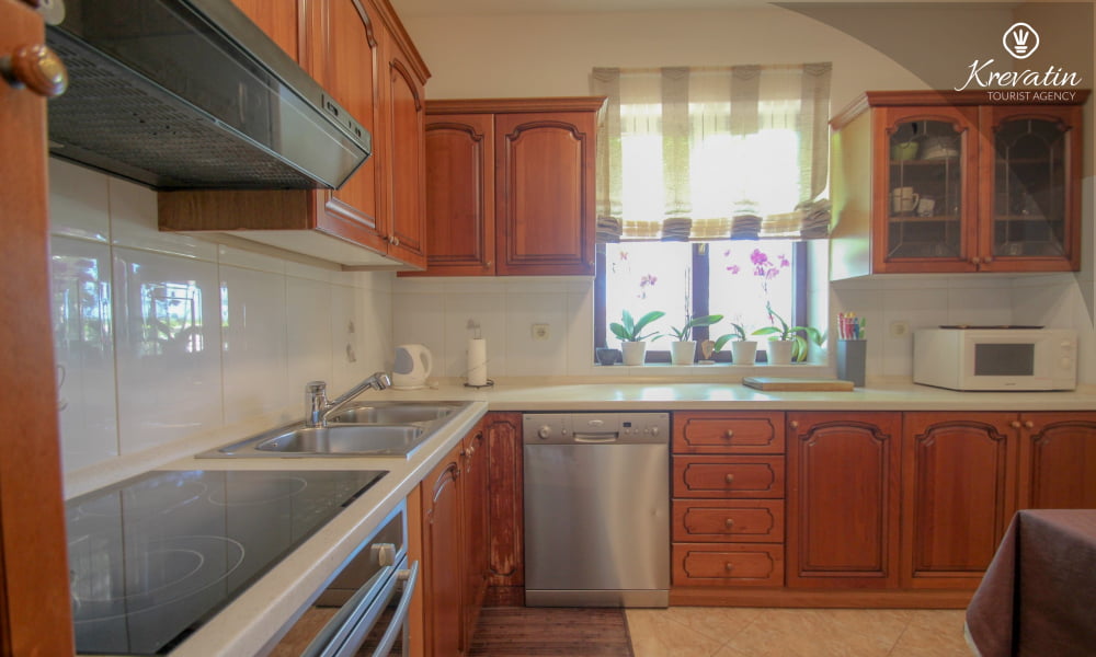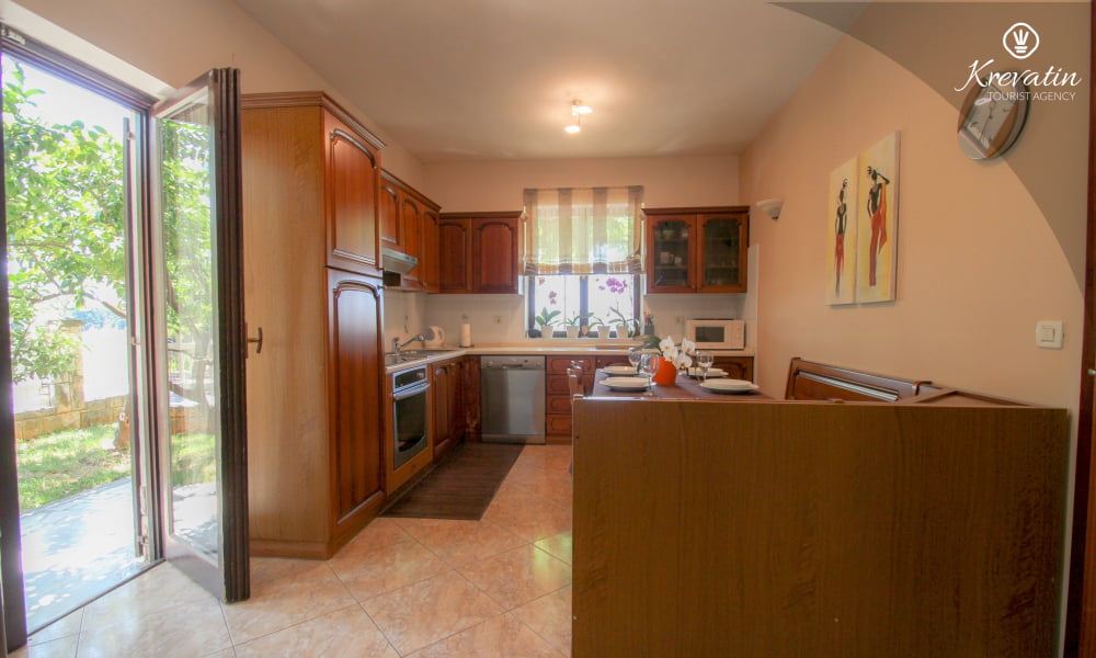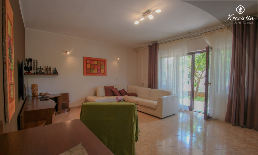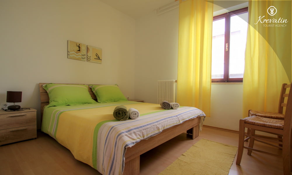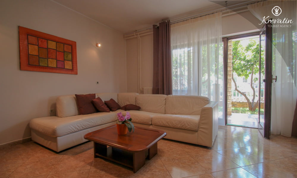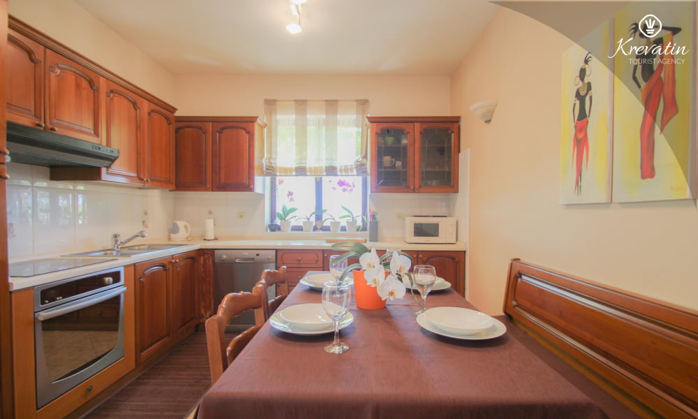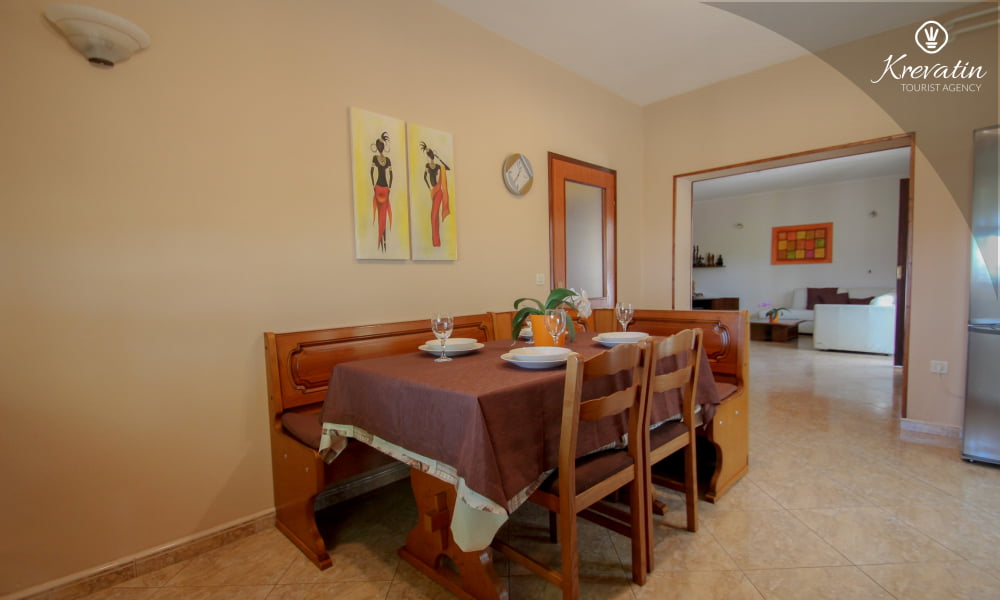 Die Wohnung besteht aus zwei komfortablen Schlafzimmern mit Doppelbetten, ideal zum Entspannen nach einem Tag in der Sonne. Das Wohnzimmer mit einer Schlafcouch bietet zusätzlichen Platz zum Entspannen. Die Küche ist mit allem Nötigen für die Zubereitung köstlicher Speisen ausgestattet und es gibt auch einen Speisesaal für gemeinsame Mahlzeiten.