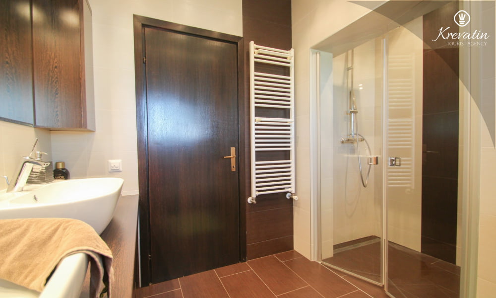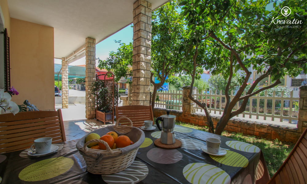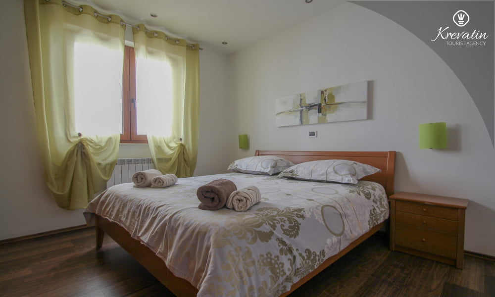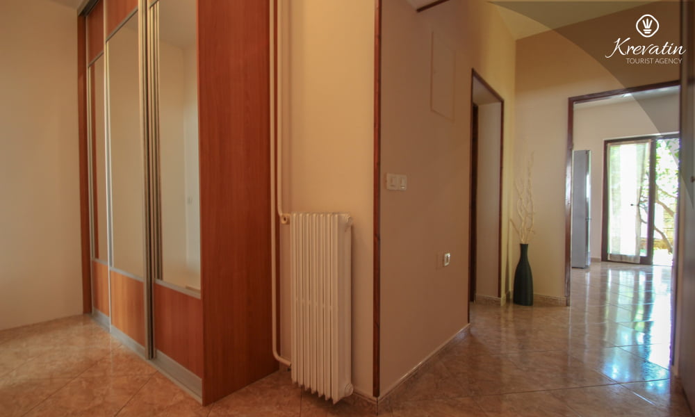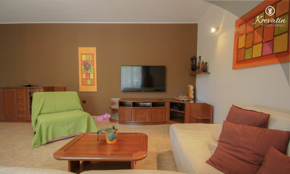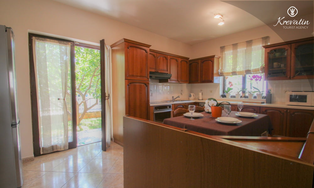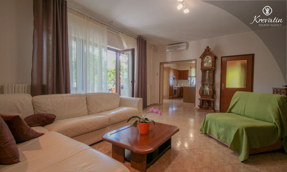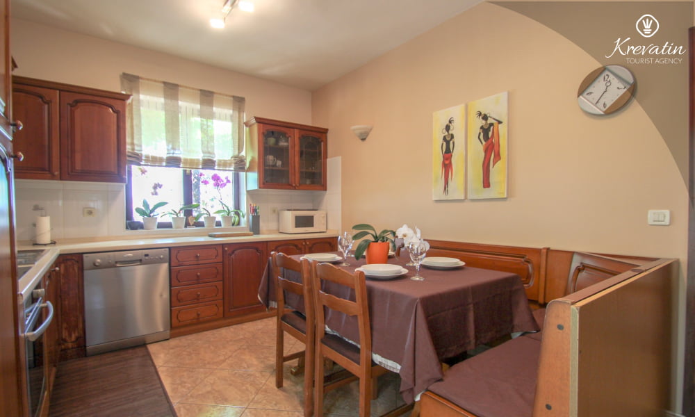 Die Wohnung besteht aus zwei komfortablen Schlafzimmern mit Doppelbetten, ideal zum Entspannen nach einem Tag in der Sonne. Das Wohnzimmer mit einer Schlafcouch bietet zusätzlichen Platz zum Entspannen. Die Küche ist mit allem Nötigen für die Zubereitung köstlicher Speisen ausgestattet und es gibt auch einen Speisesaal für gemeinsame Mahlzeiten.