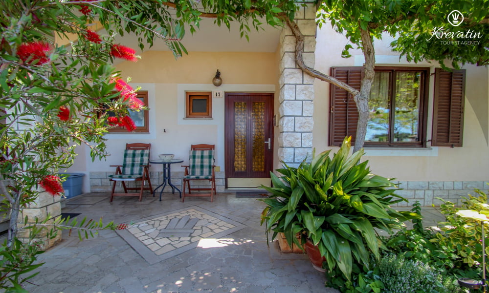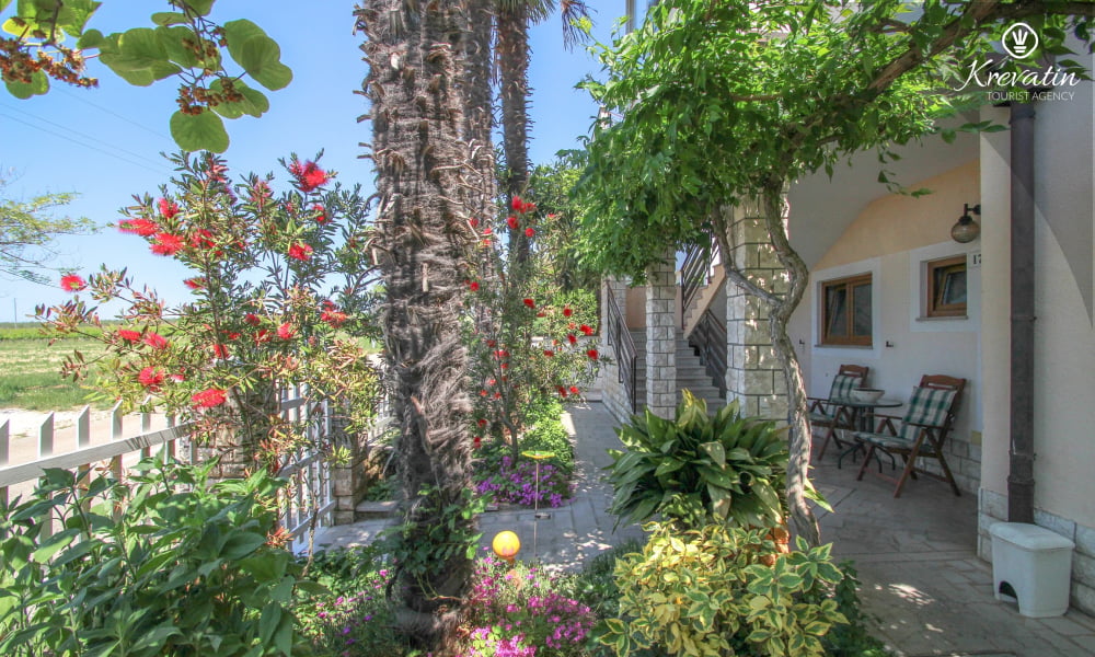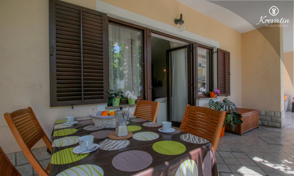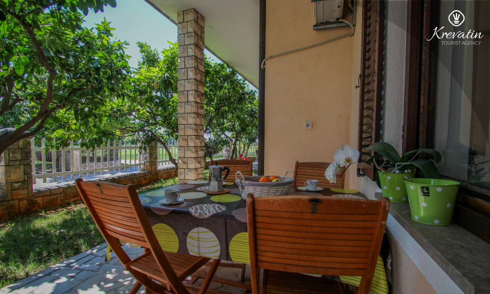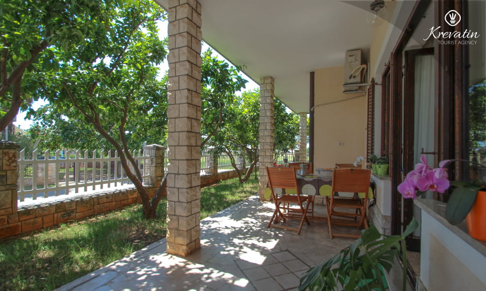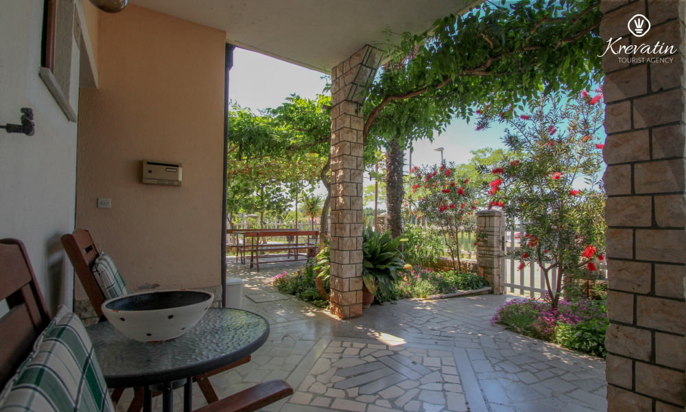 Die Wohnung verfügt über eine schöne Terrasse mit Blick auf den Garten, wo Sie entspannen und die Abende bei einem Glas Wein genießen können. Die Unterkunft bietet alles, was Sie für einen unbeschwerten Urlaub benötigen: SAT-TV, Klimaanlage, WLAN, Bettwäsche und Handtücher sind im Preis inbegriffen.