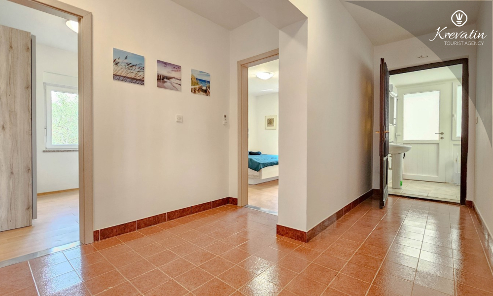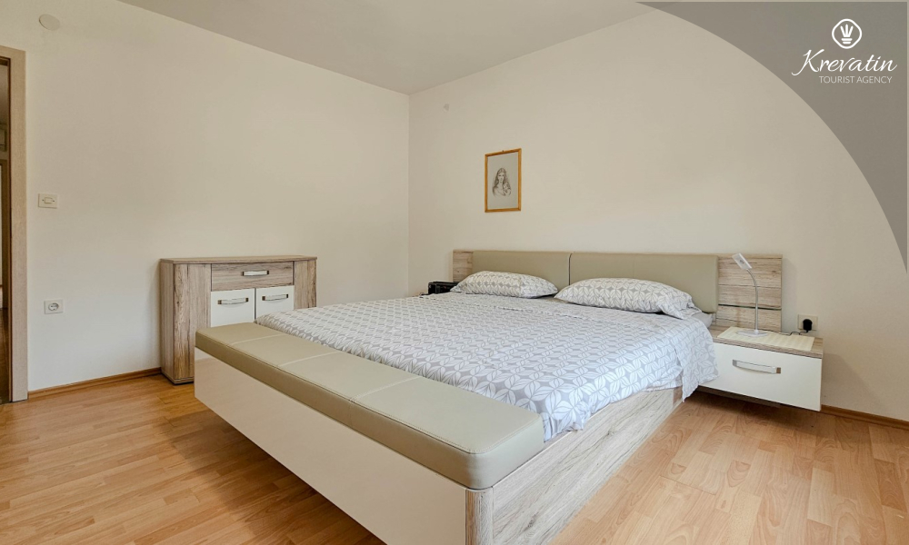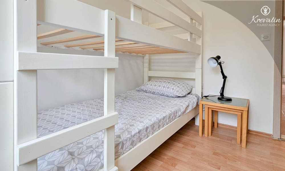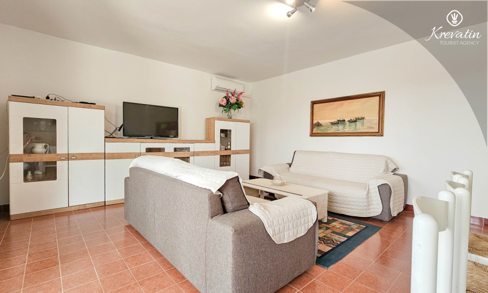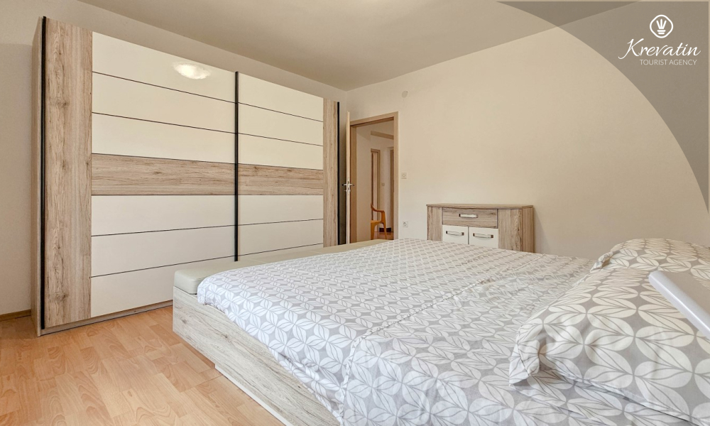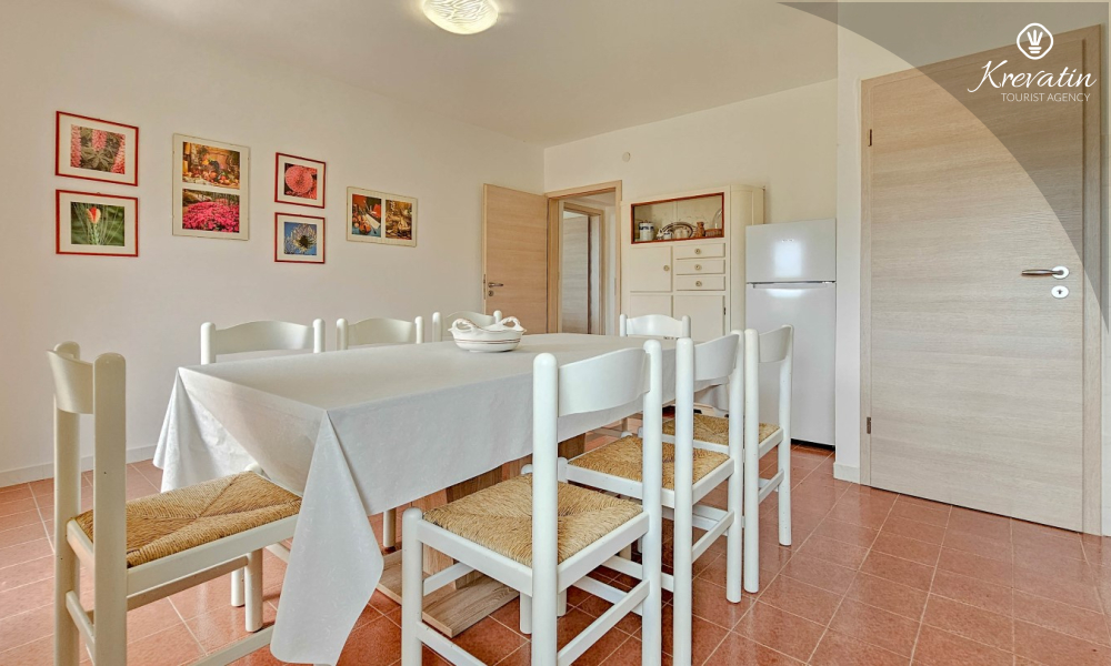 Die Wohnung verfügt über drei Schlafzimmer – zwei mit Doppelbett und eines mit Einzelbett –, während zwei weitere Personen im geräumigen Wohnzimmer übernachten können. Den Gästen stehen zwei Badezimmer zur Verfügung, eines mit Badewanne und Waschmaschine, das andere mit Dusche. Die Küche mit Essbereich ist mit den wichtigsten Utensilien für die Zubereitung von Mahlzeiten ausgestattet. Vom Wohnzimmer aus gelangt man auf eine Terrasse – der perfekte Ort für den Morgenkaffee oder gesellige Abende.