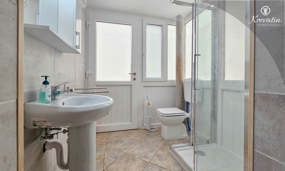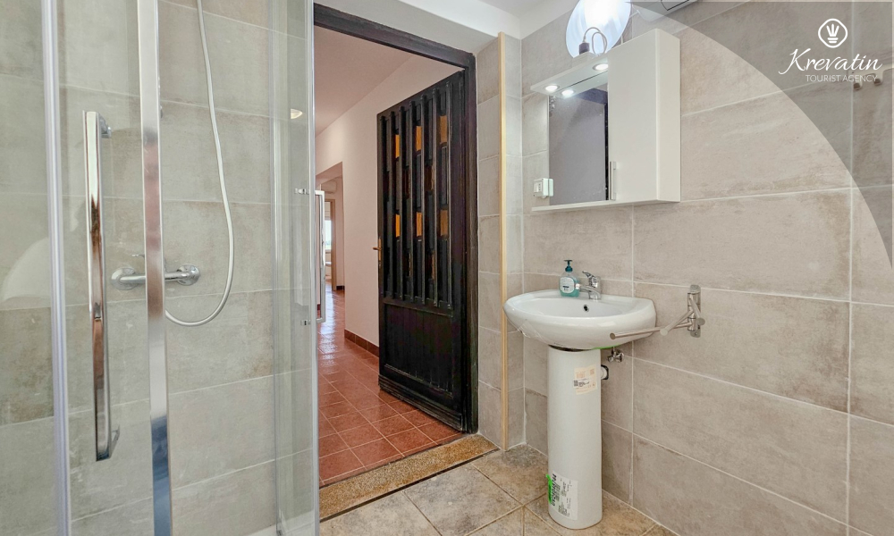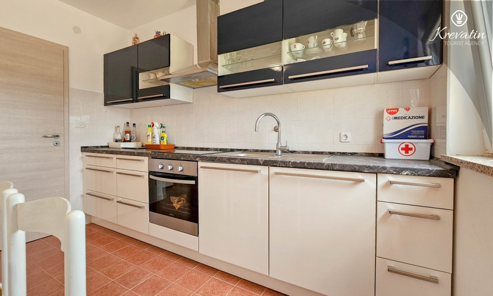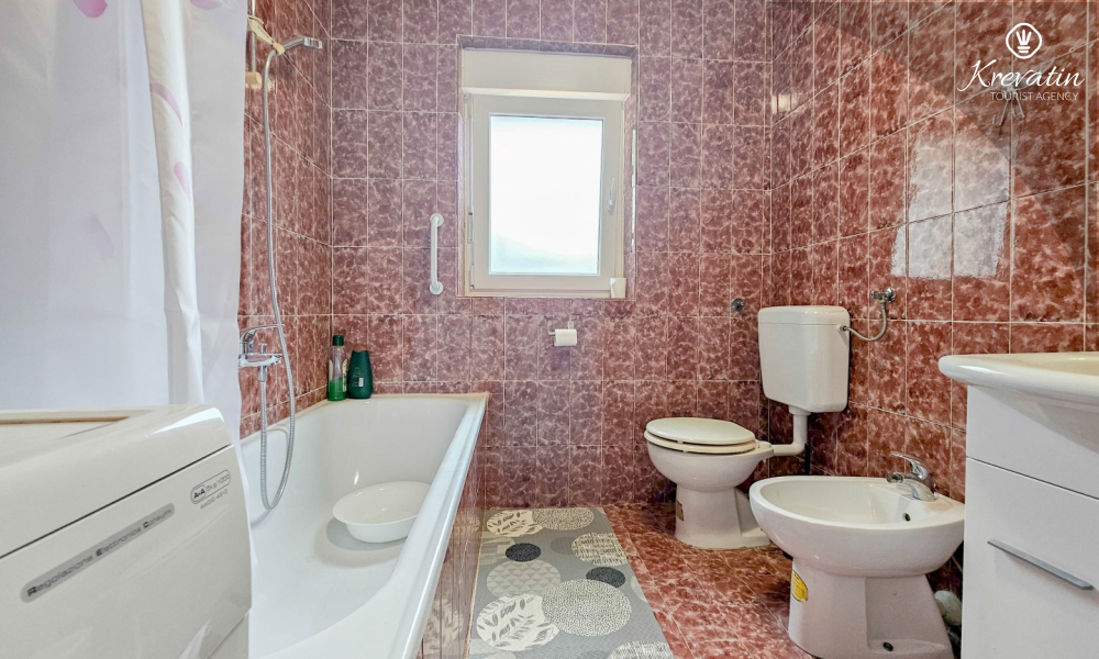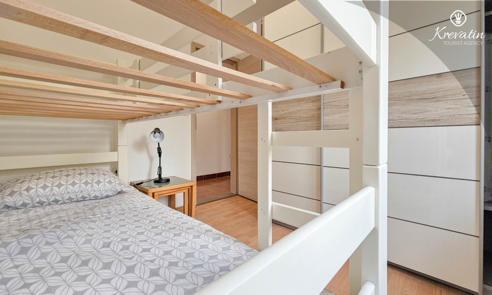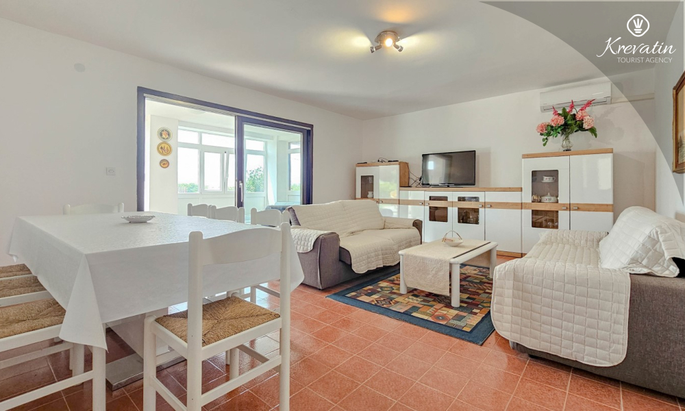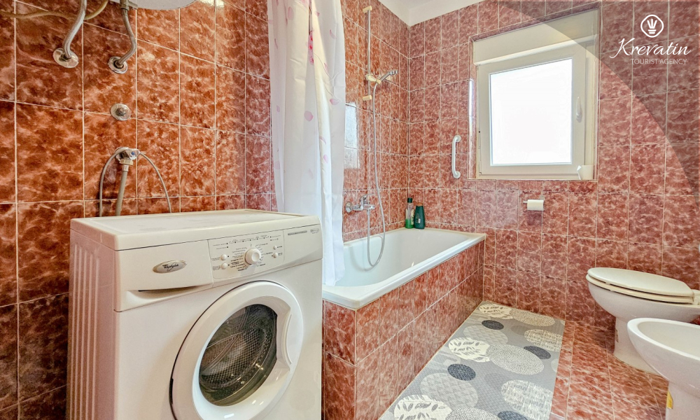 Die Wohnung verfügt über drei Schlafzimmer – zwei mit Doppelbett und eines mit Einzelbett –, während zwei weitere Personen im geräumigen Wohnzimmer übernachten können. Den Gästen stehen zwei Badezimmer zur Verfügung, eines mit Badewanne und Waschmaschine, das andere mit Dusche. Die Küche mit Essbereich ist mit den wichtigsten Utensilien für die Zubereitung von Mahlzeiten ausgestattet. Vom Wohnzimmer aus gelangt man auf eine Terrasse – der perfekte Ort für den Morgenkaffee oder gesellige Abende.