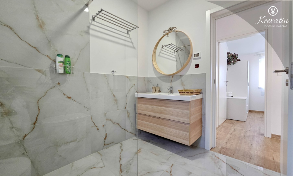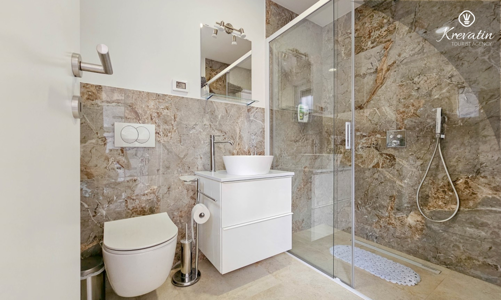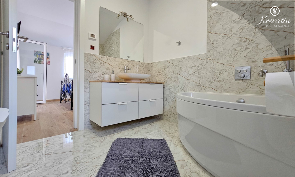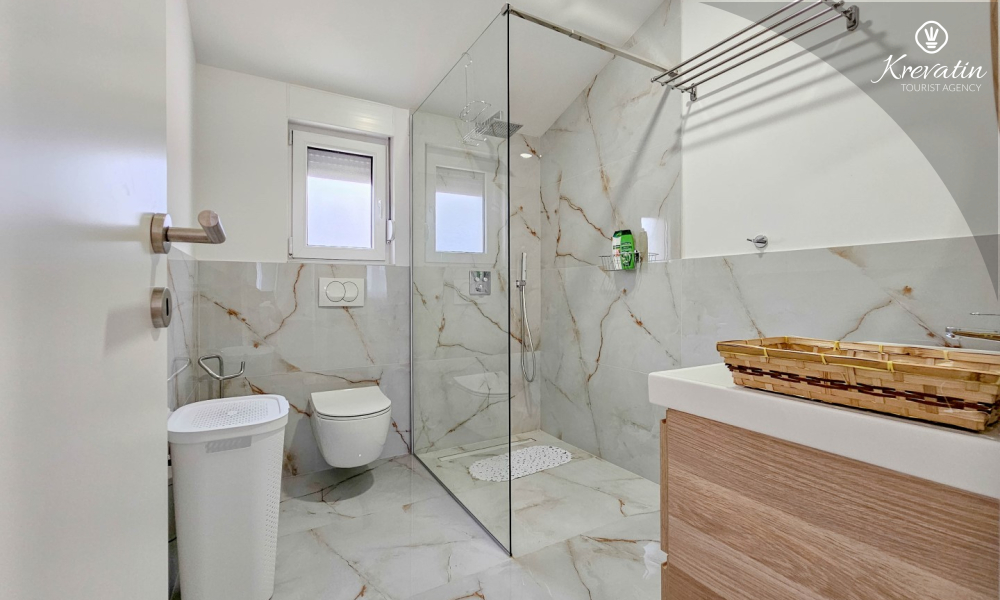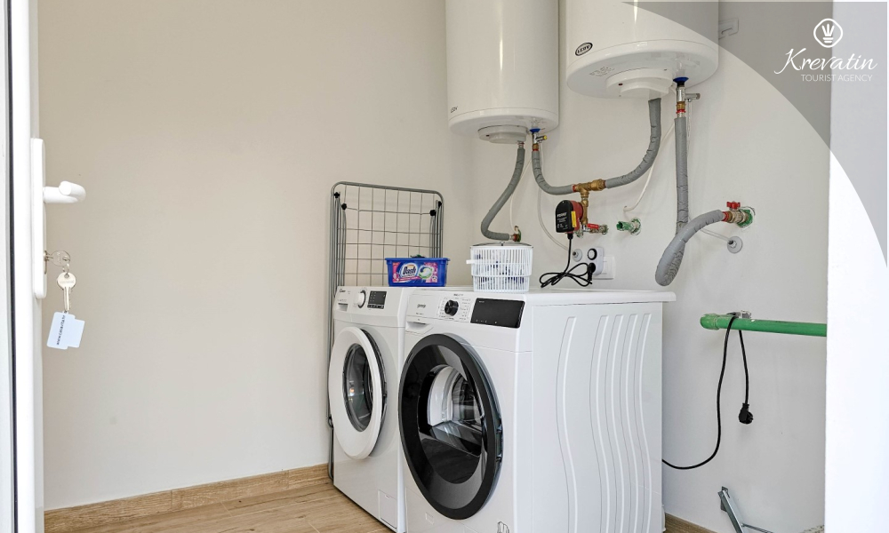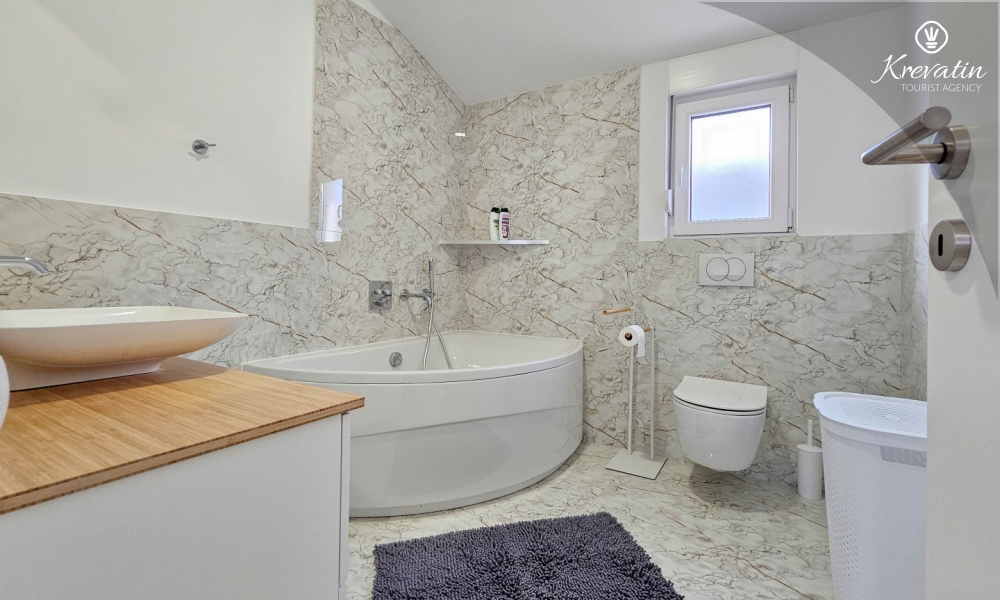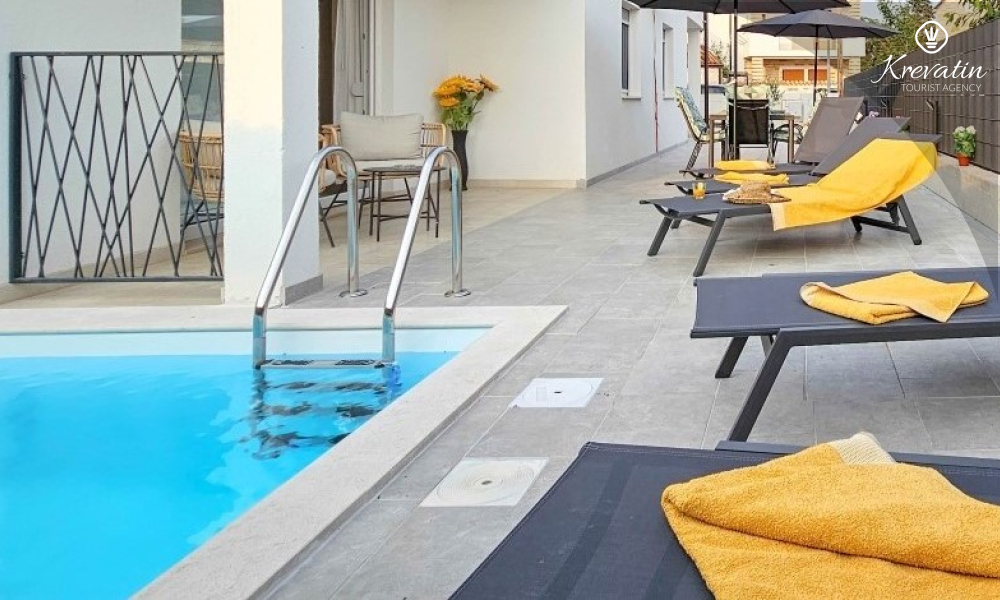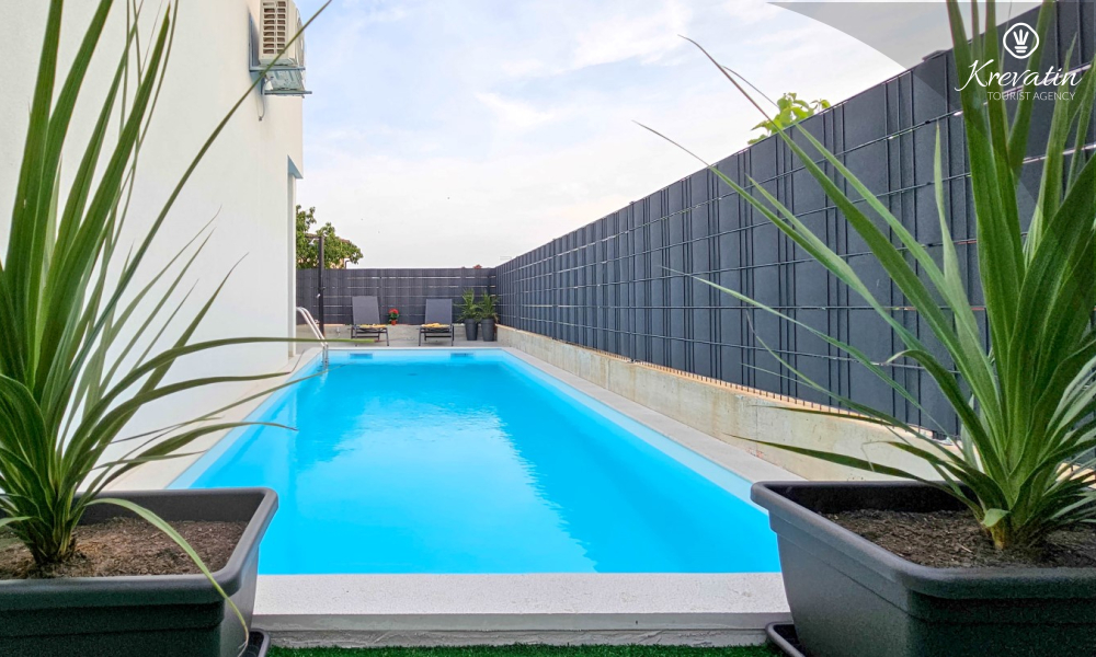 Im Erdgeschoss befinden sich eine modern eingerichtete Küche, ein großzügiges und gemütliches Wohnzimmer sowie ein Badezimmer. Die Villa bietet drei elegante Schlafzimmer, jeweils mit eigenem Bad, und einen geräumigen Balkon für den morgendlichen Kaffee mit Blick in die Natur. Auf der umzäunten Terrasse erwarten Sie ein beheizter Pool mit Liegestühlen und ein Esstisch. Parkplätze stehen im Innenhof zur Verfügung, Haustiere sind gegen Aufpreis willkommen.