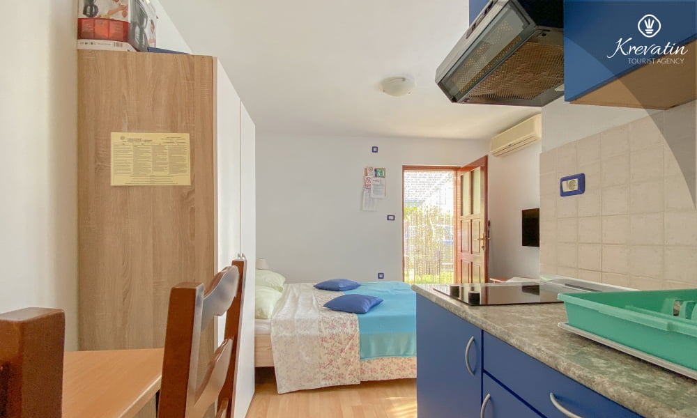 Das Apartment verfügt über ein Schlafzimmer mit Doppelbett und eine Küche mit allem, was Sie für die Zubereitung einfacher Mahlzeiten benötigen. Es gibt auch ein praktisches Badezimmer mit Dusche und WC. Entspannen Sie auf der Terrasse mit Tisch und Stühlen – ideal für ein Leben im Freien.