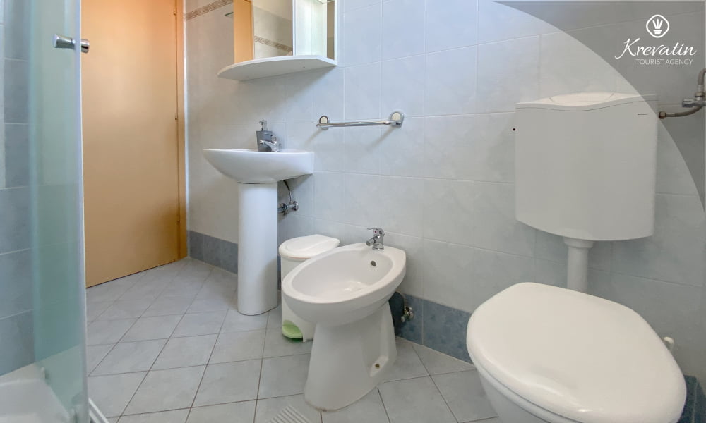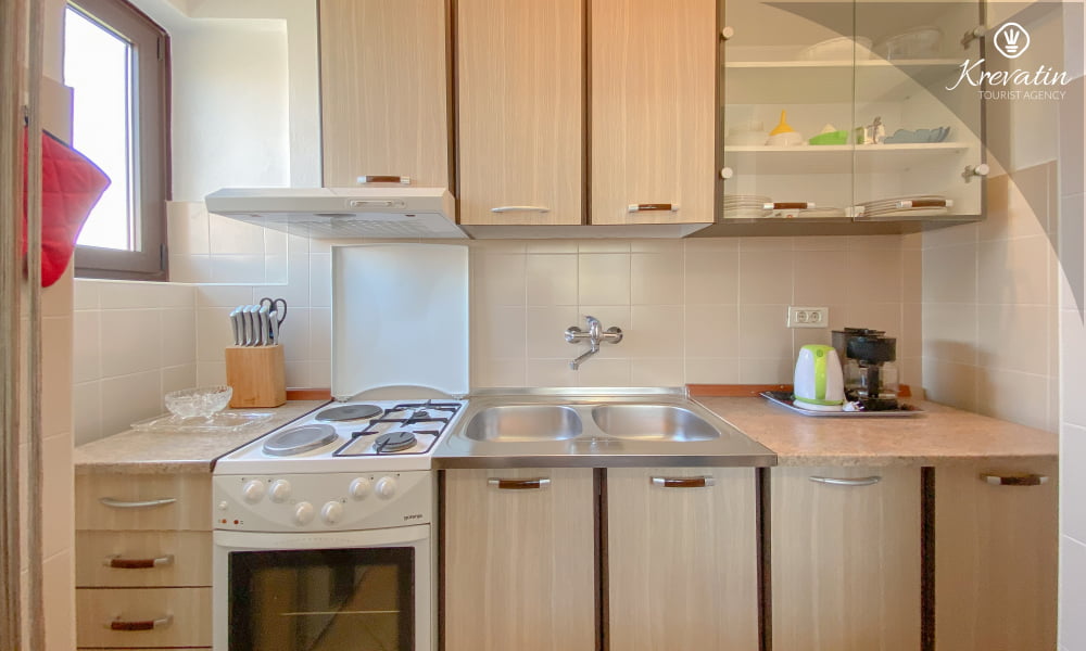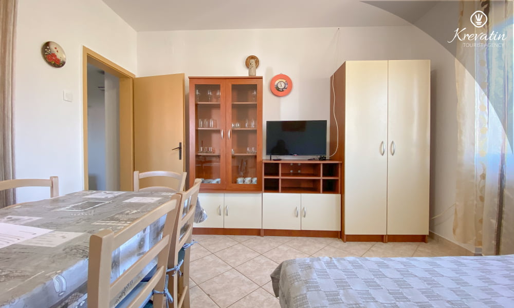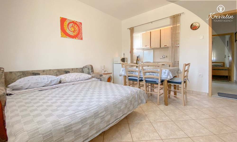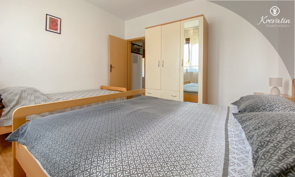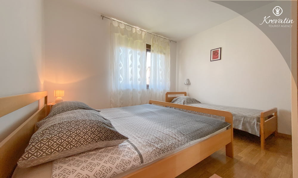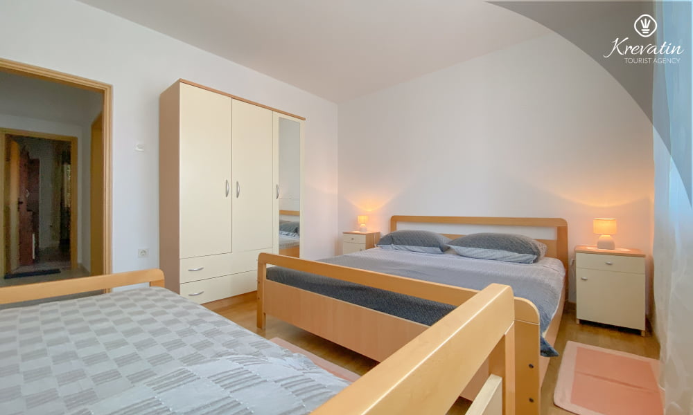 Die Wohnung besteht aus einem Schlafzimmer mit einem Doppelbett und einem zusätzlichen Einzelbett, einem Wohnzimmer mit einer Schlafcouch für zwei weitere Personen und einer Küche mit Grundausstattung. Außerdem gibt es ein Badezimmer mit Dusche und WC sowie einen Balkon mit Gartenmöbeln – ideal zum Entspannen im Freien.