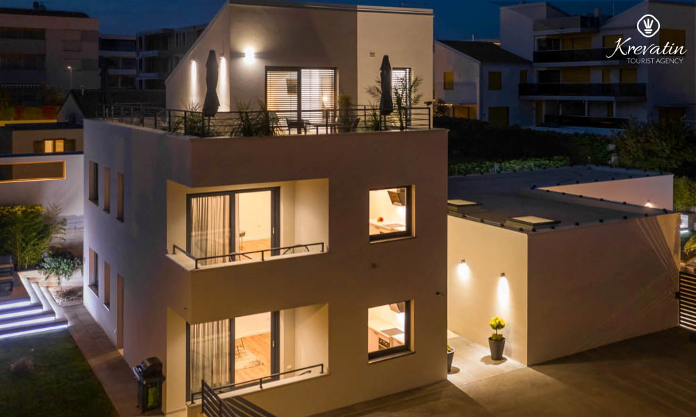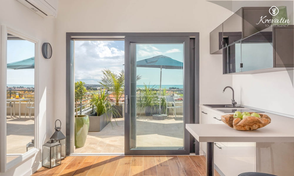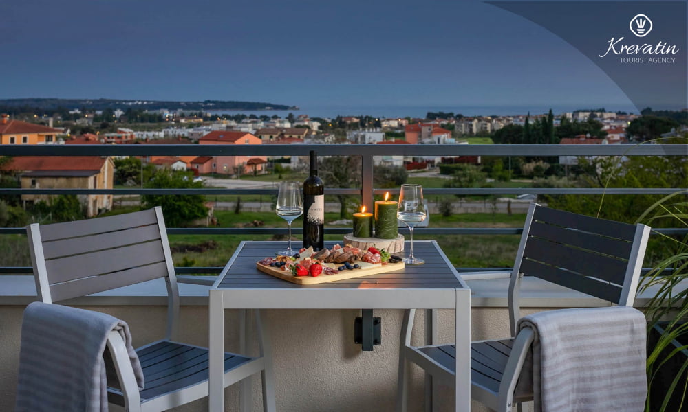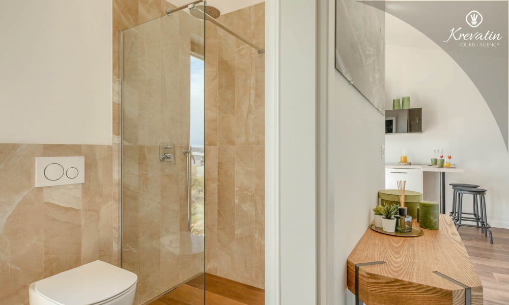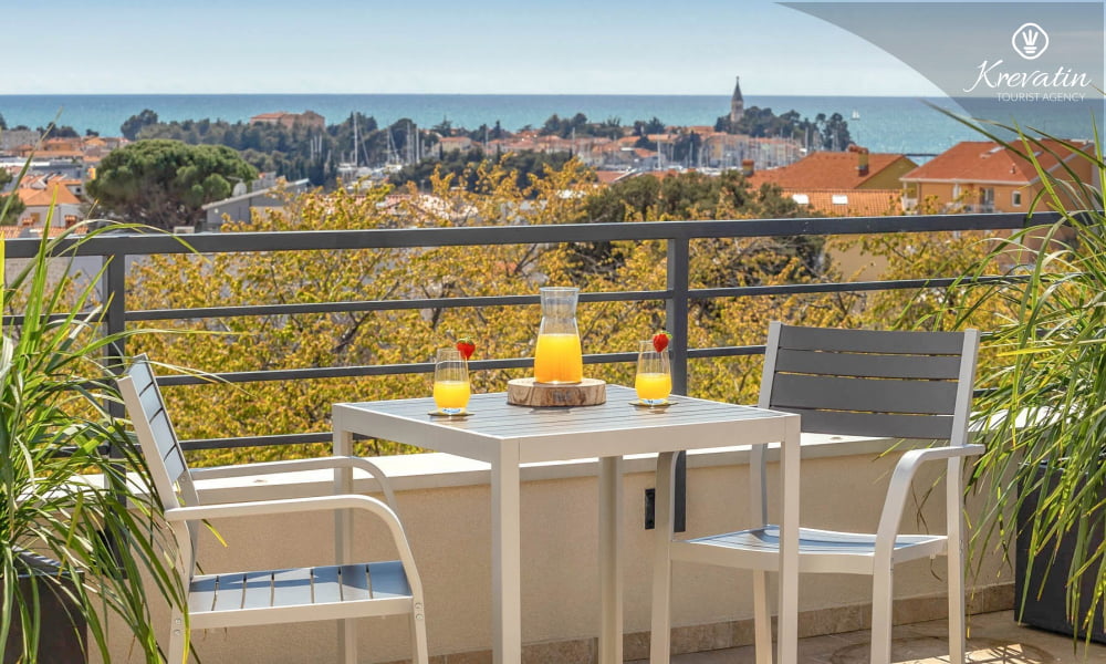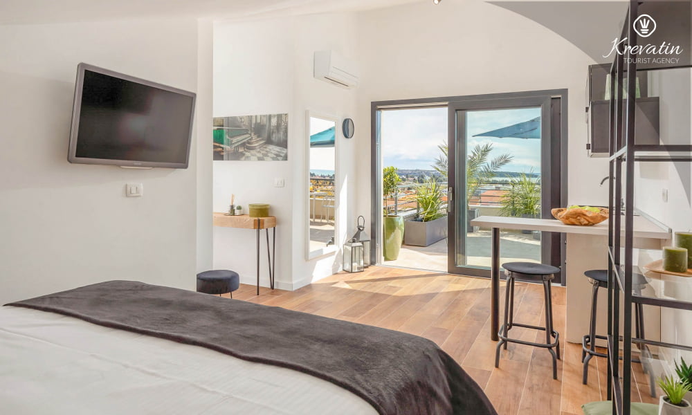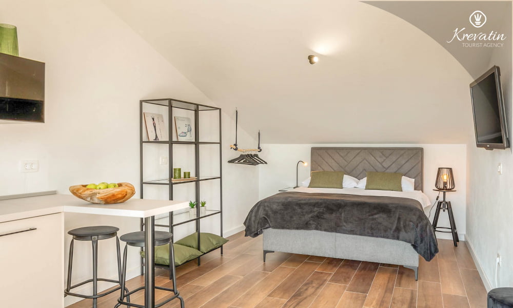 Dieses moderne und neue Studio-Apartment für bis zu 2 Personen befindet sich im zweiten Stock und besteht aus einem Schlafzimmer und einer Küche. Die Küche ist mit Elektroherd, Kühlschrank und Kaffeemaschine ausgestattet. Darüber hinaus gibt es ein Badezimmer mit Dusche und WC und einen schönen Balkon mit herrlichem Blick auf das gesamte Novigrad und das Meer. SAT-TV, Klimaanlage, WLAN, Bettwäsche und Handtücher sind im Preis inbegriffen, Haustiere sind nicht gestattet.