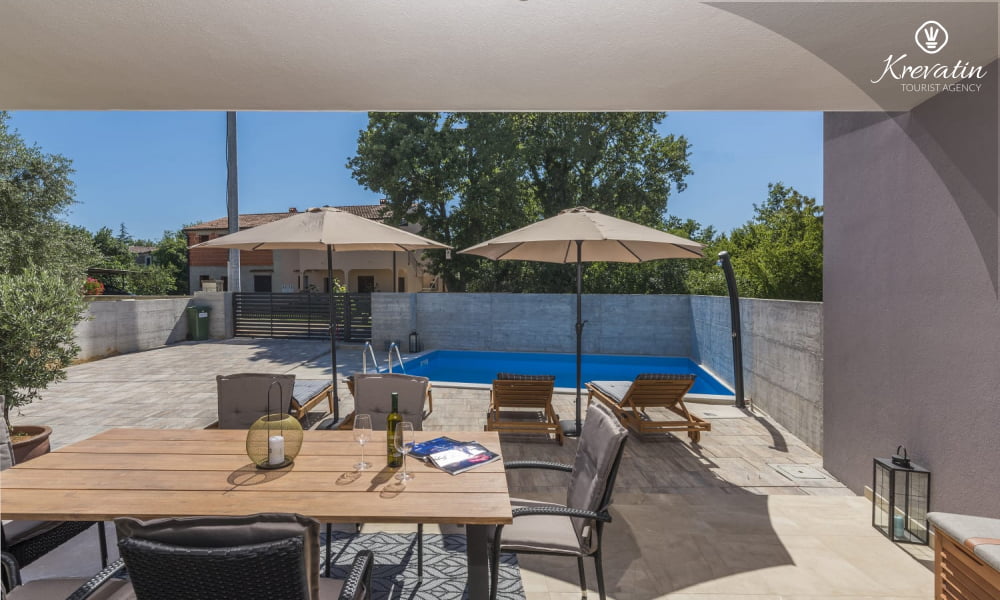von einem Schlafzimmer, das zweite hat Dusche und Toilette und das dritte hat nur Toilette. Die Villa verfügt über eine geräumige Terrasse mit Grill, einen schönen Garten und einen privaten Pool. Private