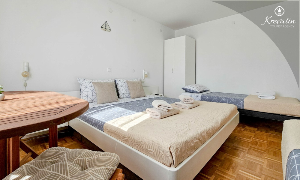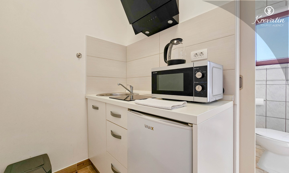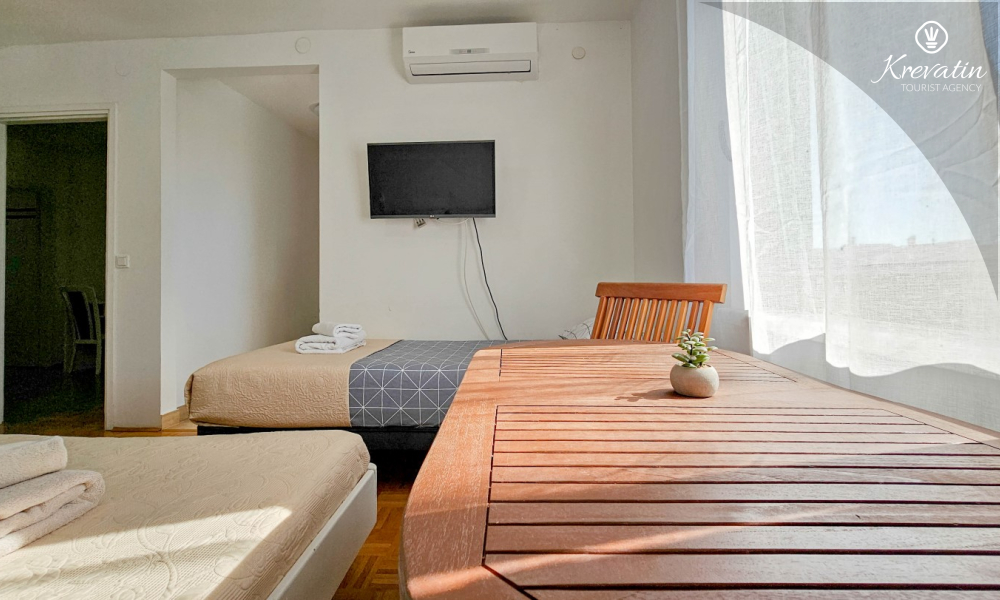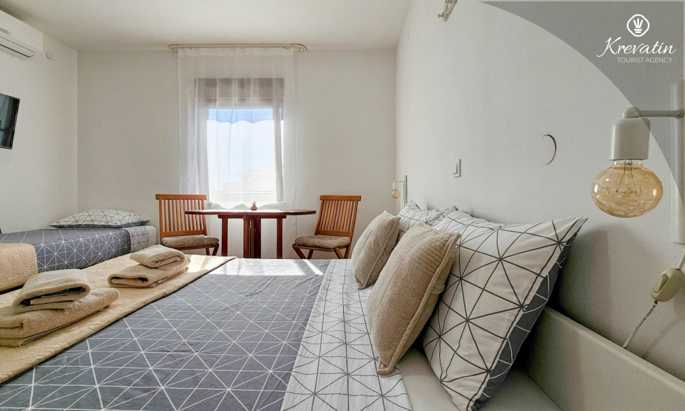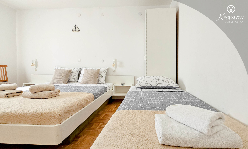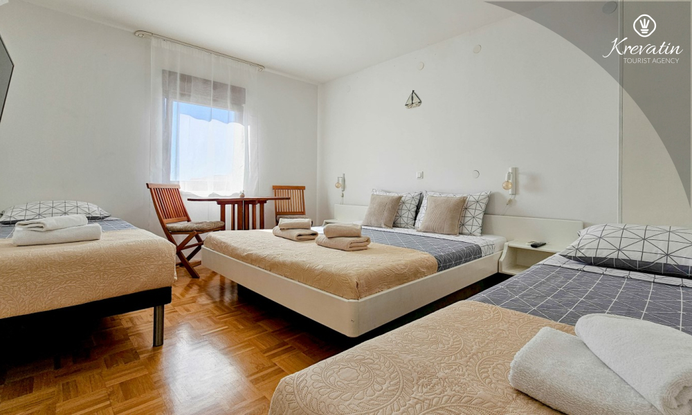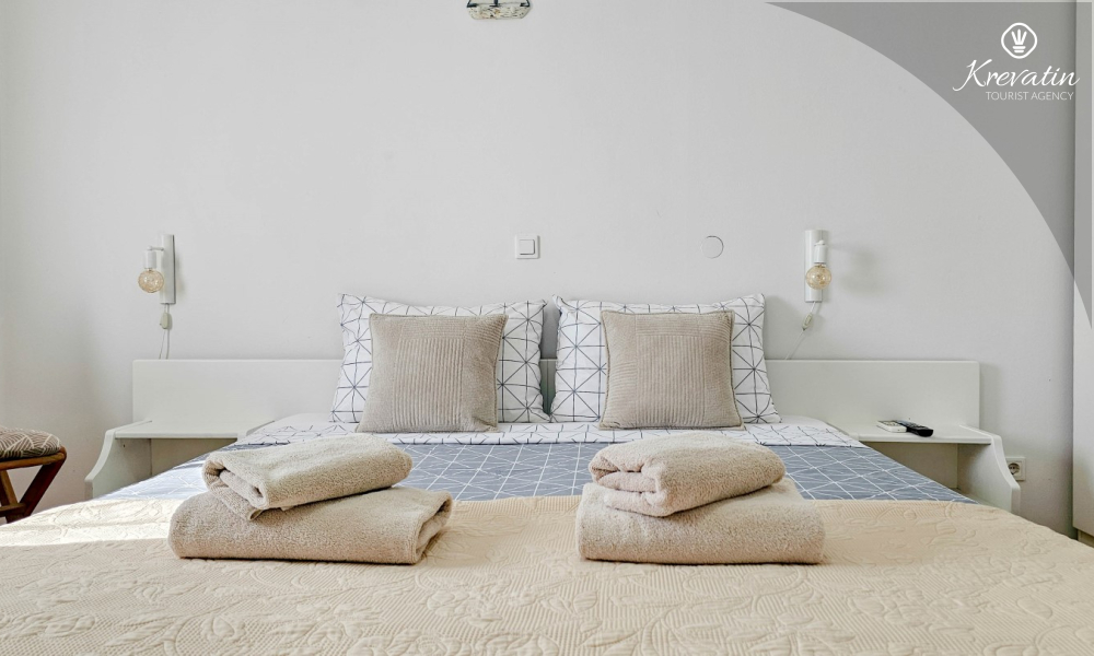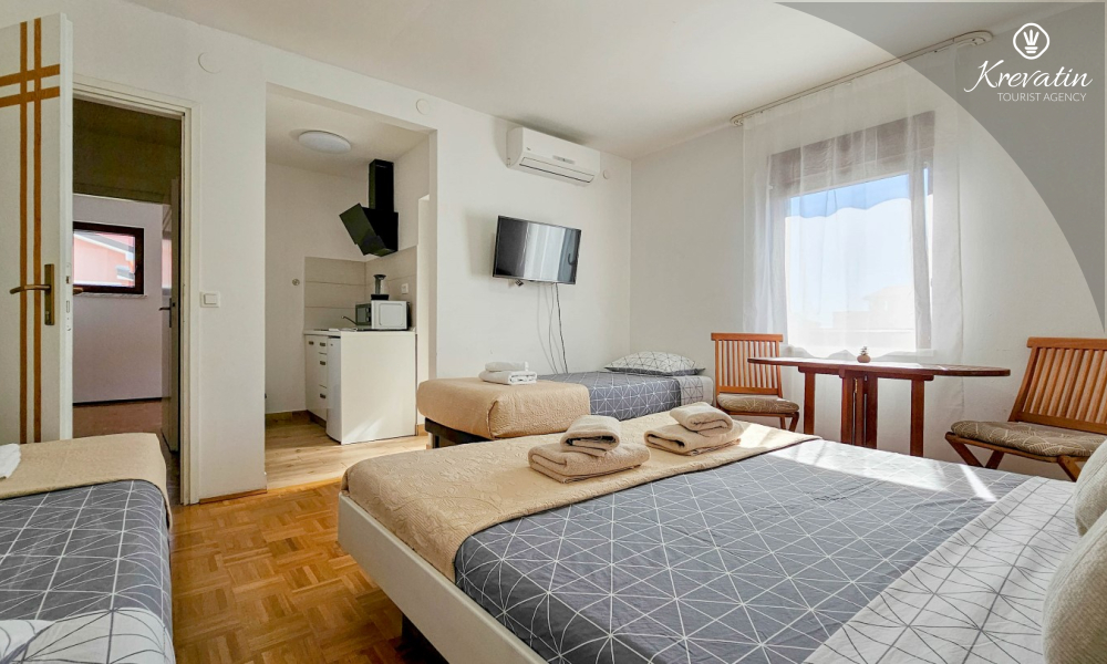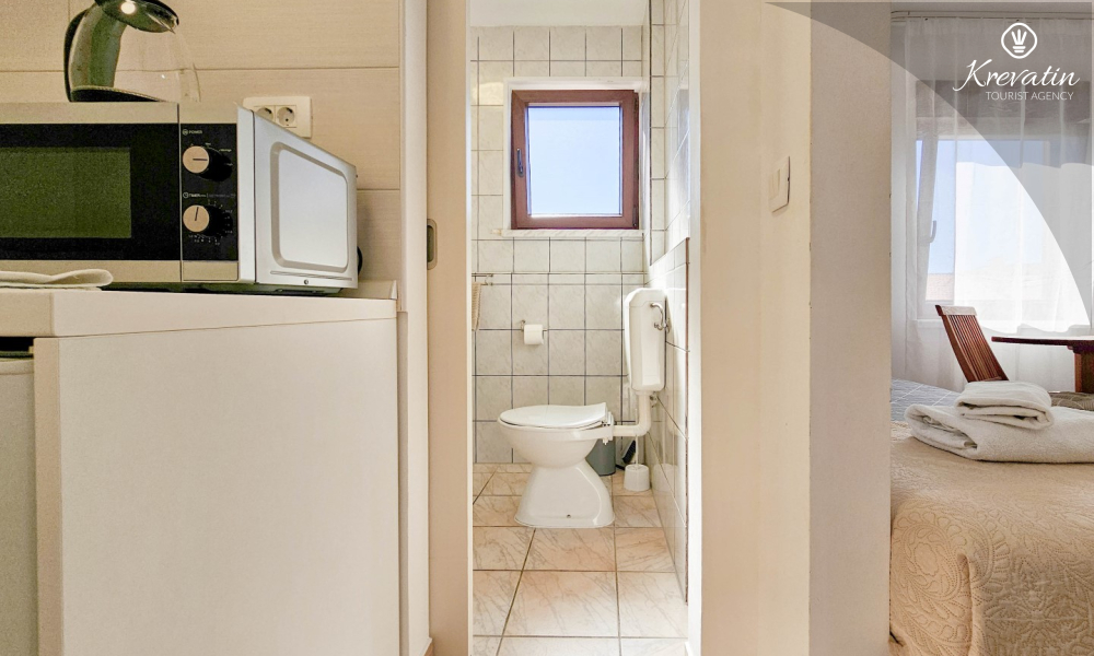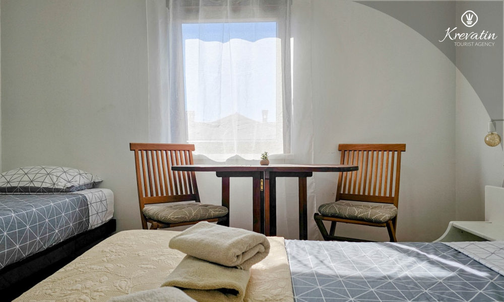 Das Zimmer verfügt über ein Doppelbett, ein Zustellbett und eine kleine, mit dem Nötigsten ausgestattete Küche zur Zubereitung einfacher Mahlzeiten. Das Badezimmer mit Dusche und WC befindet sich im Zimmer. Im Haus stehen den Gästen ein Gemeinschaftspool, eine Terrasse mit Sommerküche und Grill sowie eine Waschmaschine im Gemeinschaftsbereich zur Verfügung.