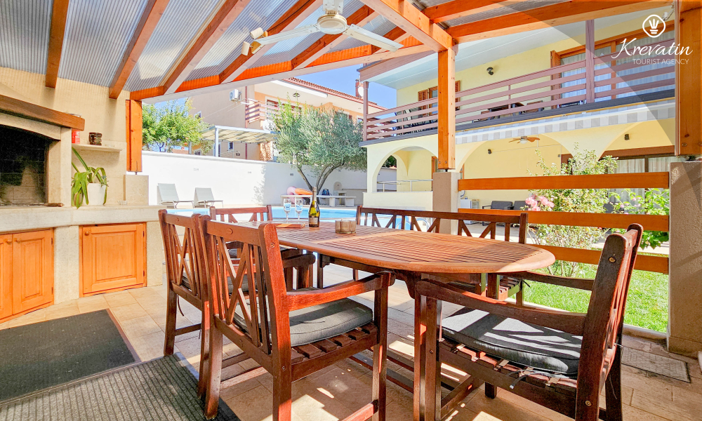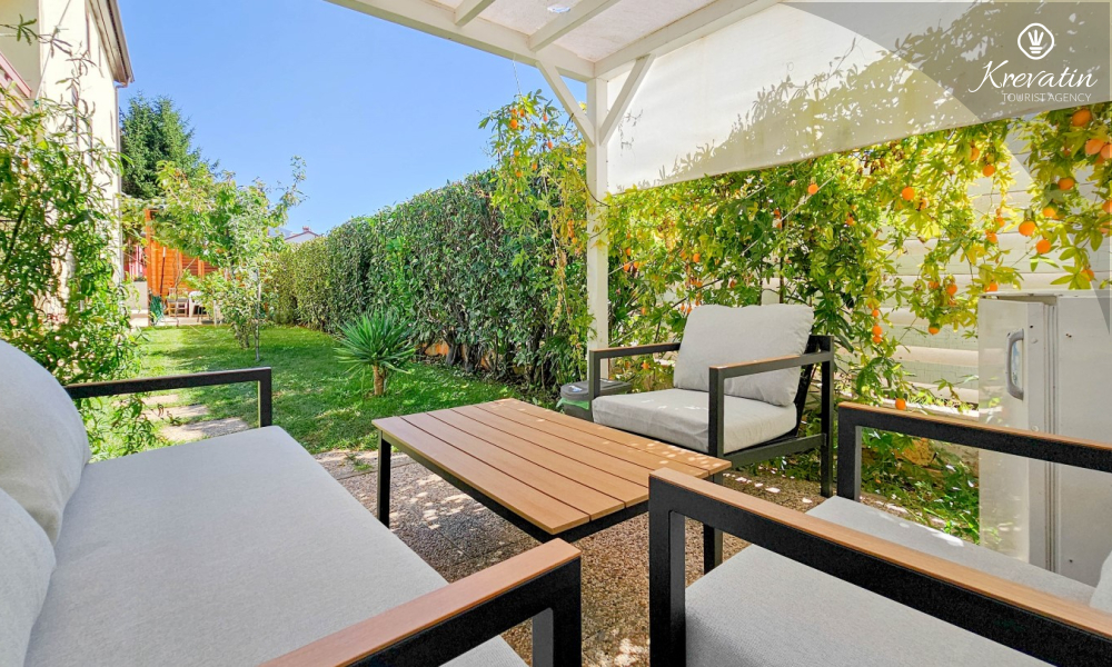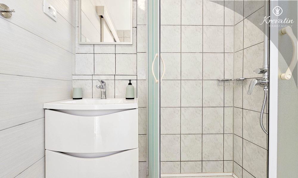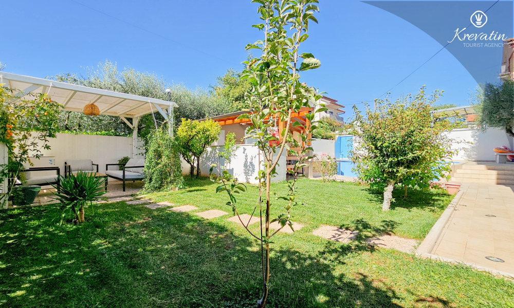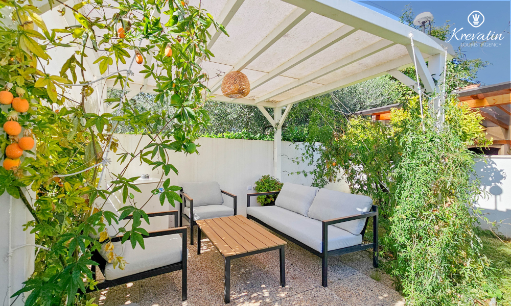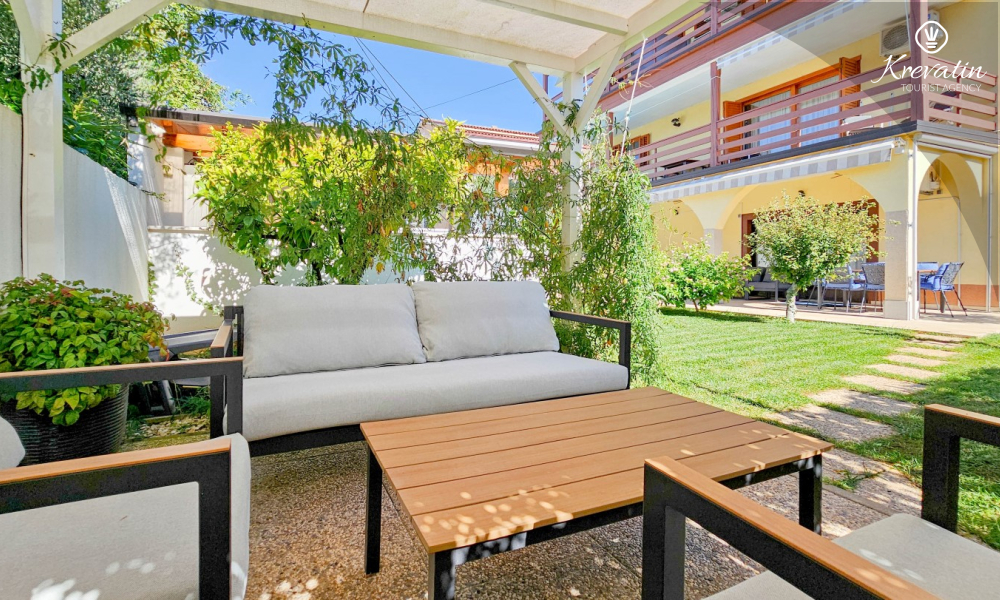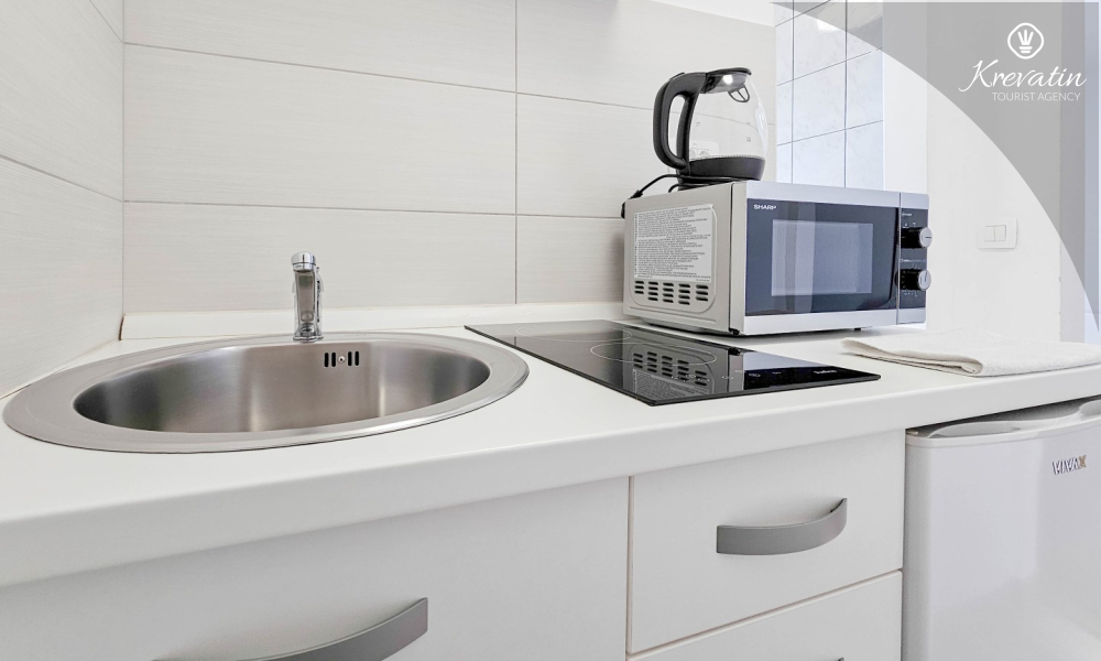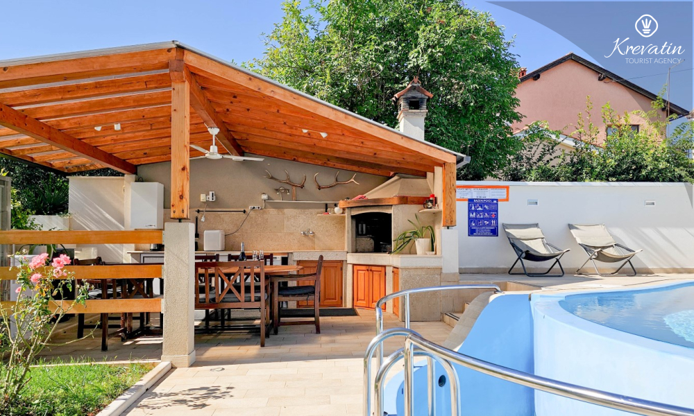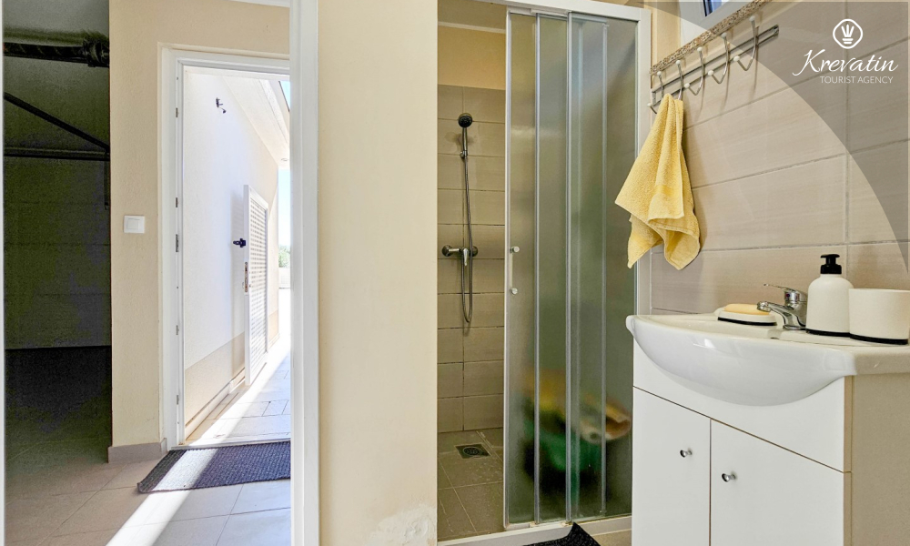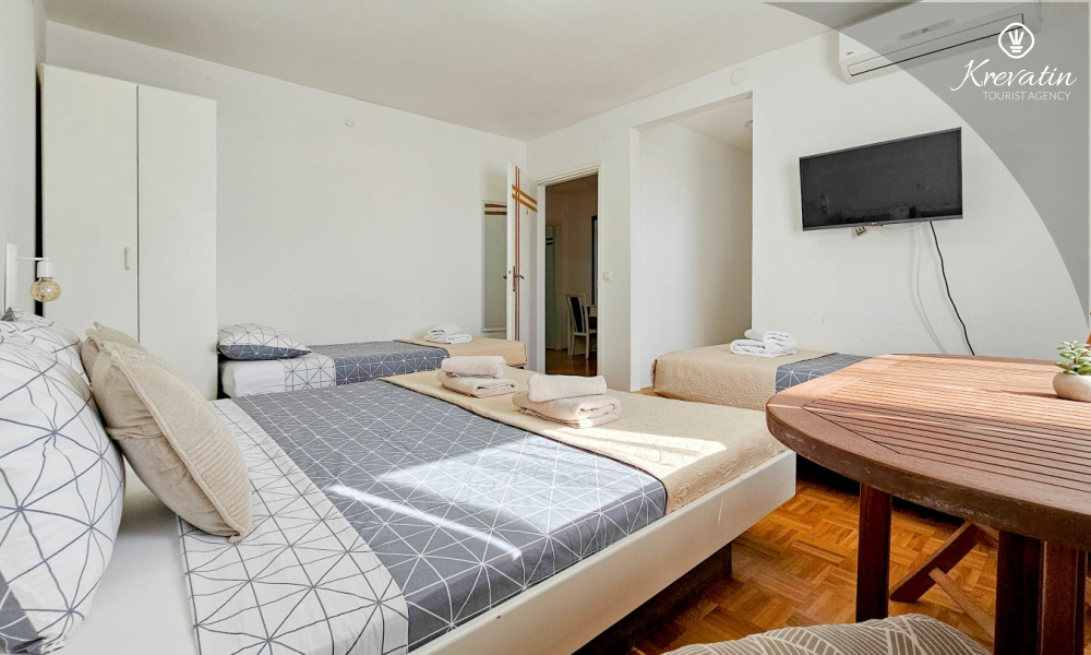 Das Zimmer verfügt über ein Doppelbett, ein Zustellbett und eine kleine, mit dem Nötigsten ausgestattete Küche zur Zubereitung einfacher Mahlzeiten. Das Badezimmer mit Dusche und WC befindet sich im Zimmer. Im Haus stehen den Gästen ein Gemeinschaftspool, eine Terrasse mit Sommerküche und Grill sowie eine Waschmaschine im Gemeinschaftsbereich zur Verfügung.